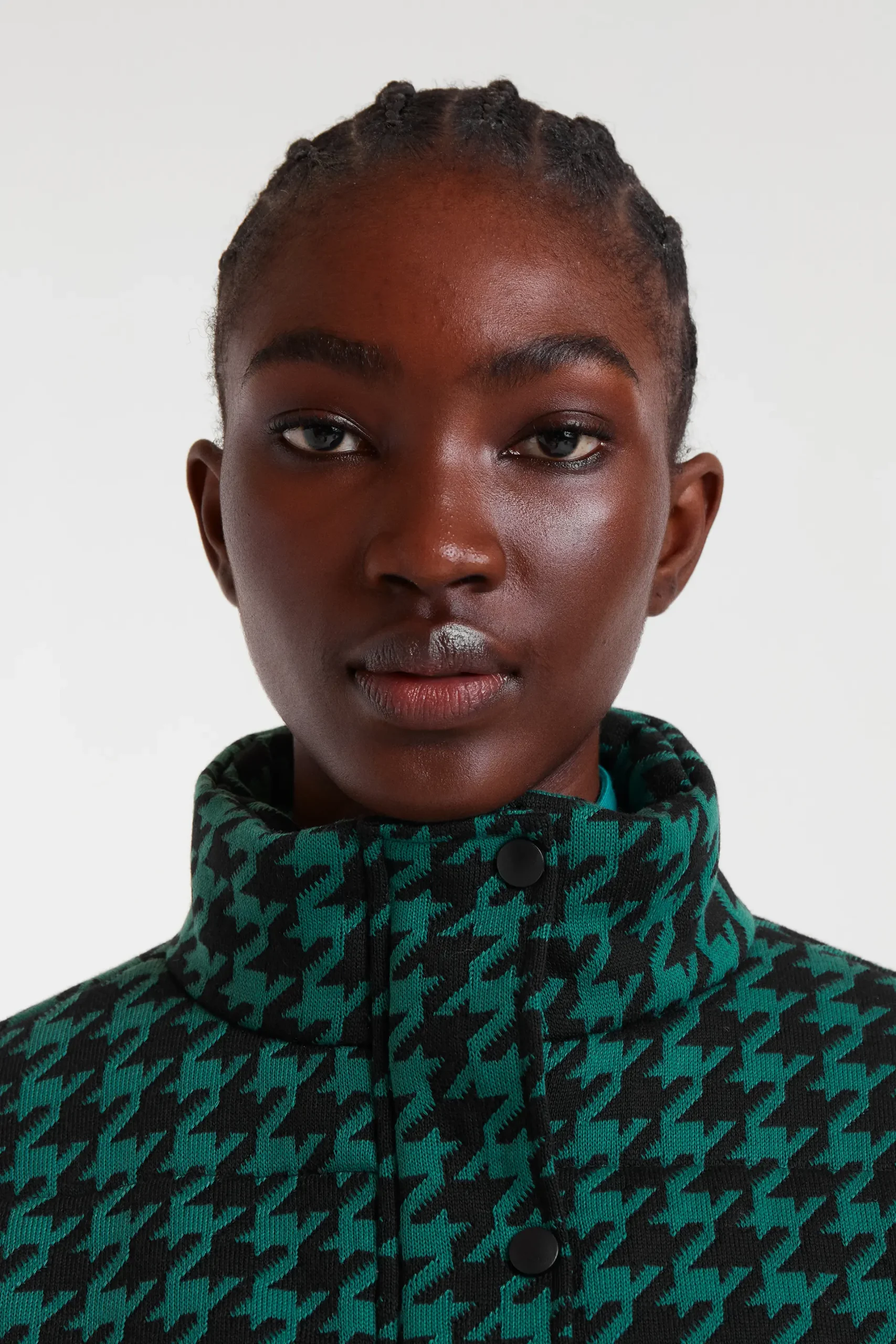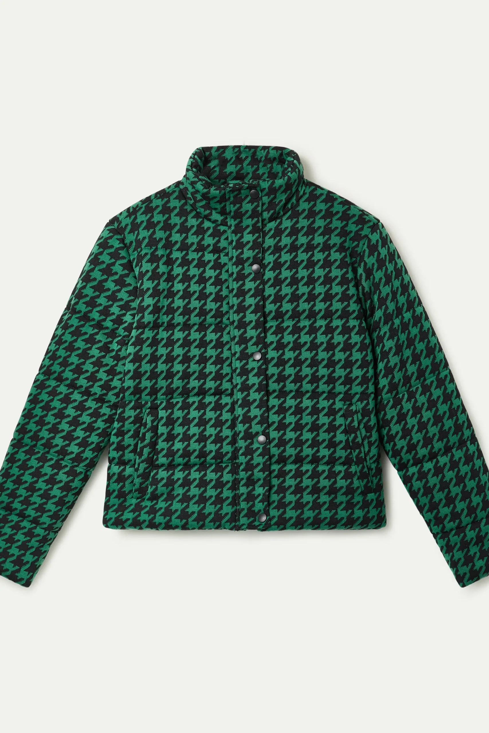 Abrigo de tejido acolchado con estampado de pata de gallo de color negro y verde. Con cuello alto y manga larga terminada en puño elástico. Cierre frontal con botones. Hombro ligeramente caído. Forro interior. La modelo mide 178 cm y lleva la talla S.