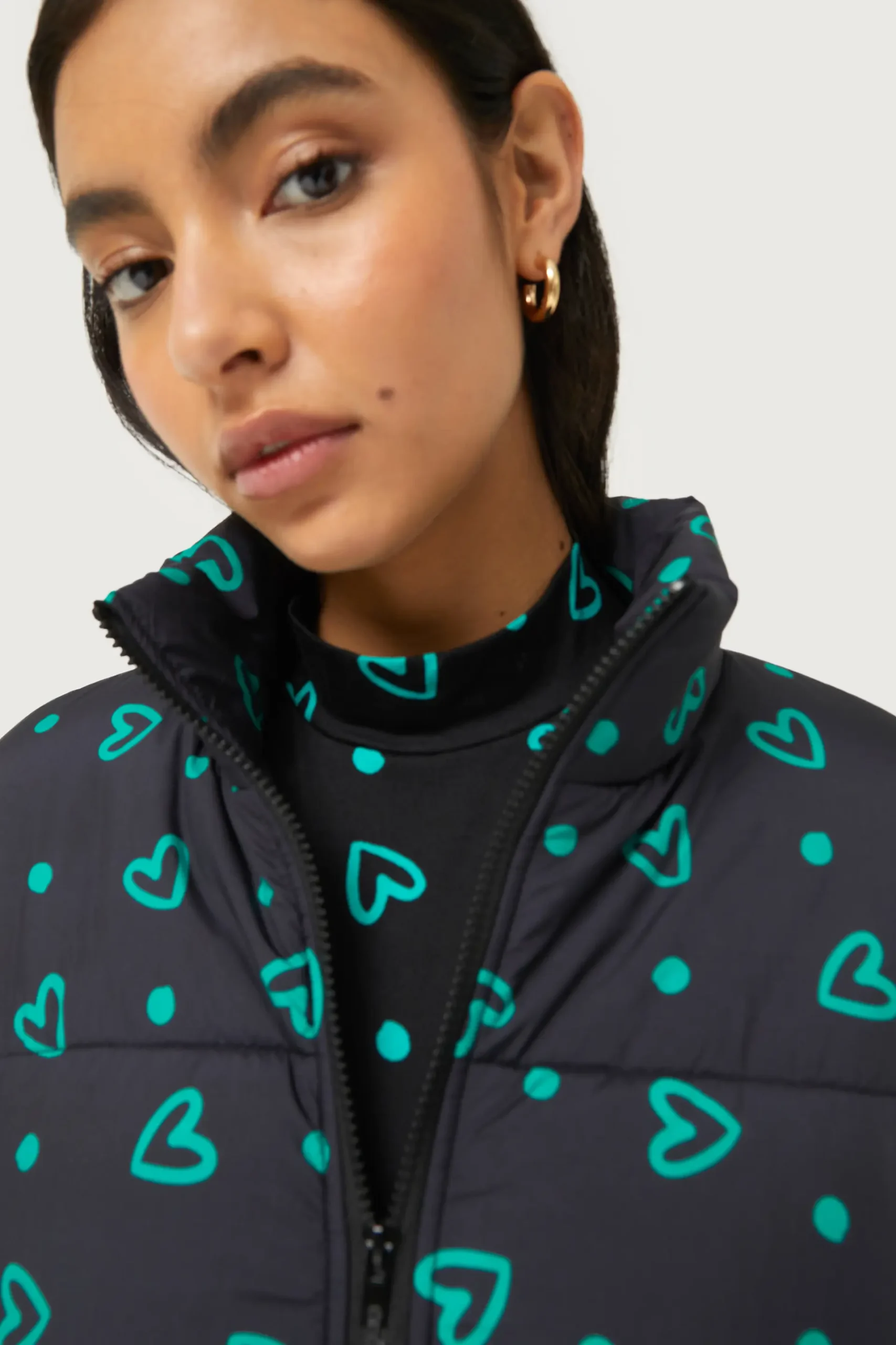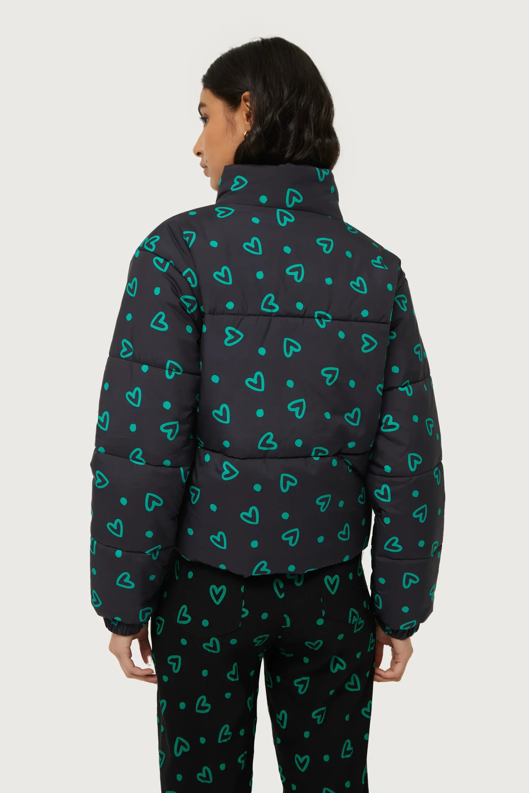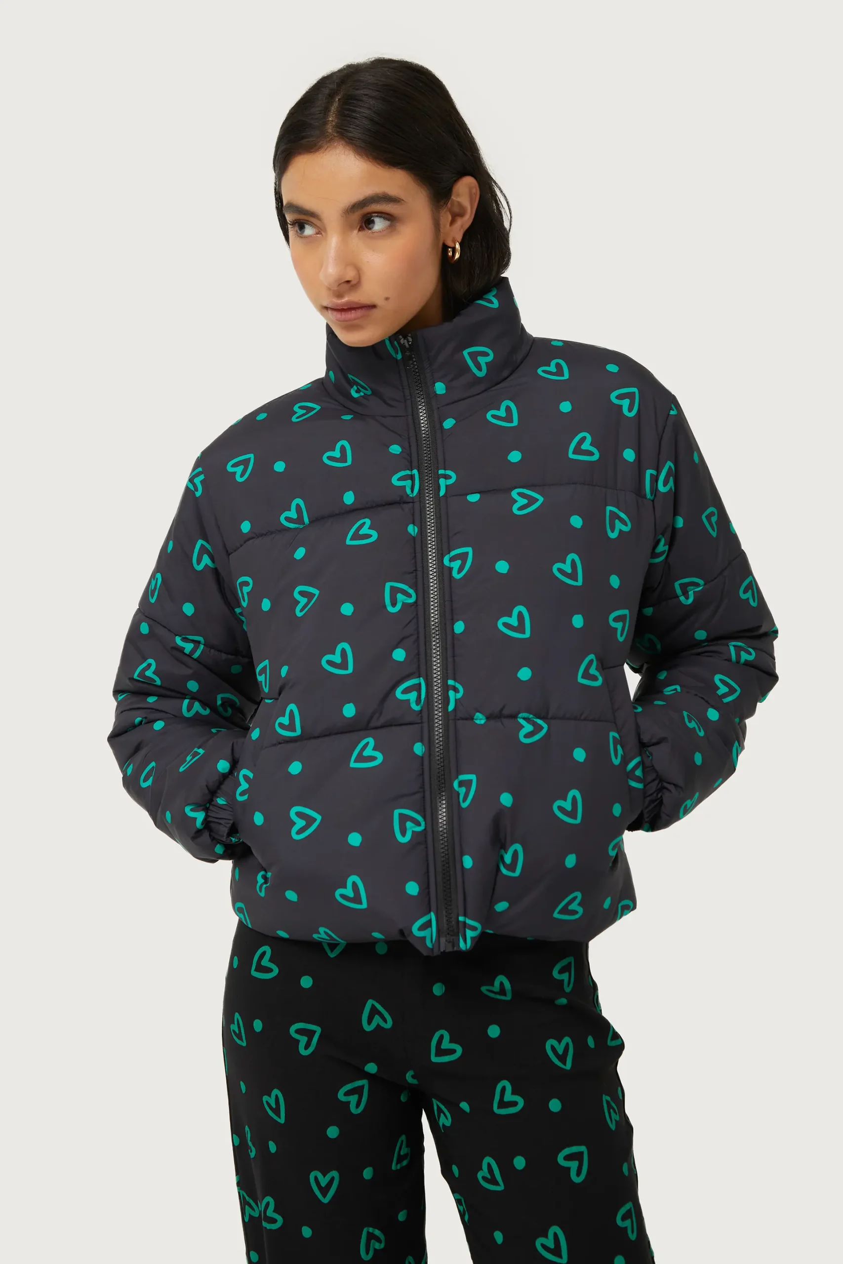 Abrigo acolchado de color negro con estampado de corazones verdes. Con cuello mock y manga larga. Cierre frontal de cremallera y bolsillos laterales. Forro interior. La modelo mide 176 cm y lleva la talla S.
