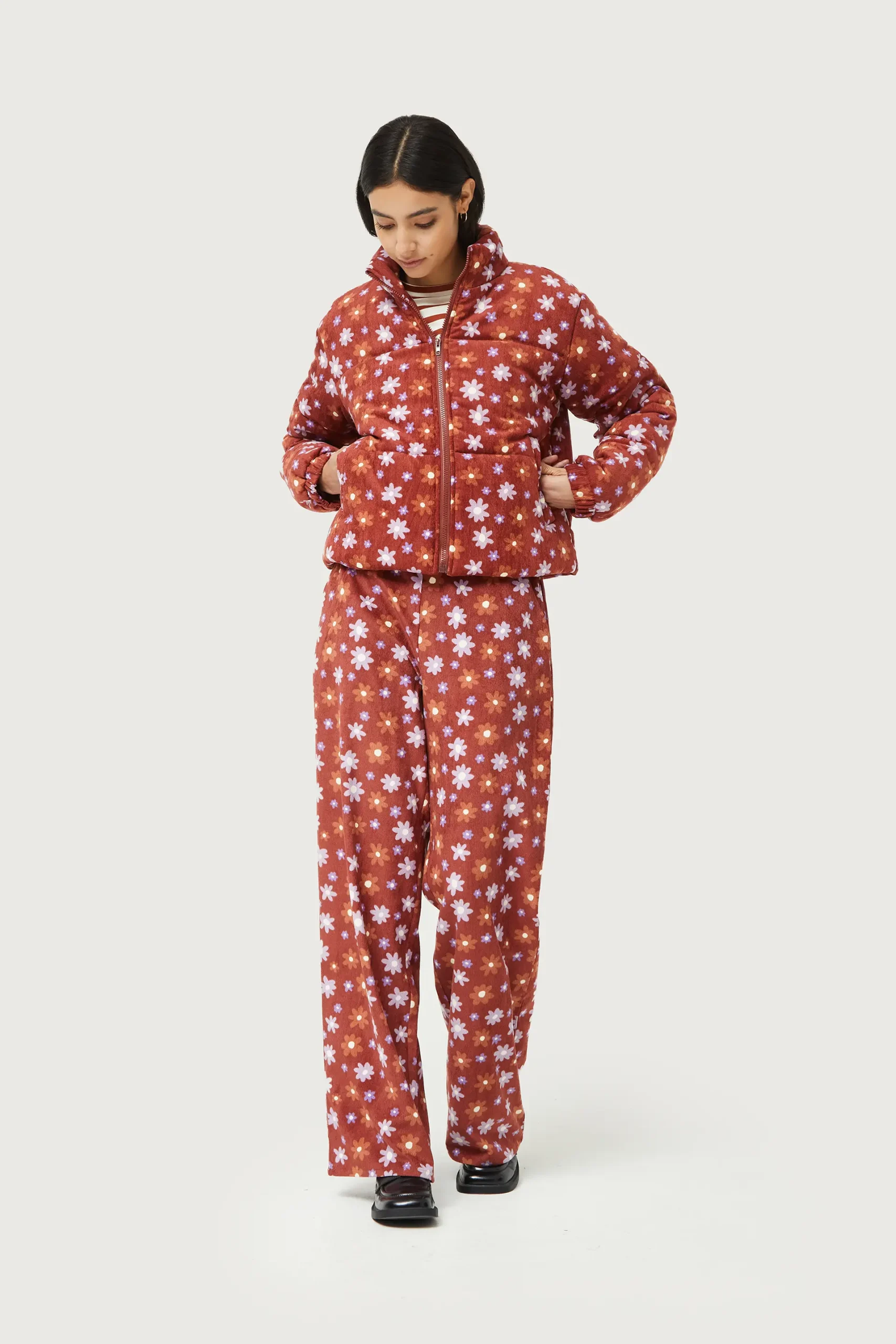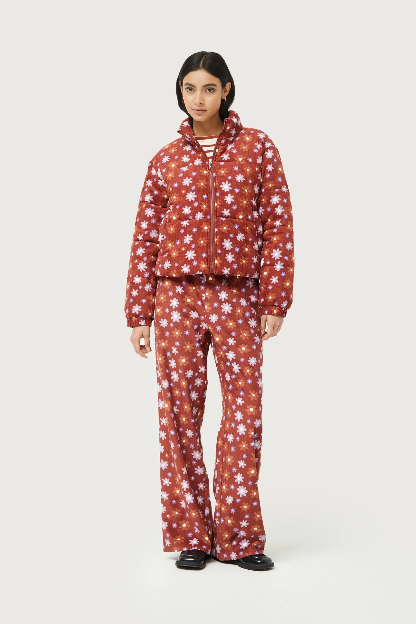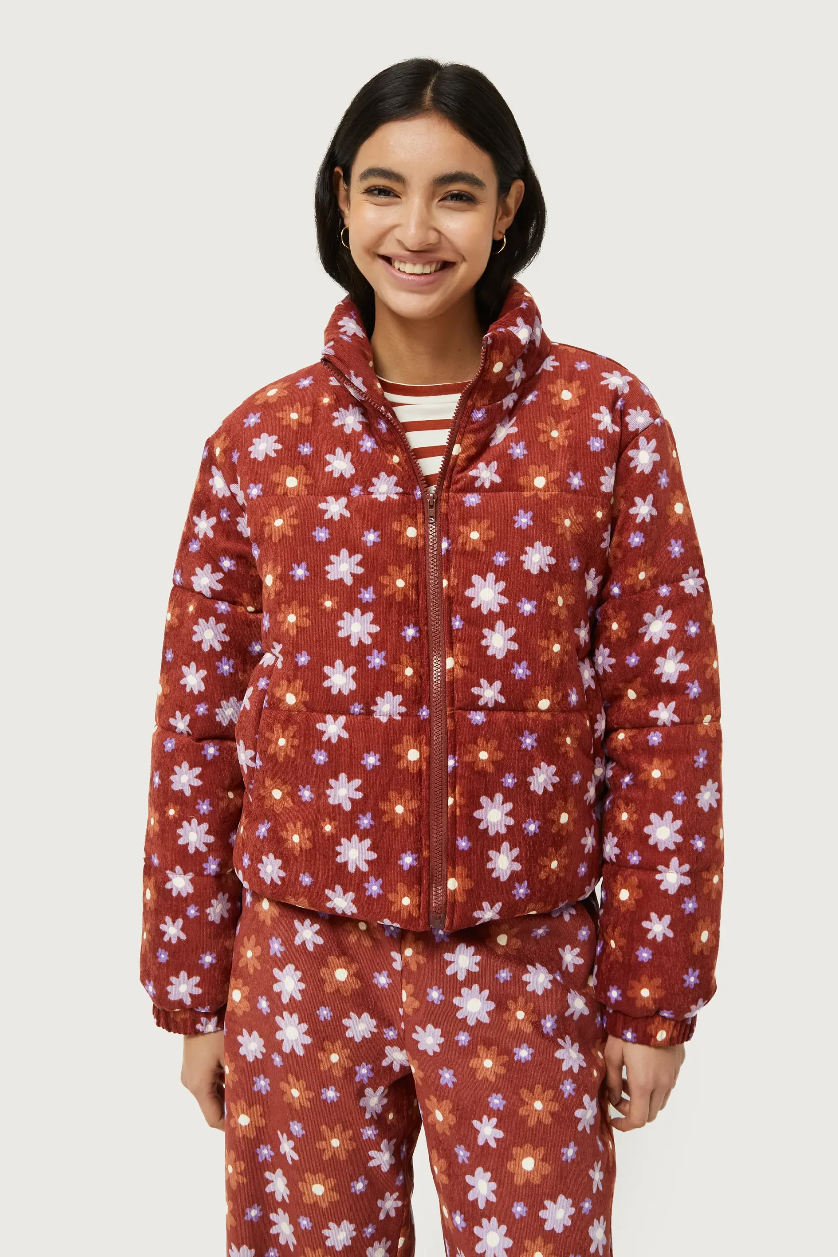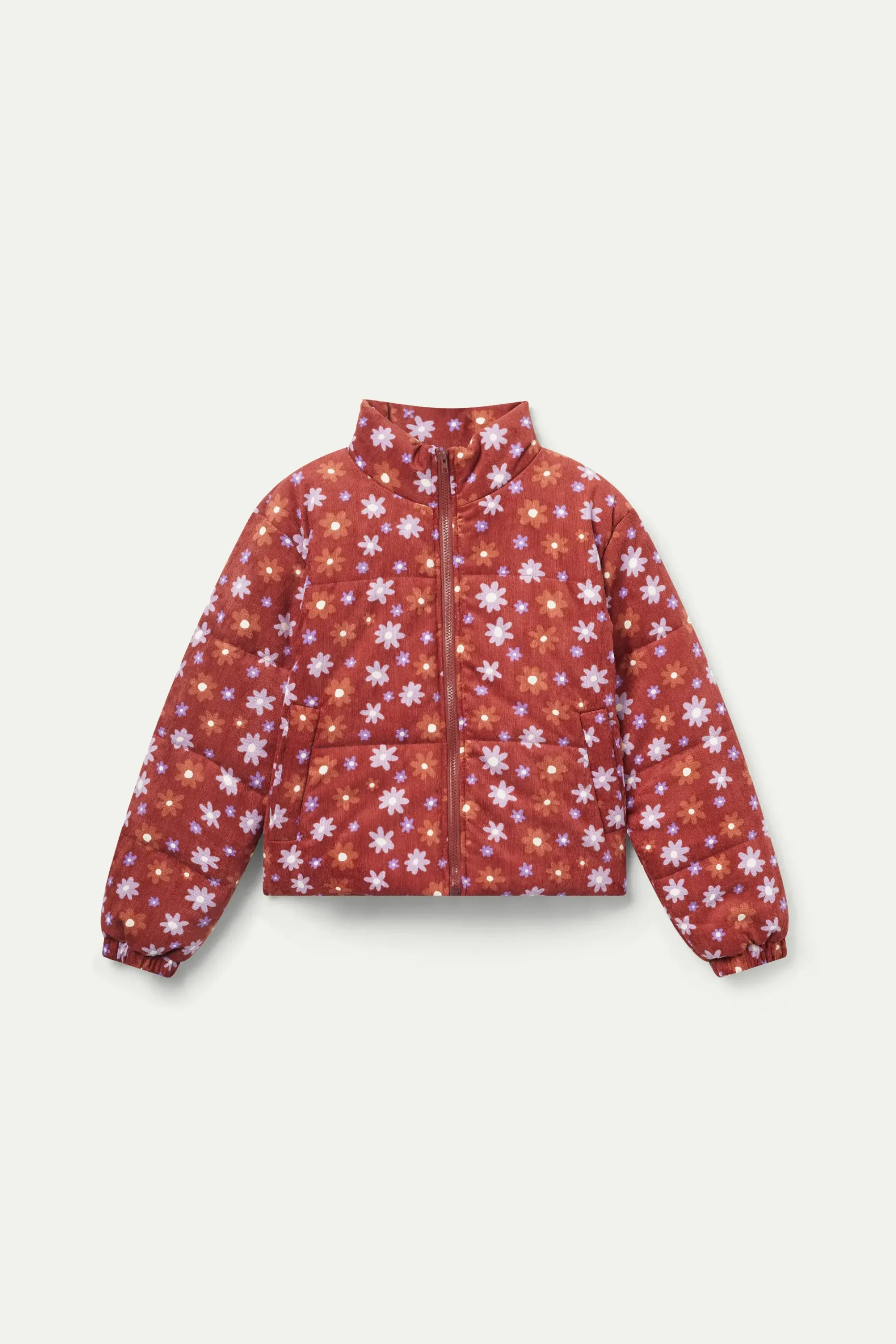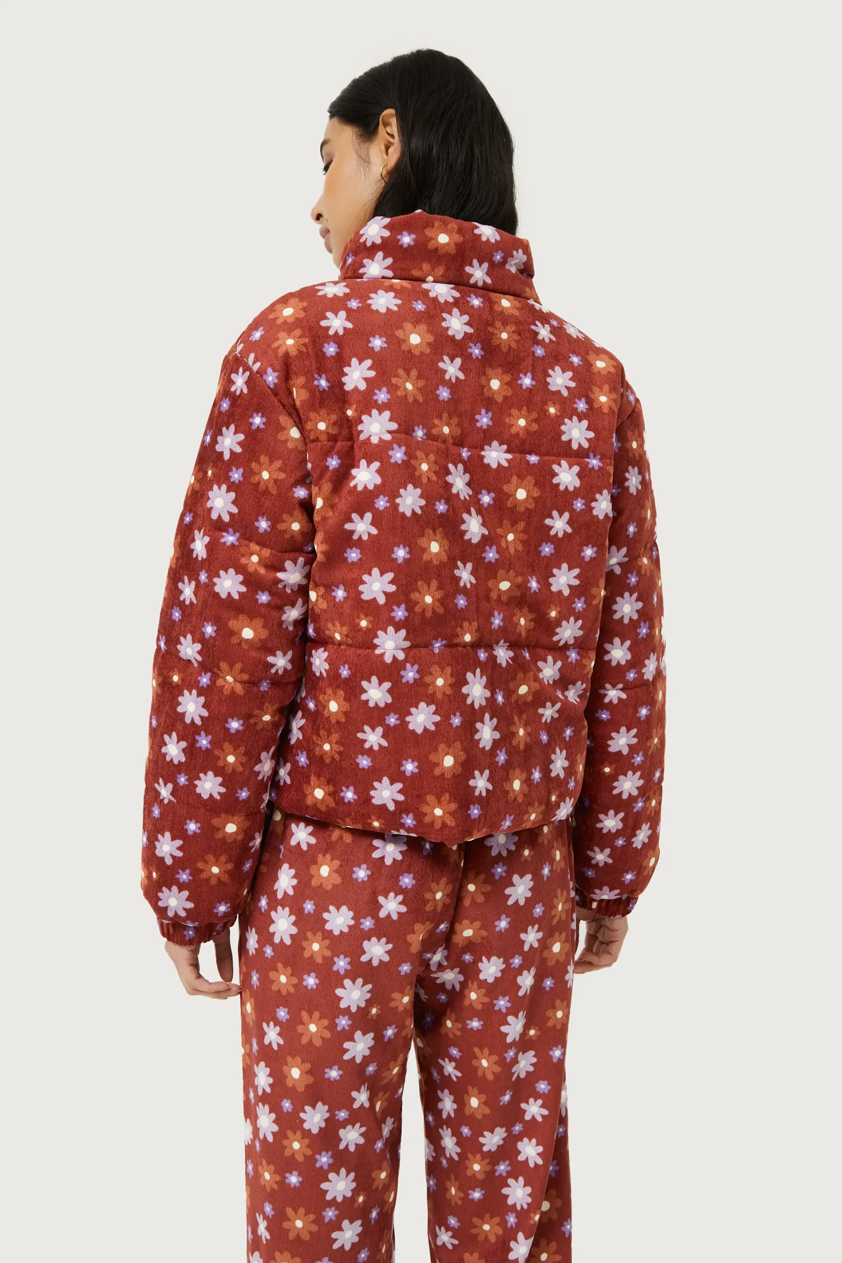 Abrigo acolchado de pana con estampado de flores marrones y lilas. Con cuello mock y manga larga. Cierre frontal de cremallera y bolsillos laterales. Forro interior. La modelo mide 176 cm y lleva la talla S.