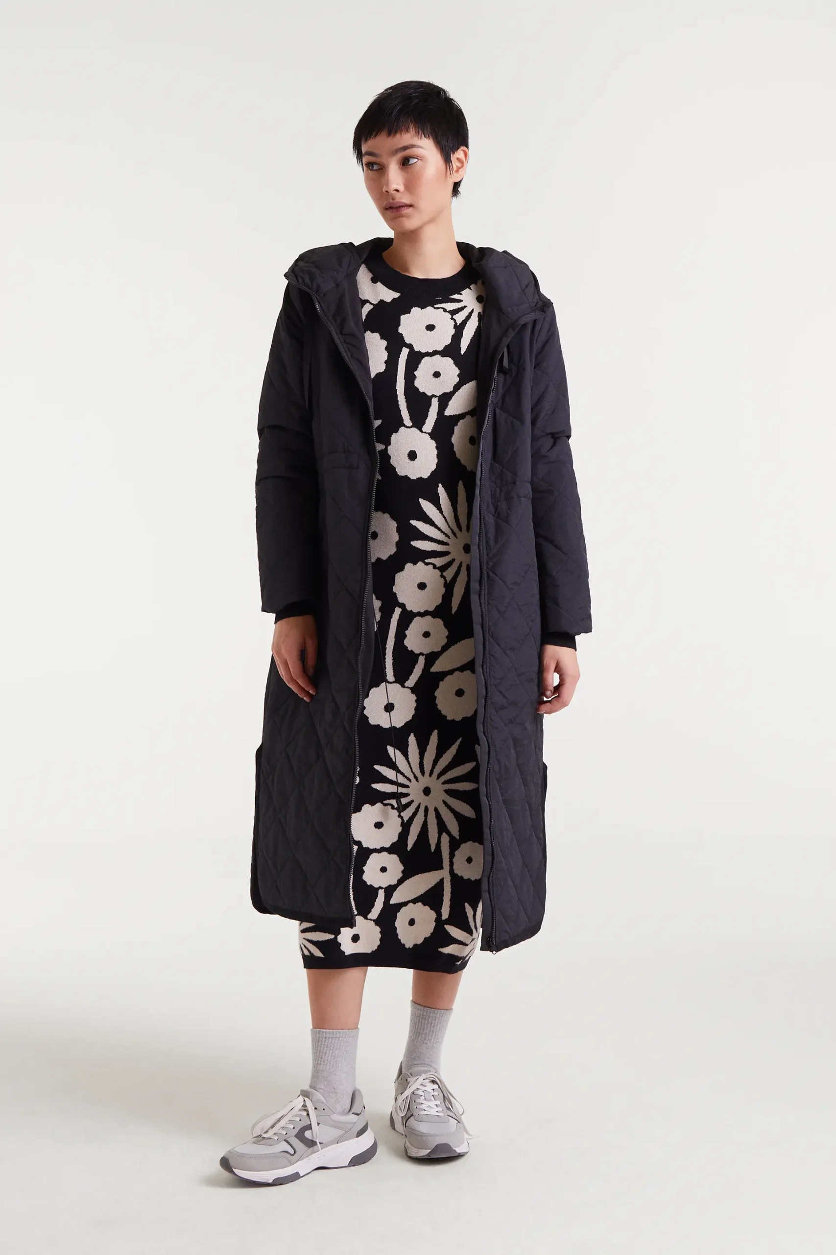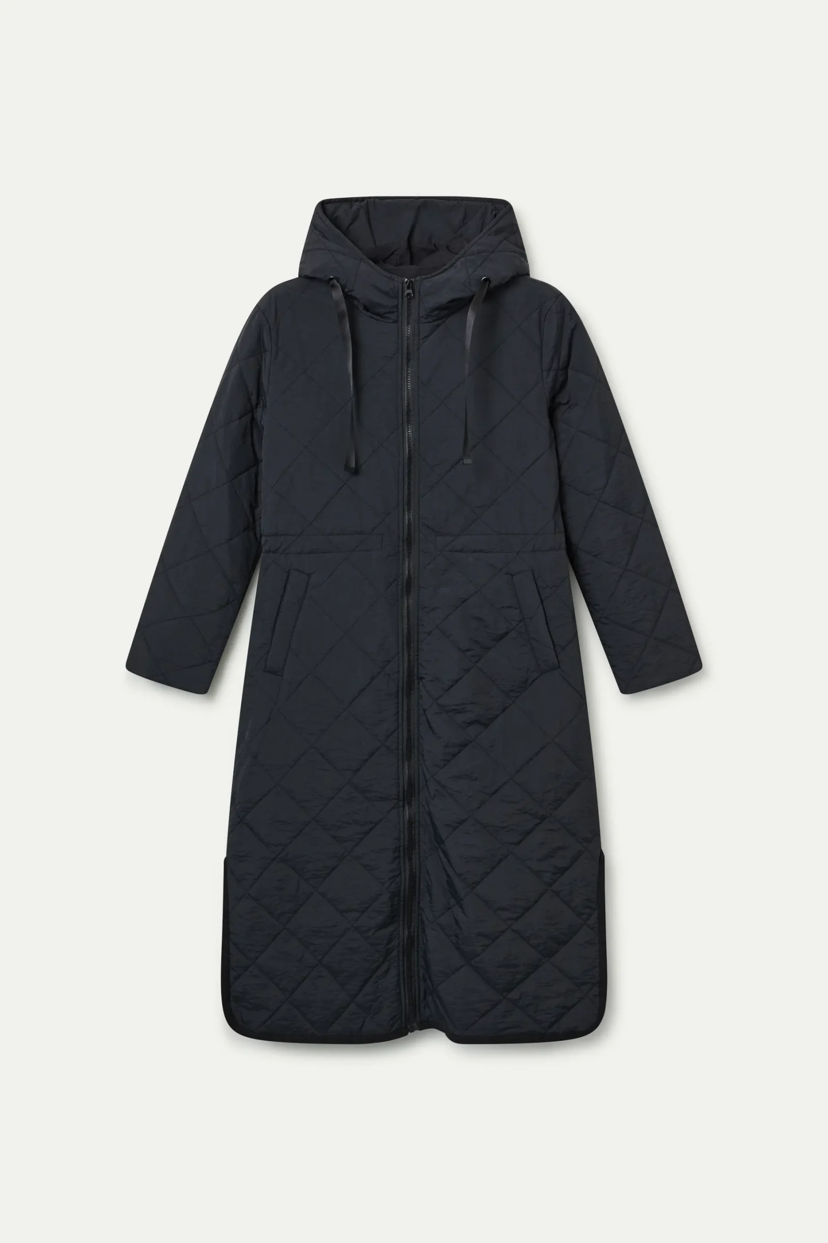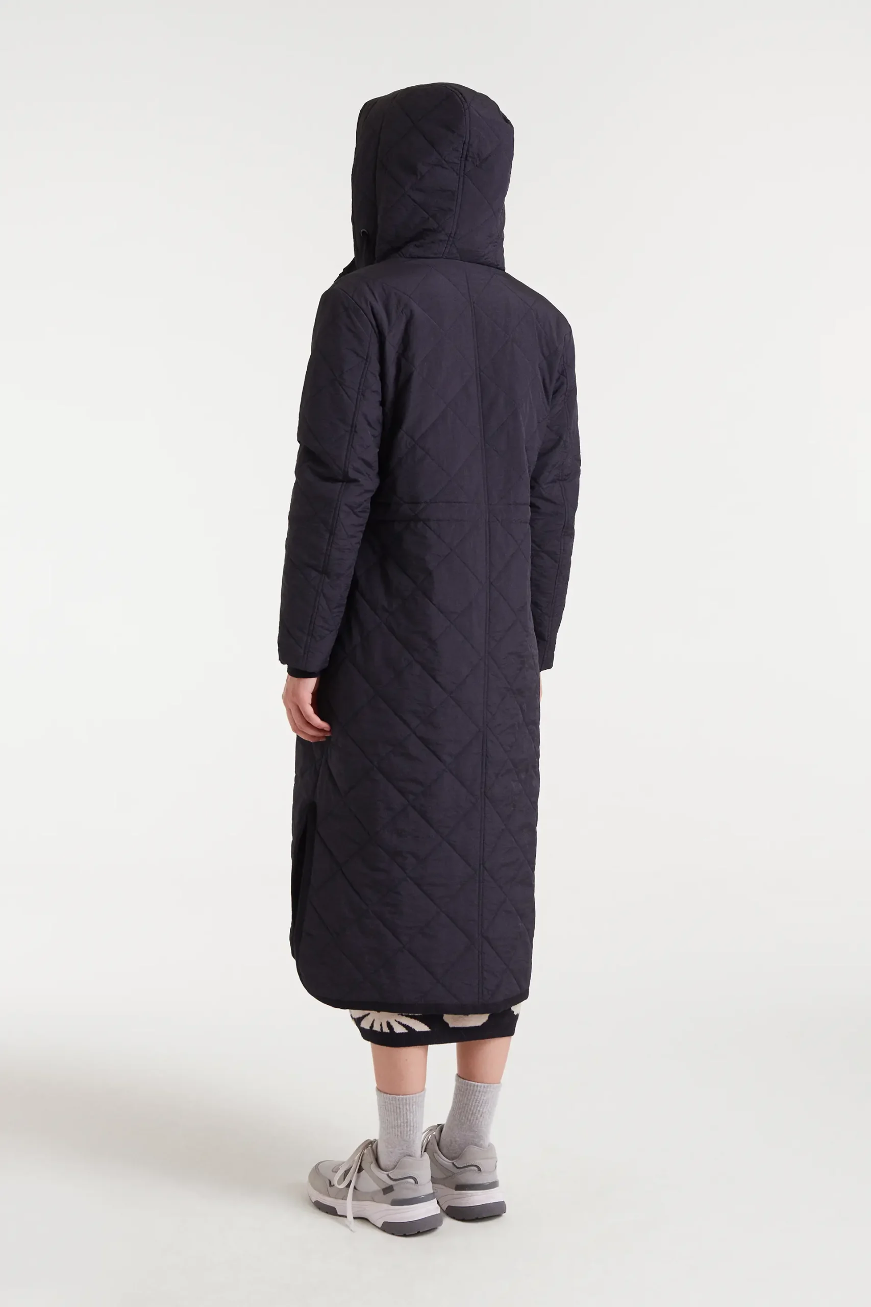 Abrigo con tejido acolchado de color negro. Cuello alto con capucha ajustable y manga larga terminada en puño elástico. Cierre frontal con cremallera. Hombro ligeramente caído. Bolsillos laterales. Forro interior. La modelo mide 177 cm y lleva la talla S.