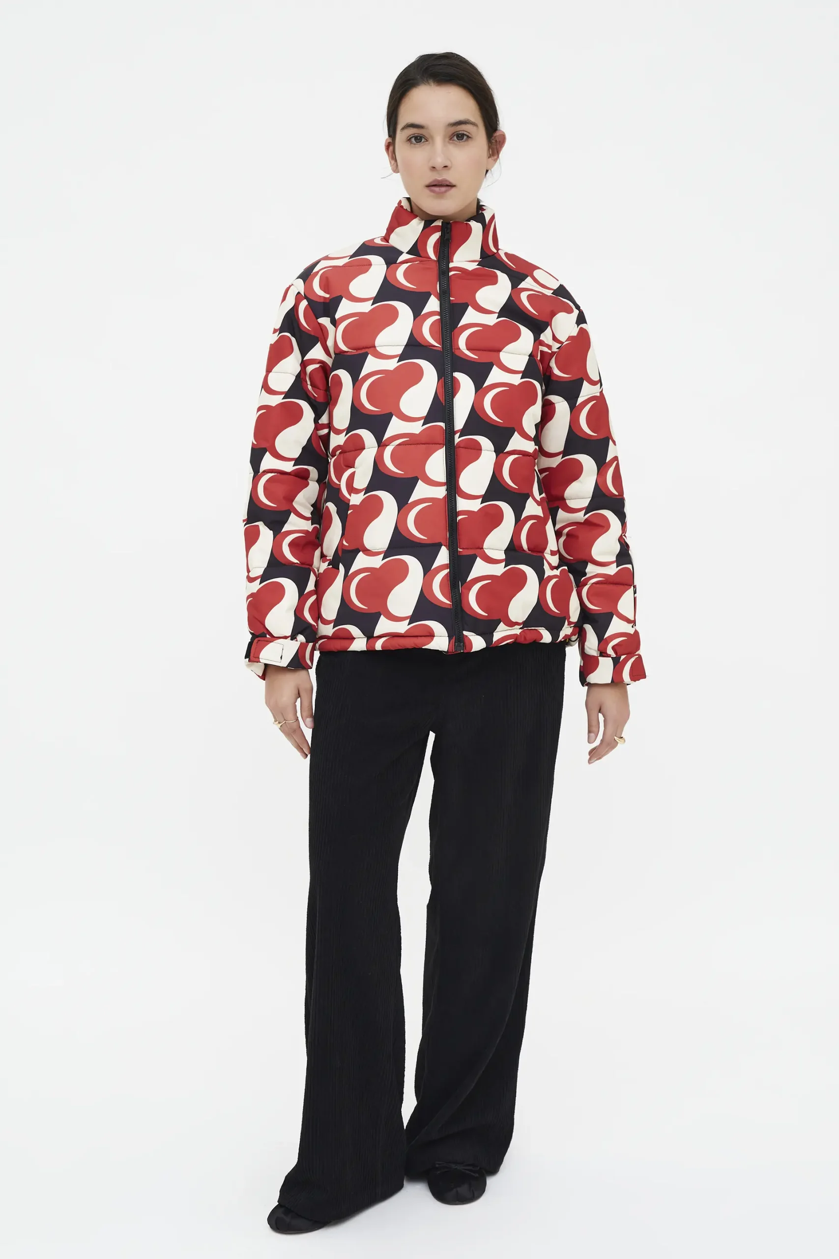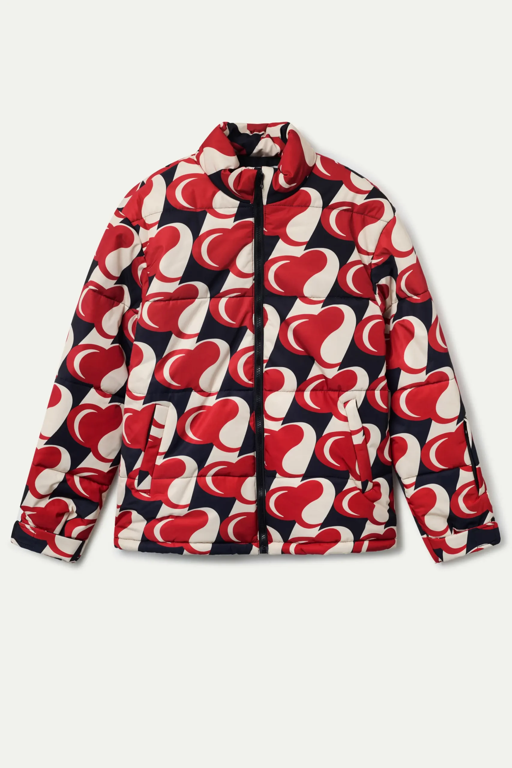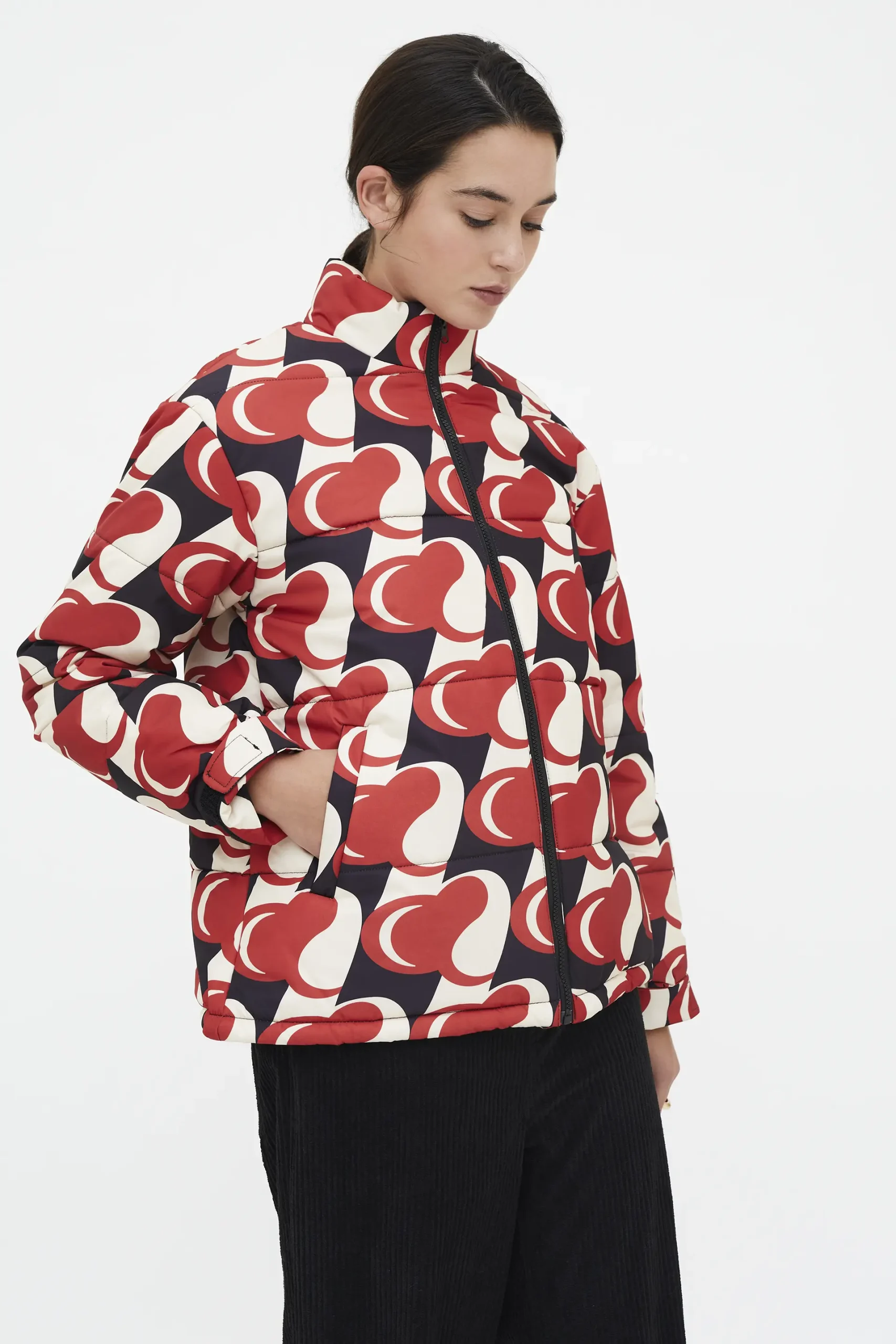 Abrigo corto con estampado Heart Attack. Cuello alto y manga larga con bolsillo. Hombro ligeramente caído. Cierre frontal con cremallera. Bolsillos frontales. Forro interior. La modelo mide 174 cm y lleva la talla S.