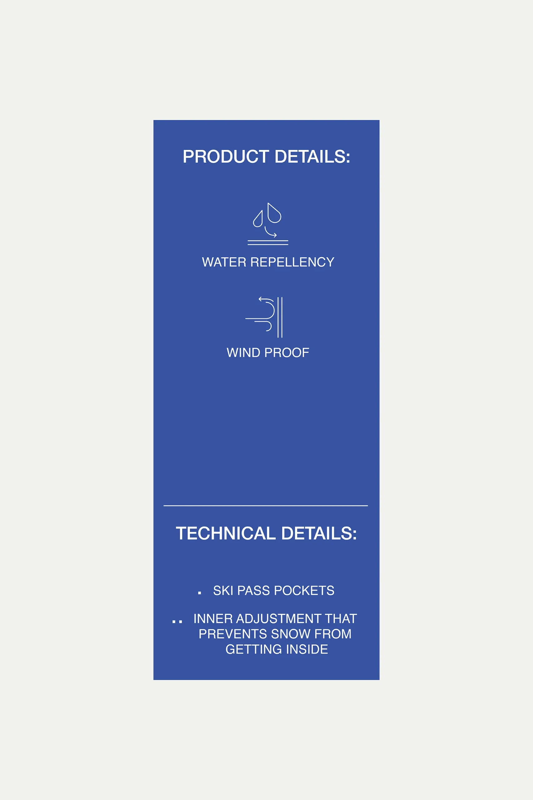 • Bolsillo para forfait. Práctico compartimiento especialmente diseñado para guardar tu pase de esquí y tenerlo siempre a mano.