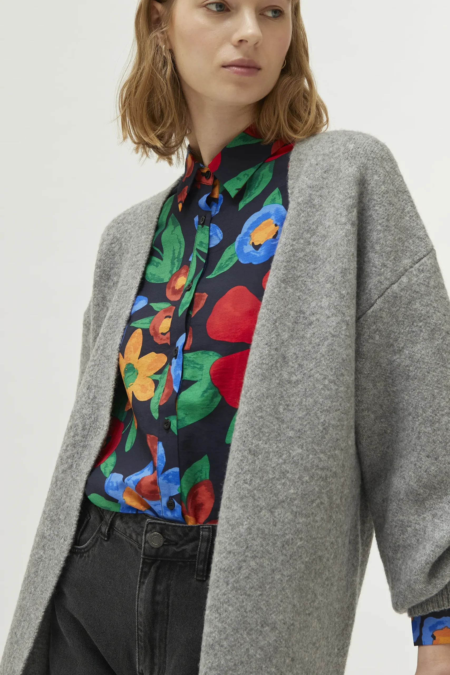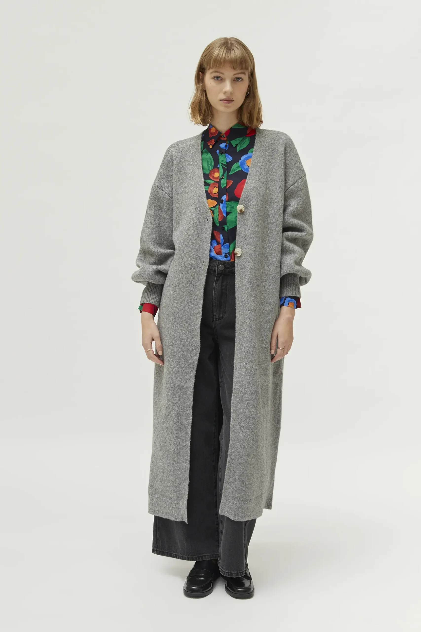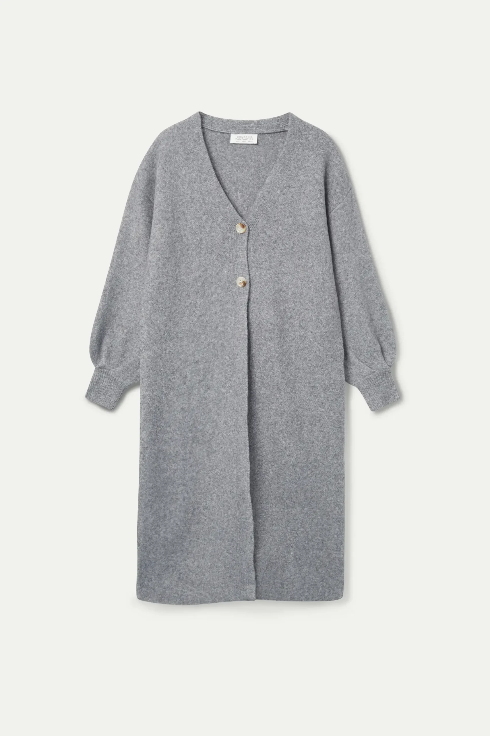 Abrigo largo de color gris. Con cuello pico y manga larga acabada en puño elástico. Cierre frontal con botones. La modelo mide 177 cm y lleva la talla S.