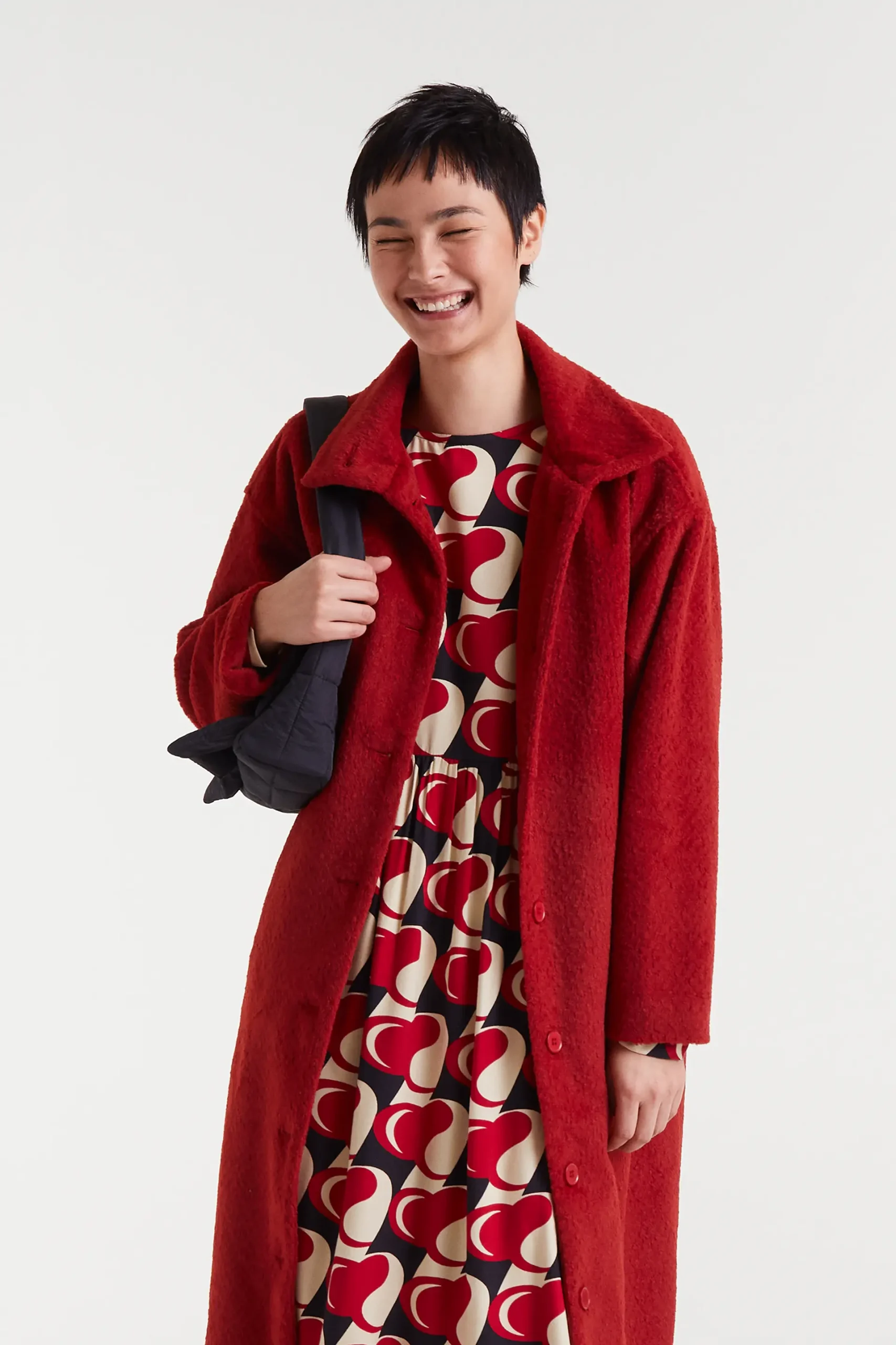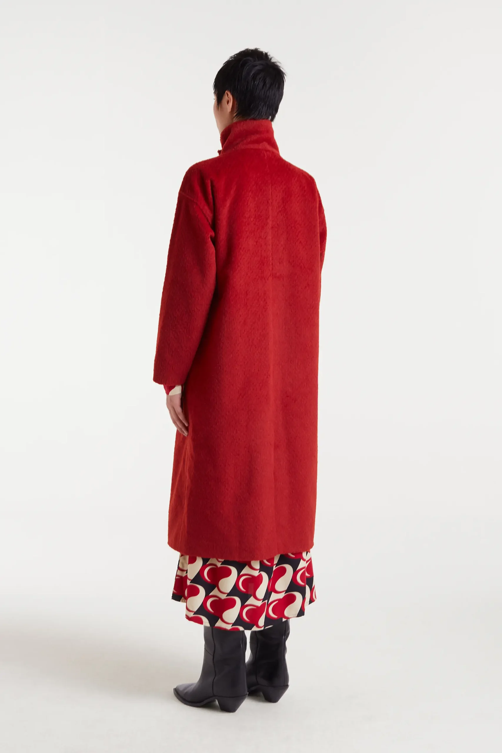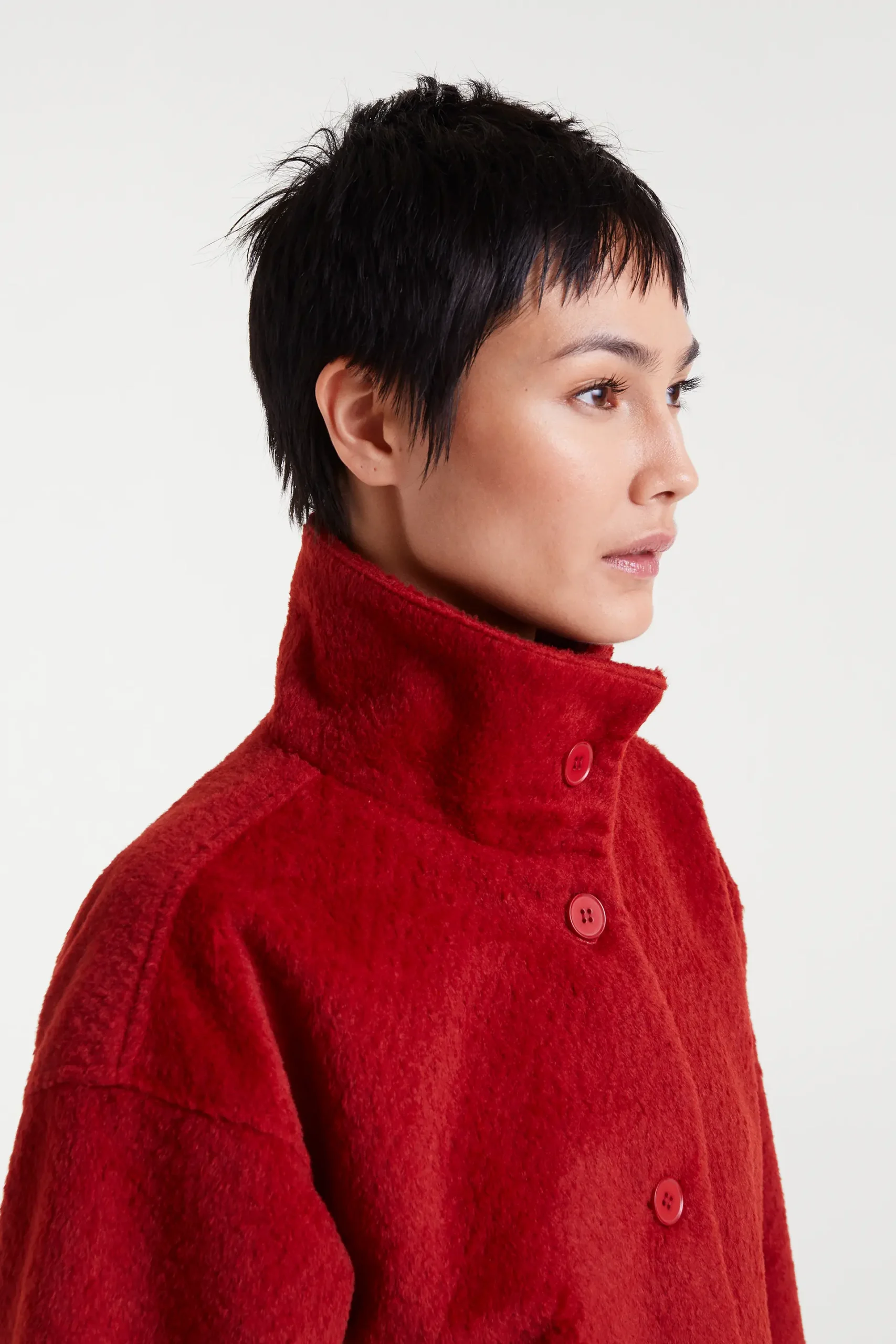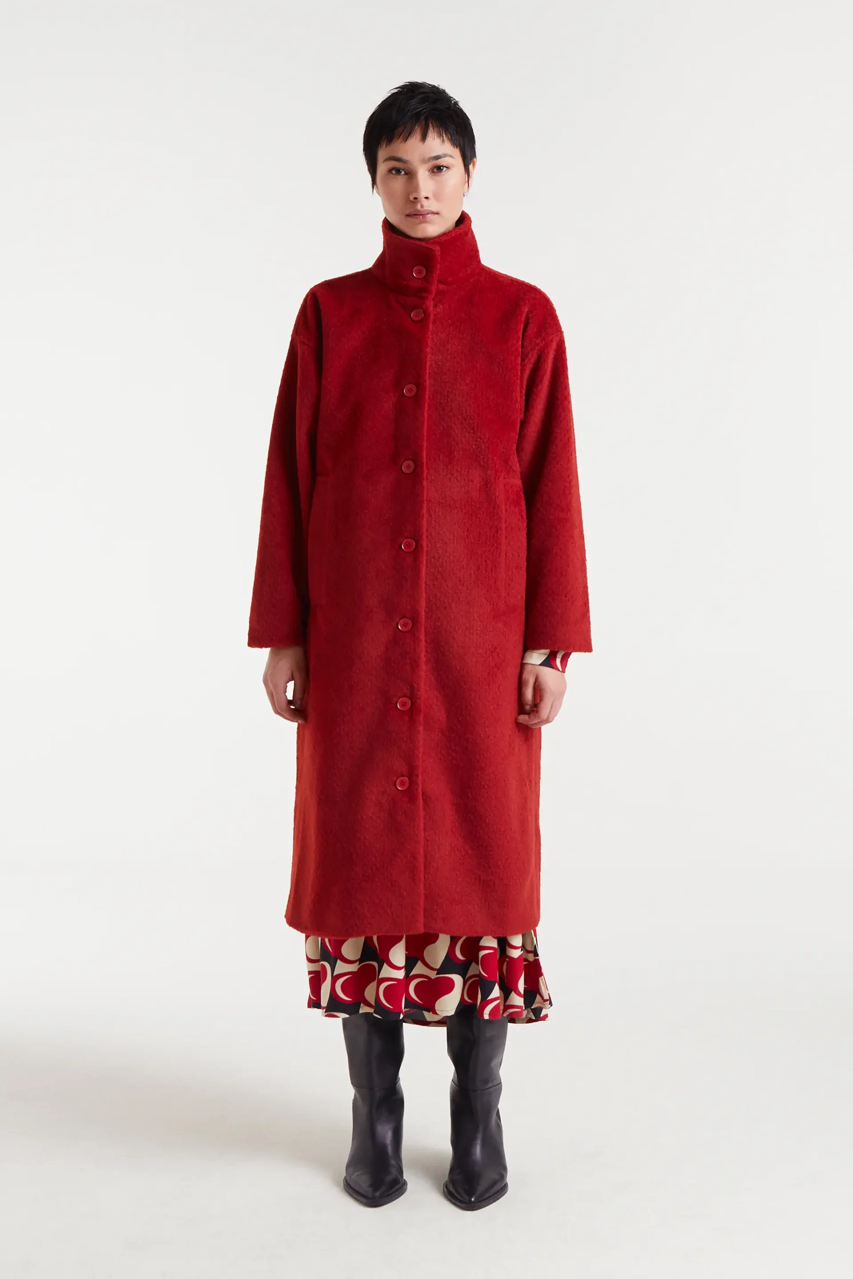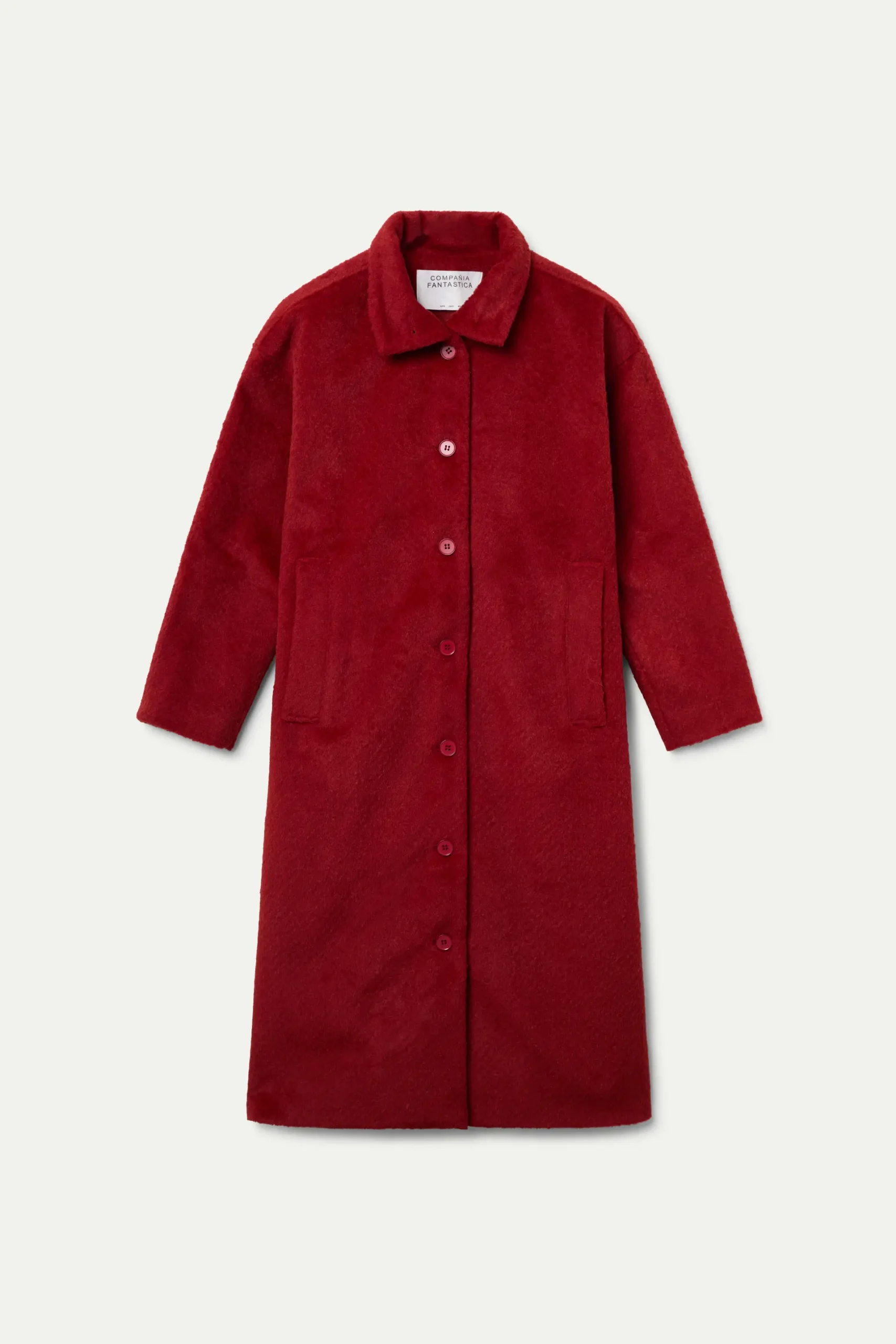 Abrigo largo con tejido efecto pelo corto de color rojo. Cuello solapa y manga larga. Cierre frontal con botones. Hombro ligeramente caído. Bolsillos frontales. Forro interior. La modelo mide 177 cm y lleva la talla S.