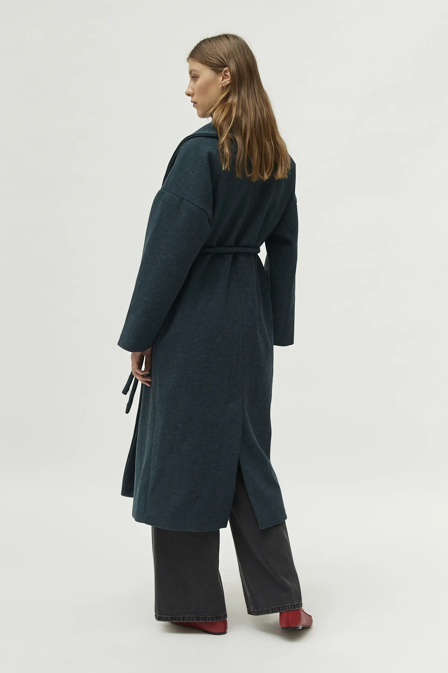 Abrigo midi de color verde. Con corte abierto y manga larga. Cierre con cinturón ajustable. Forro interior. La modelo mide 177 cm y lleva la talla S.