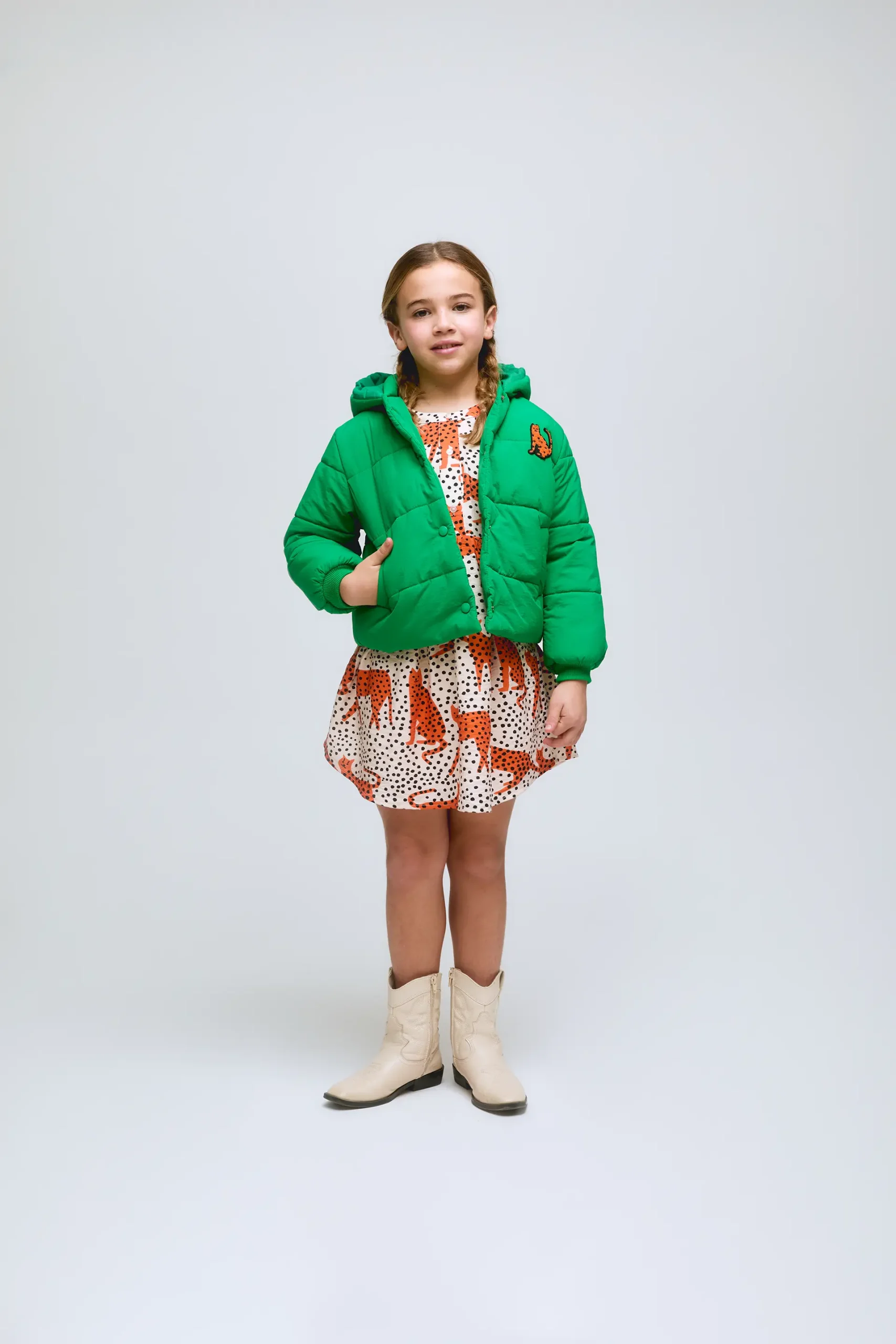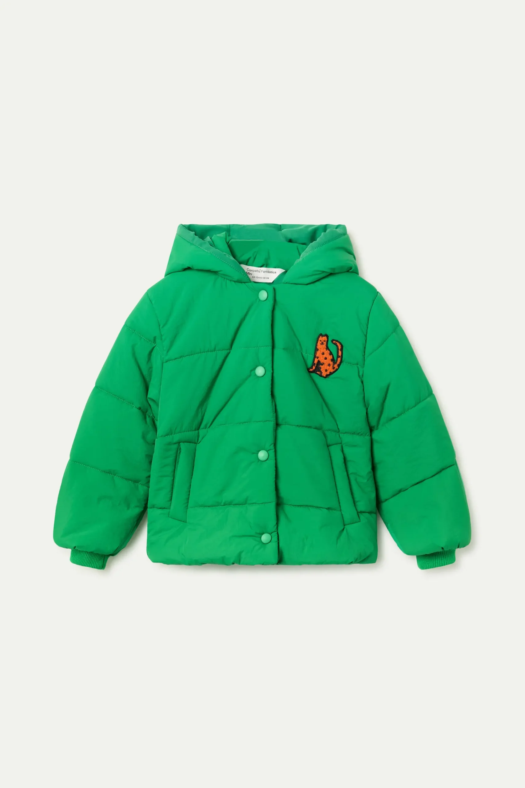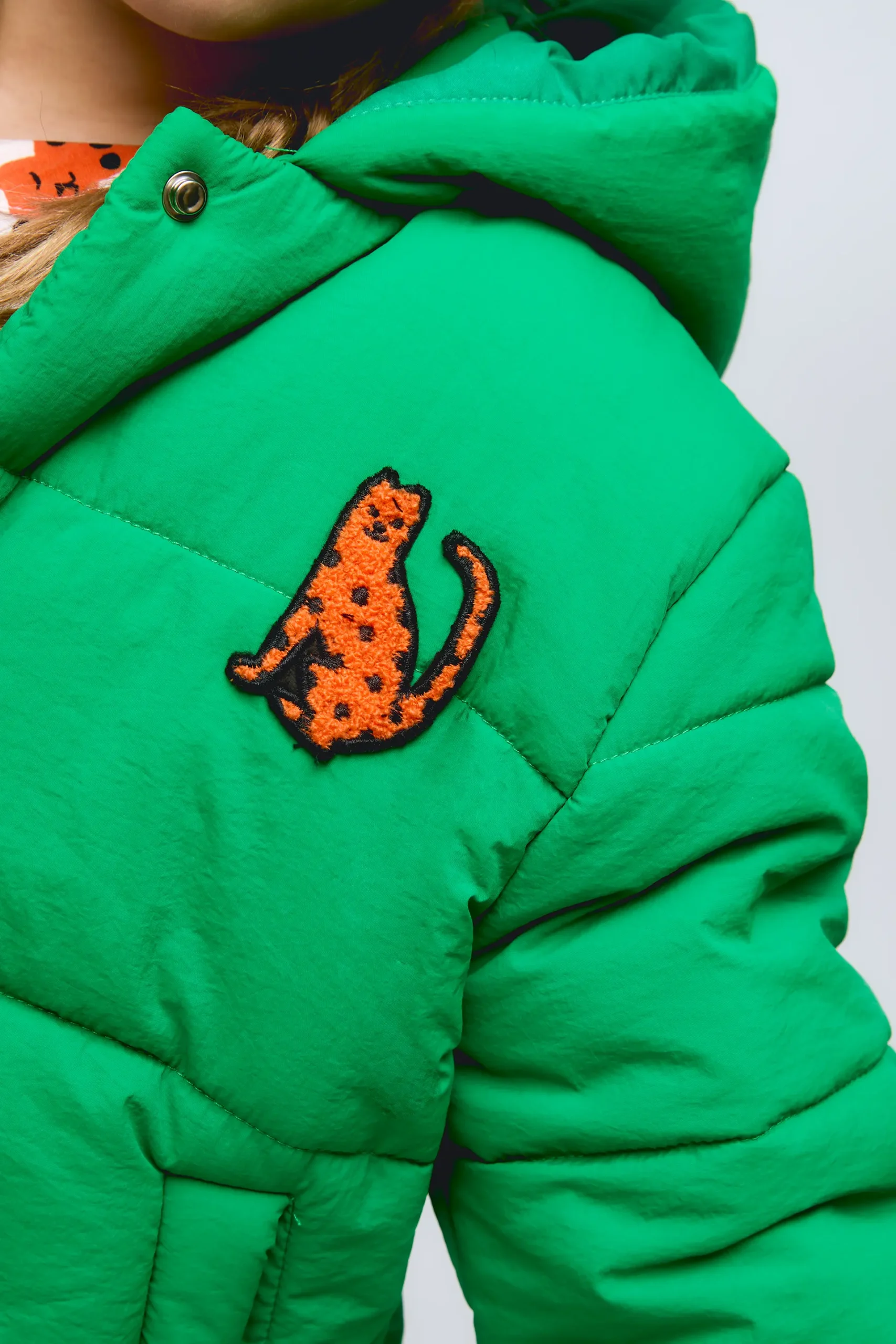Abrigo acolchado para niña de color verde con leopardo bordado. Cuenta con capucha integrada, cierre frontal de botones a presión y puños elásticos.