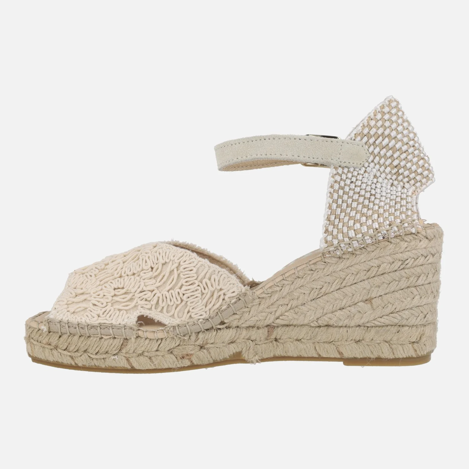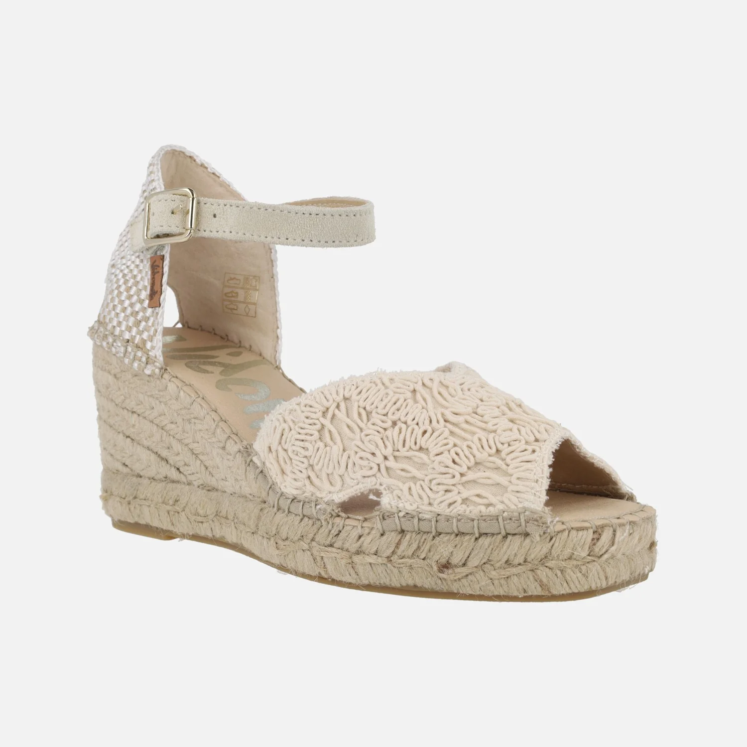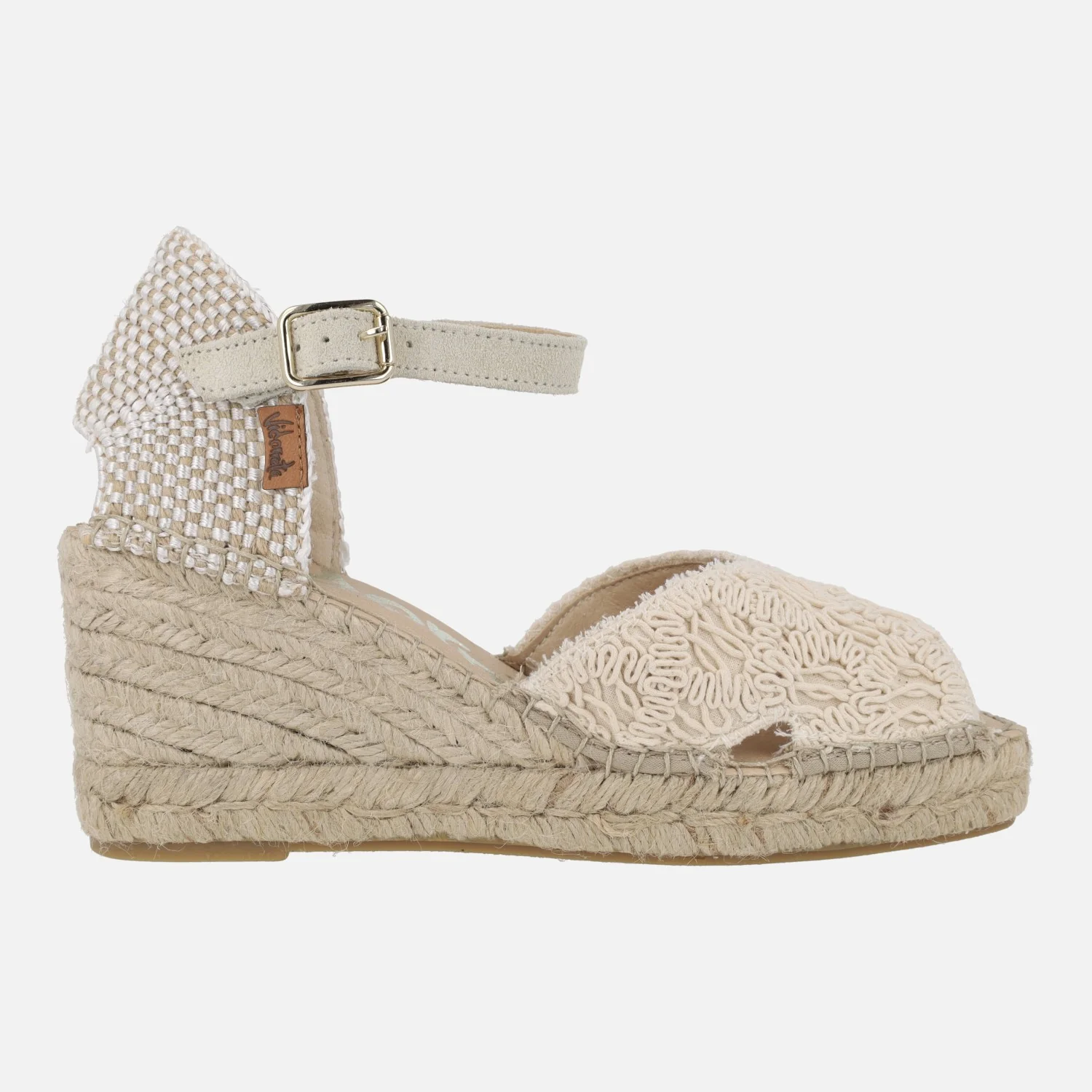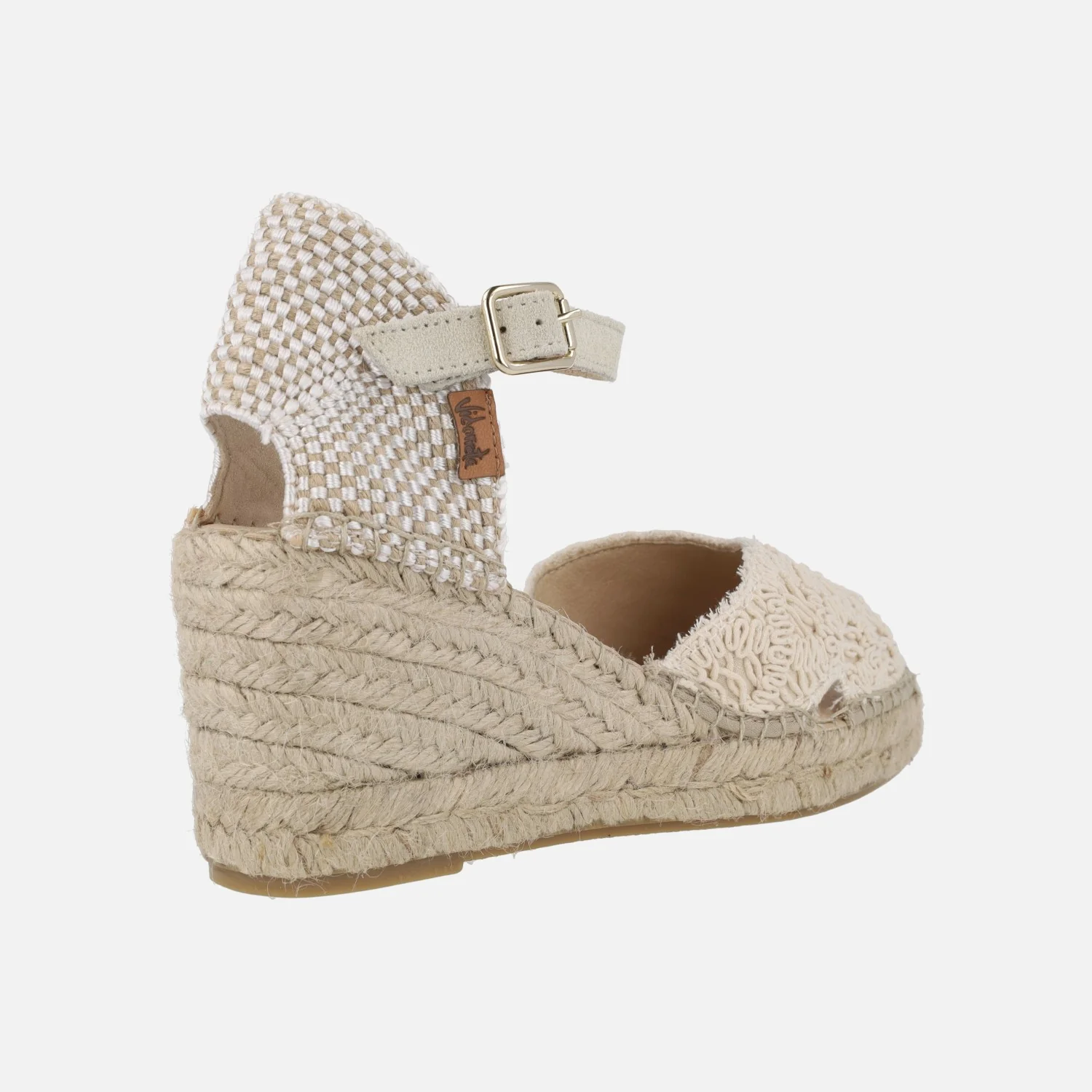 Alpargatas para mujer abiertas de puntera de la marca Vidorreta modelo 17100COM54 Cordela Mariposa Crudo. Zapatillas de esparto elaboradas en tejido beige con talonera en tejido y pulsera al tobillo con cierre de hebilla. Interior textil, con plantillas acolchadas. Cuña y plataforma de yute natural, con una altura trasera de 7,5 cms (2,5 cms parte delantera). Suela sintética.