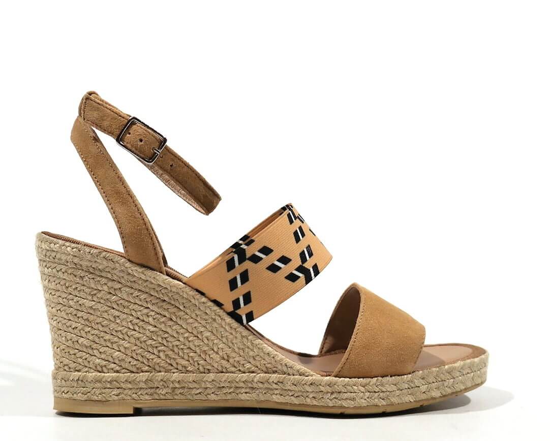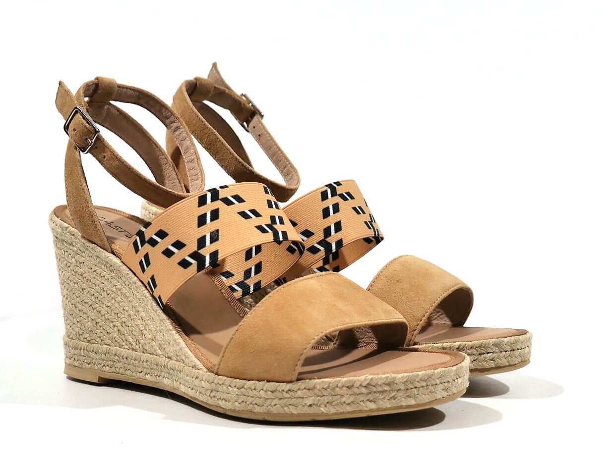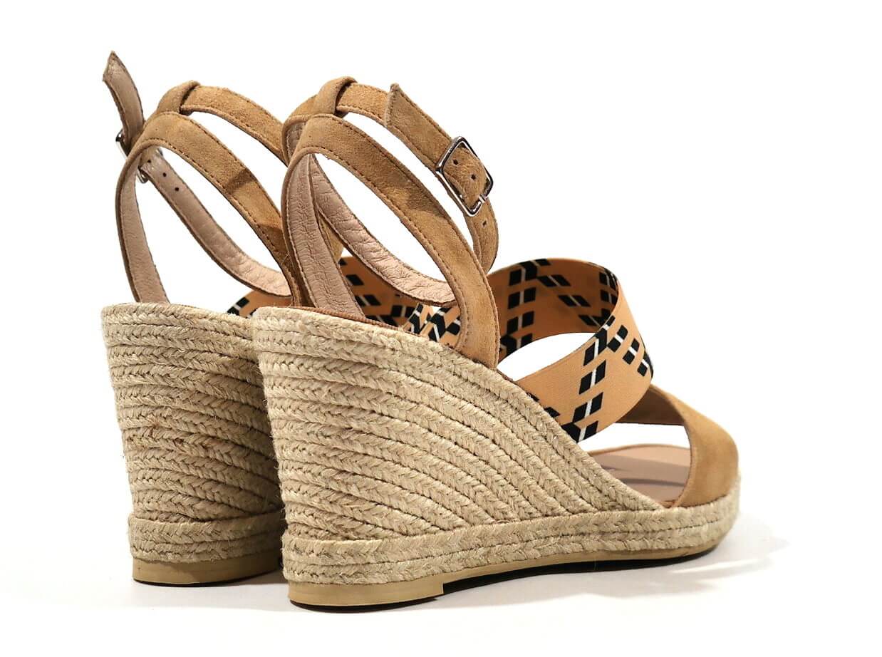Preciosas alpargatas para mujer de la marca española Casteller, modelo 810. Sandalias con tira delantera de serraje beige y banda elástica beige al empeine con motivos étnicos en blanco y negro. Pulsera al tobillo con cierre de hebilla. Planta de piel. Cuñas altas de esparto natural, de 9 cms de altura en la parte de atrás y 1,5 cms en la parte delantera. Made in Spain.