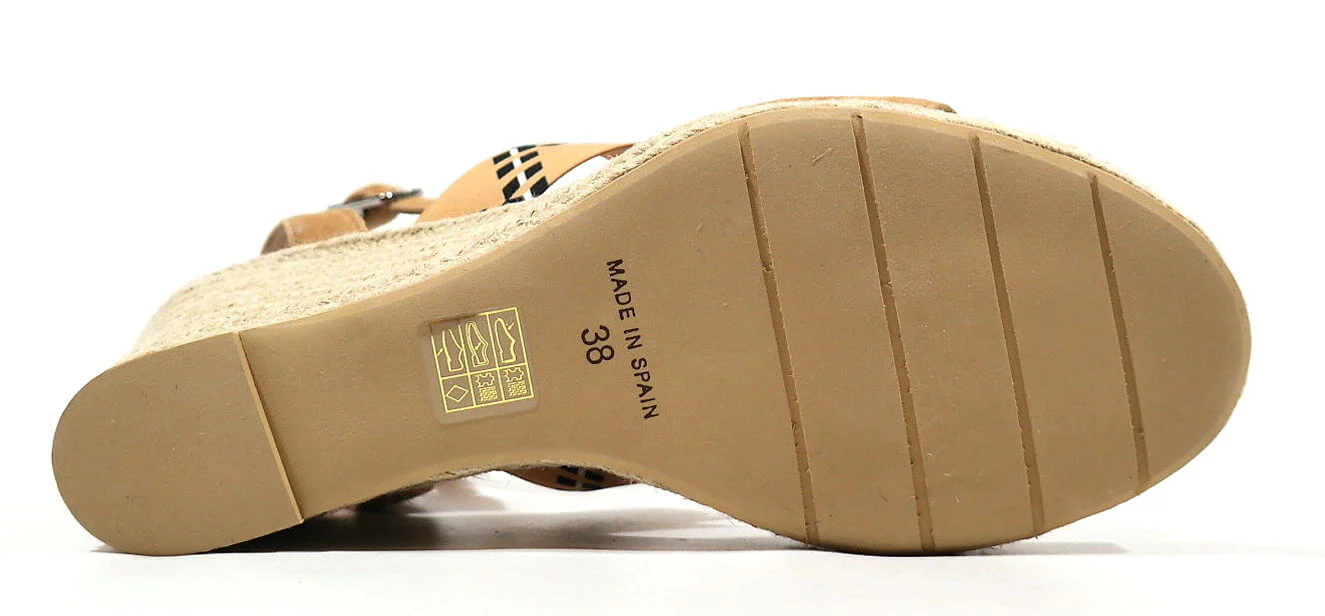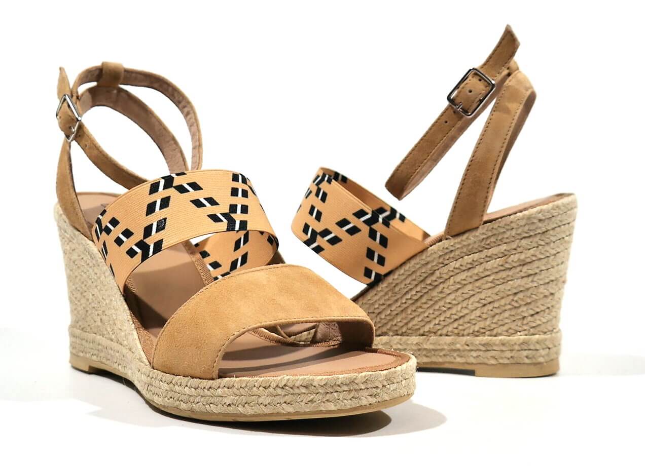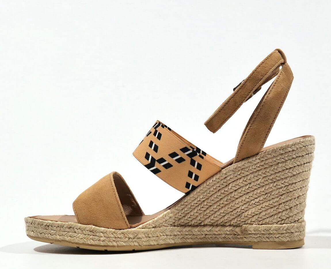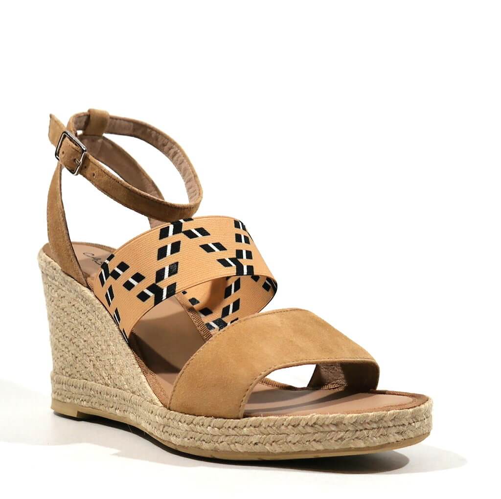 Preciosas alpargatas para mujer de la marca española Casteller, modelo 810. Sandalias con tira delantera de serraje beige y banda elástica beige al empeine con motivos étnicos en blanco y negro. Pulsera al tobillo con cierre de hebilla. Planta de piel. Cuñas altas de esparto natural, de 9 cms de altura en la parte de atrás y 1,5 cms en la parte delantera. Made in Spain.