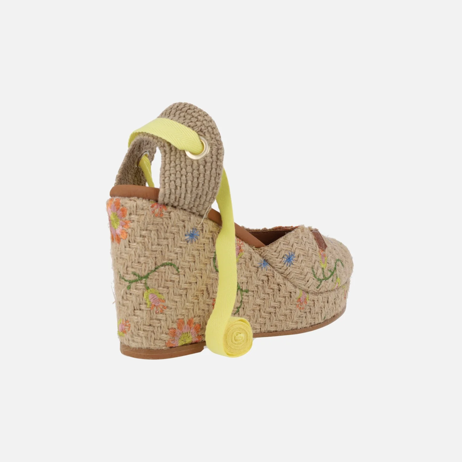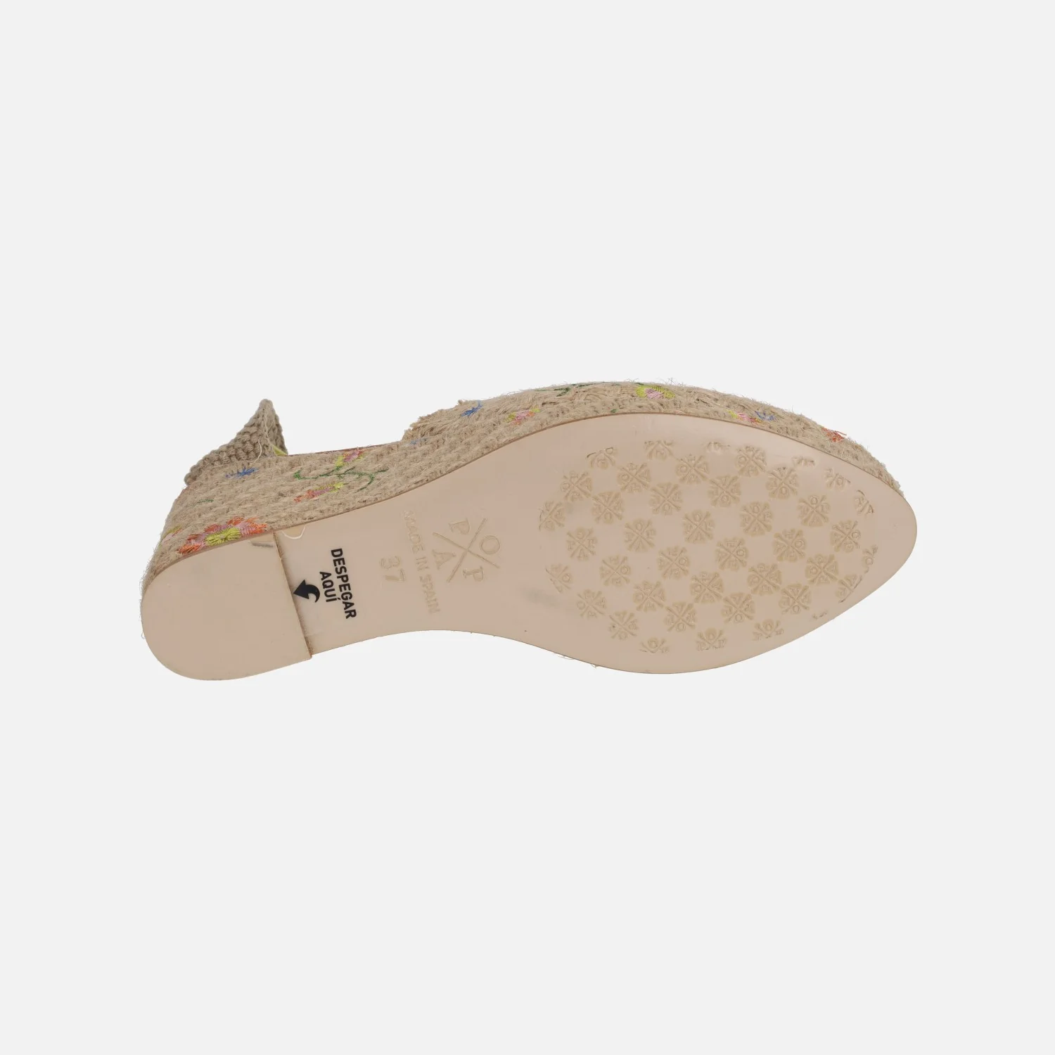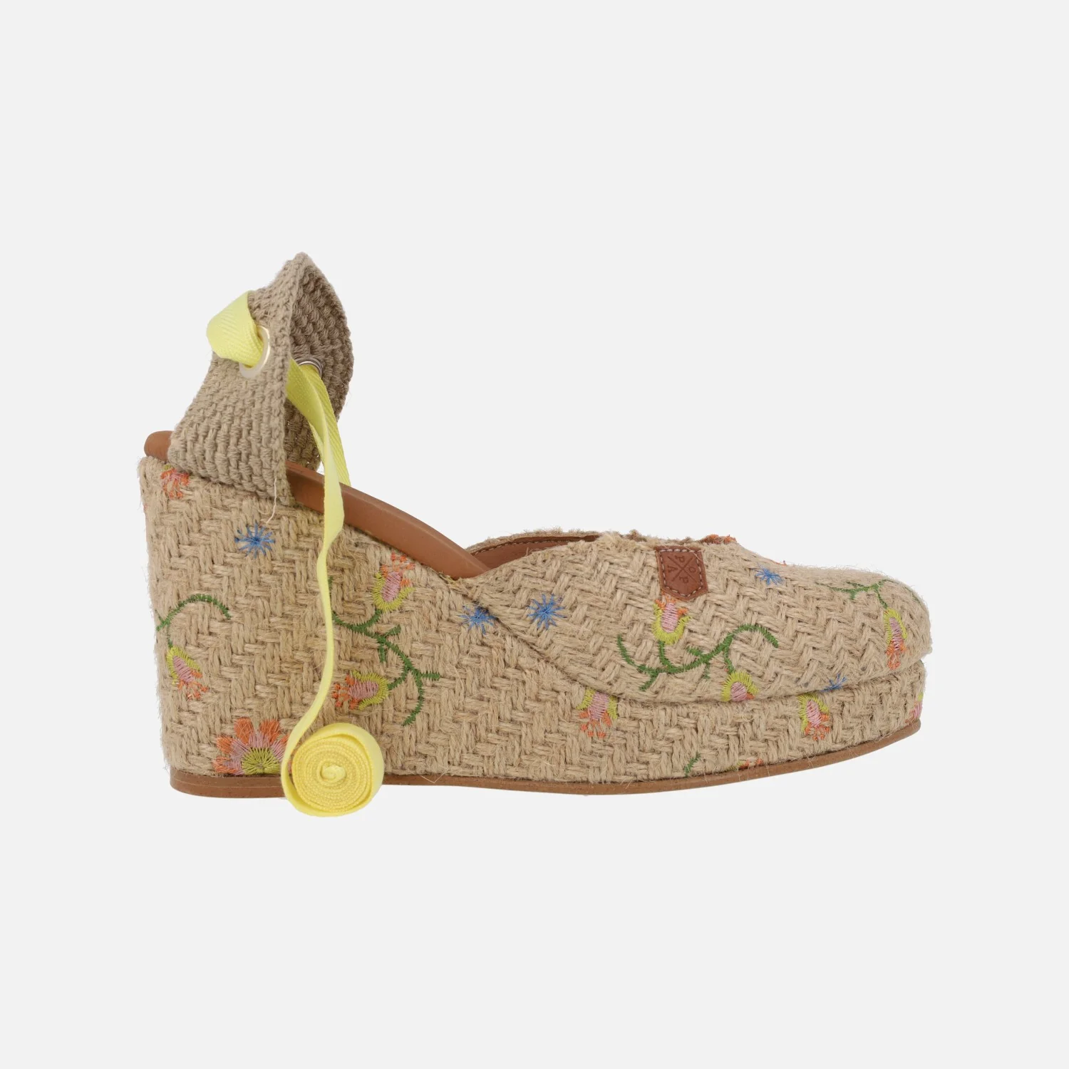 Preciosas alpargatas de la marca Popa modelo Brasilia flores multi rafia. Alpargatas de rafia, cerradas de puntera y con cintas para atar a la pierna o tobillo (vienen tres opciones de cintas para poner las que se prefieran). Elaboradas en rafia beige con flores de colores bordadas. Cuña alta forrada de rafia con 10 cms de altura trasera (2,5 cms parte delantera). Made in Spain.