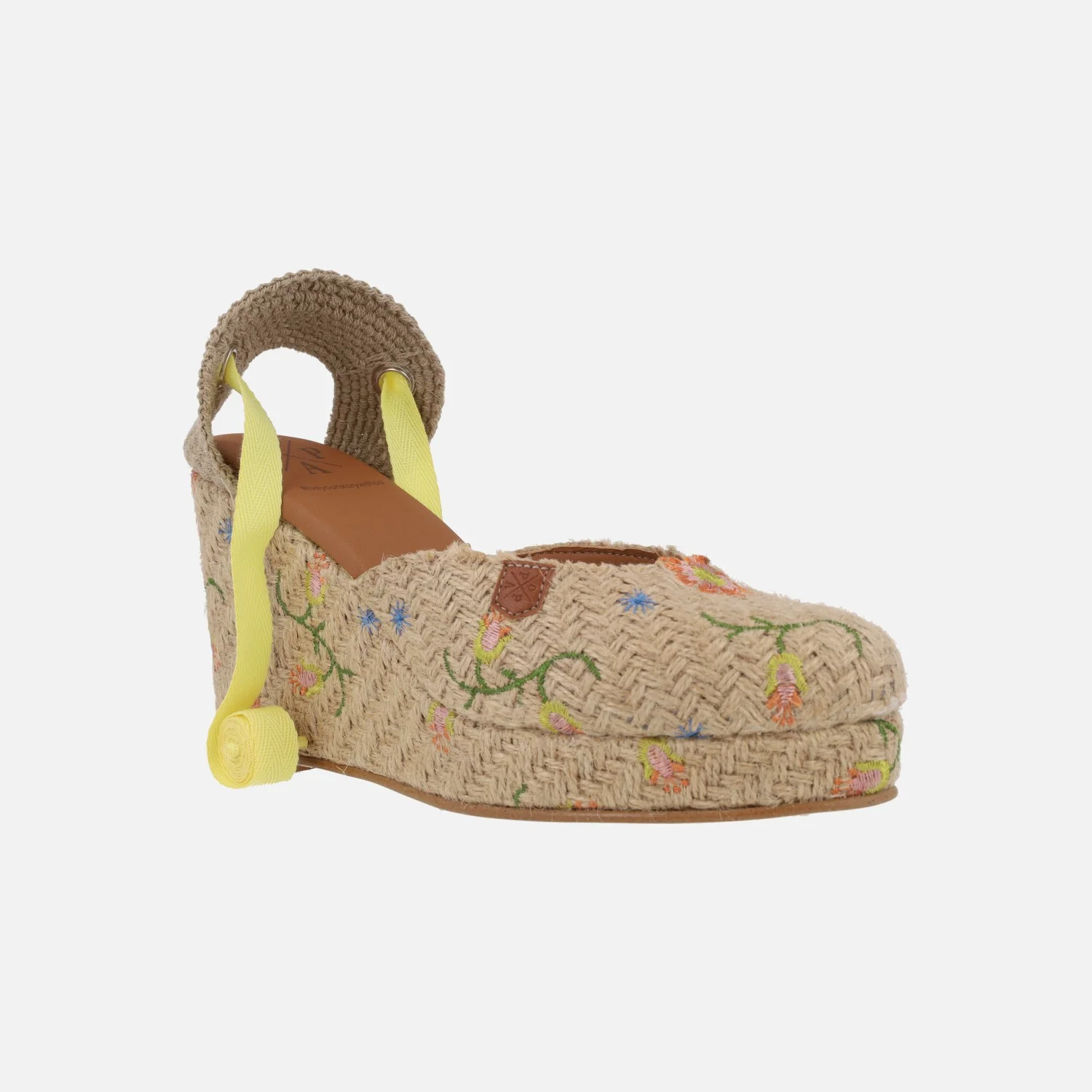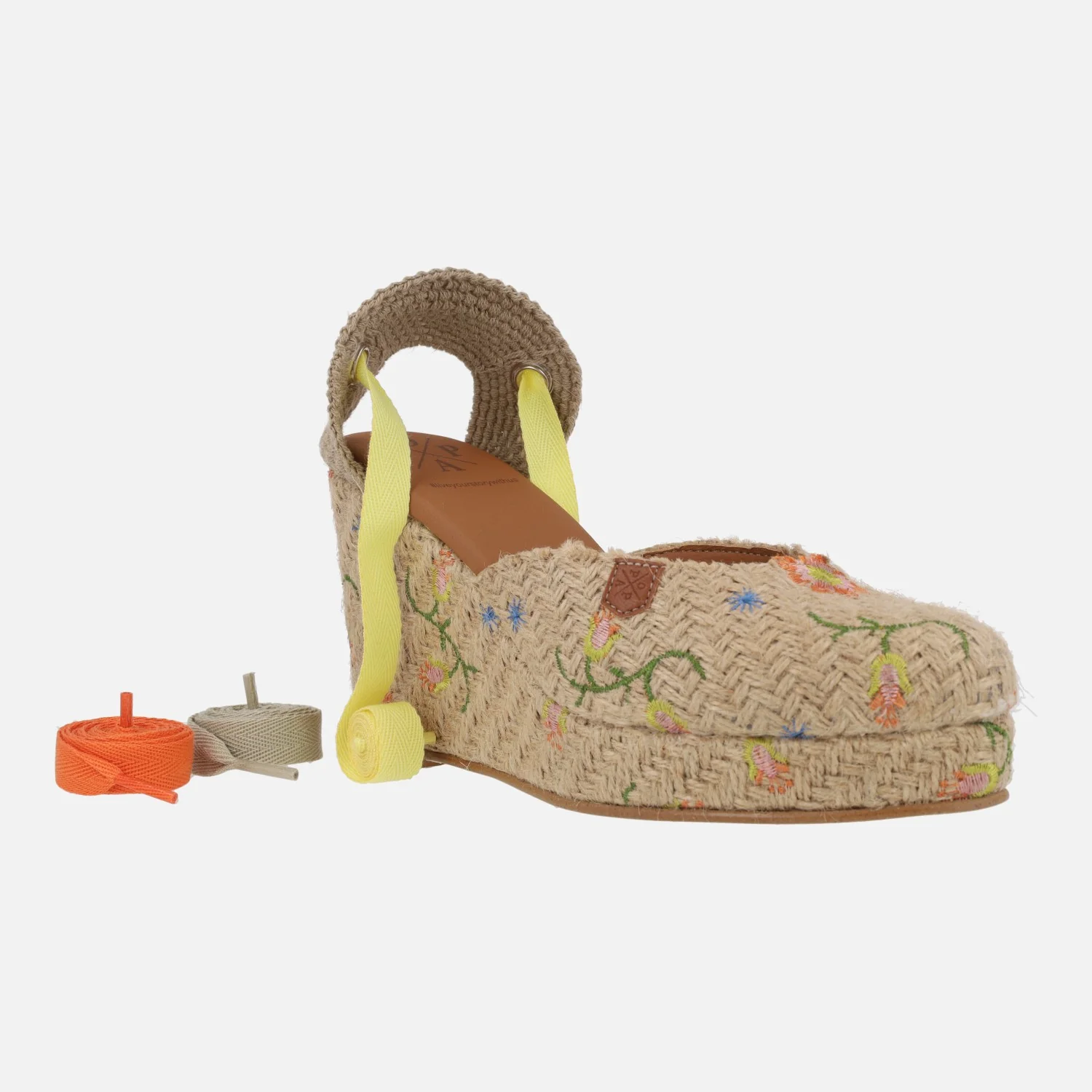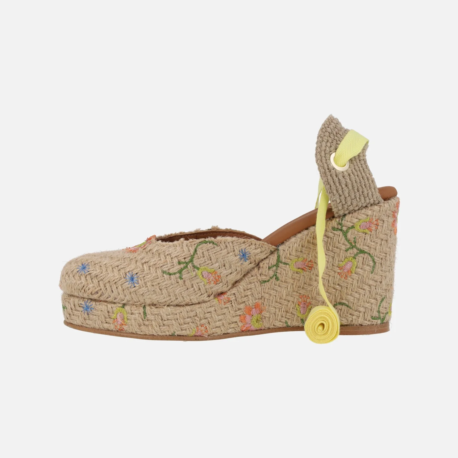 Preciosas alpargatas de la marca Popa modelo Brasilia flores multi rafia. Alpargatas de rafia, cerradas de puntera y con cintas para atar a la pierna o tobillo (vienen tres opciones de cintas para poner las que se prefieran). Elaboradas en rafia beige con flores de colores bordadas. Cuña alta forrada de rafia con 10 cms de altura trasera (2,5 cms parte delantera). Made in Spain.