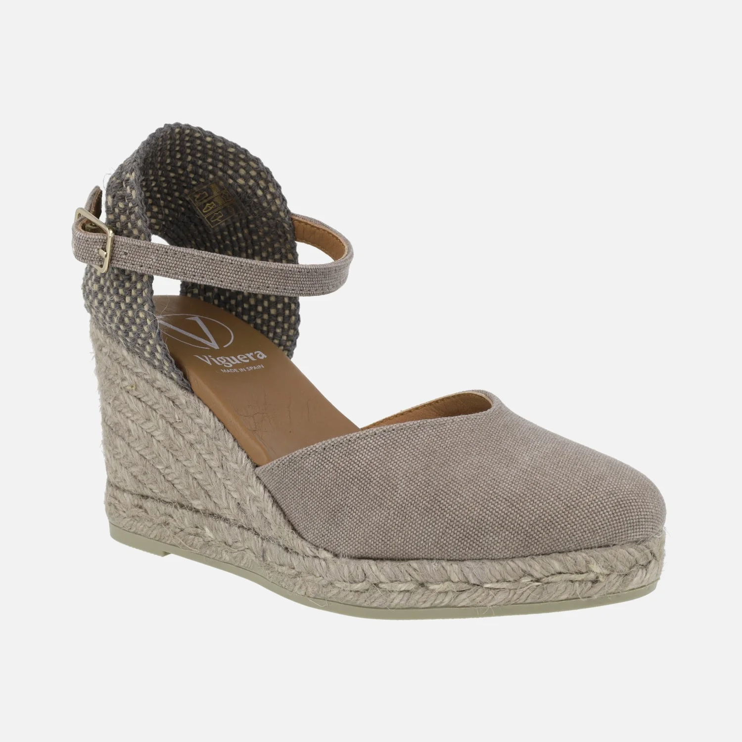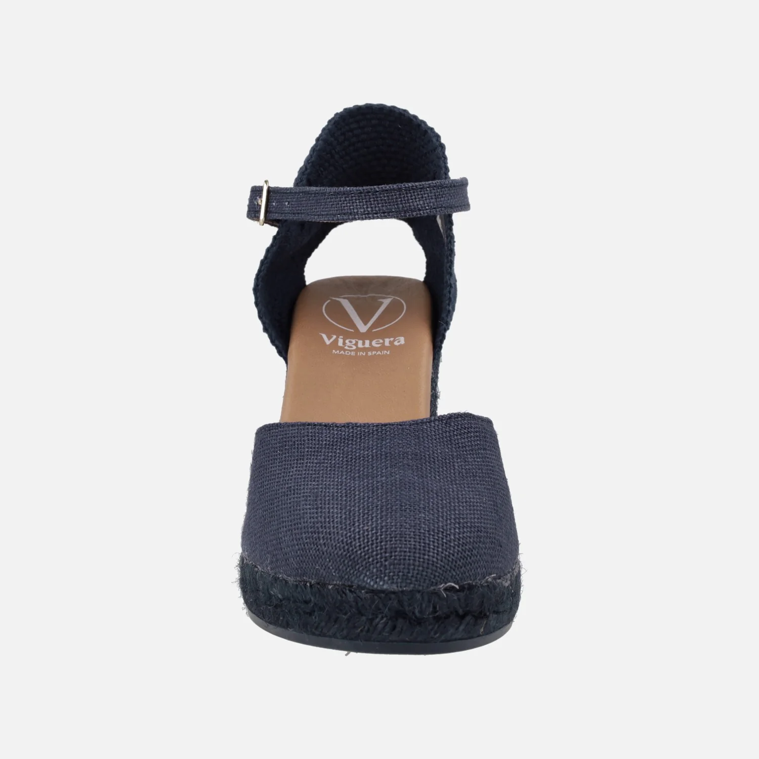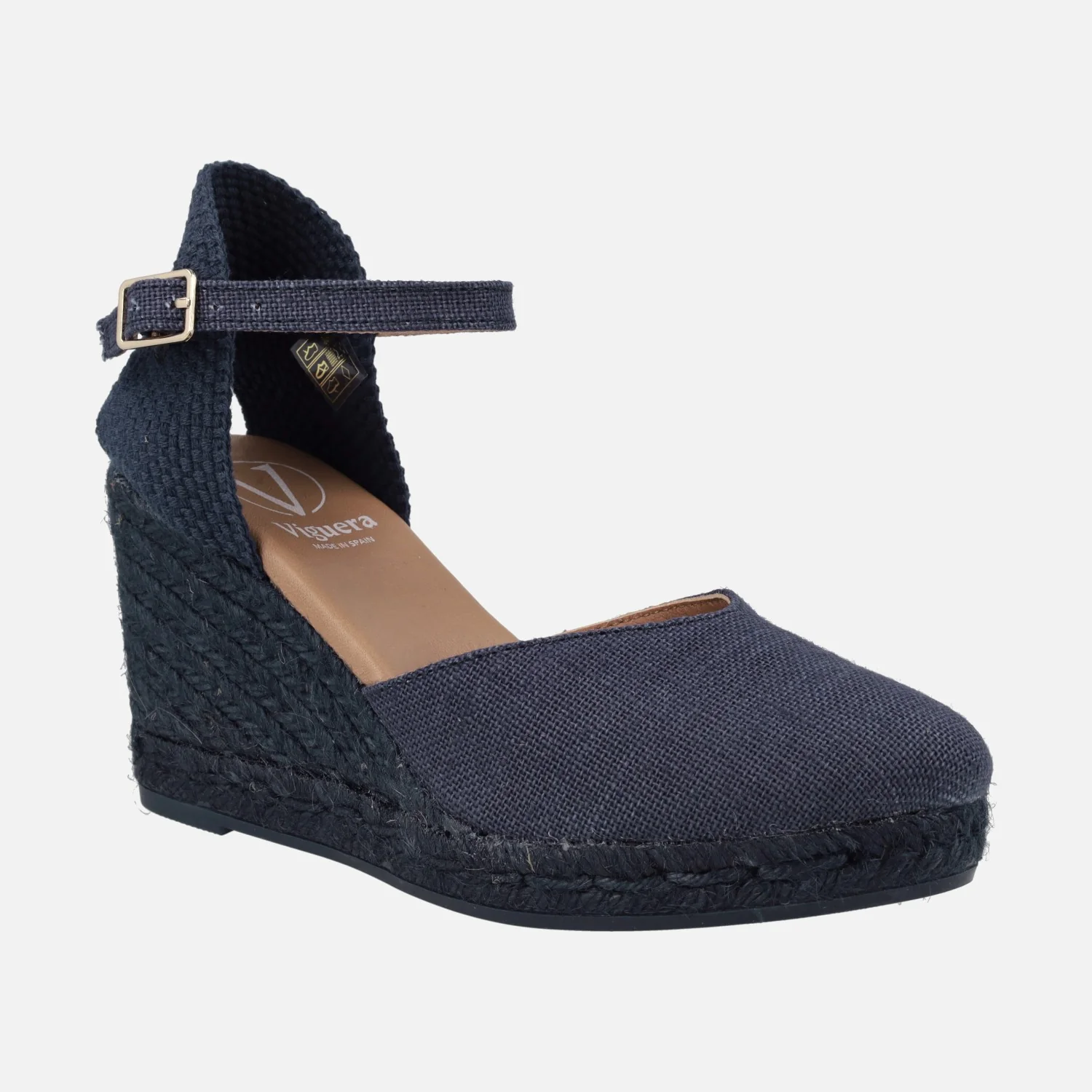 Preciosas alpargatas con cuña alta de la marca española Viguera modelo 2135. Disponibles en azul marino o taupe. Alpargatas elaboradas en tejido lino de primera calidad, con detalle de pulsera con cierre de hebilla al tobillo. Interior mixto de piel y tejido, con plantillas de piel acolchadas. Cuñas altas de esparto de 9 cms de altura en la parte trasera (2 cms de plataforma delantera). Made in Spain.