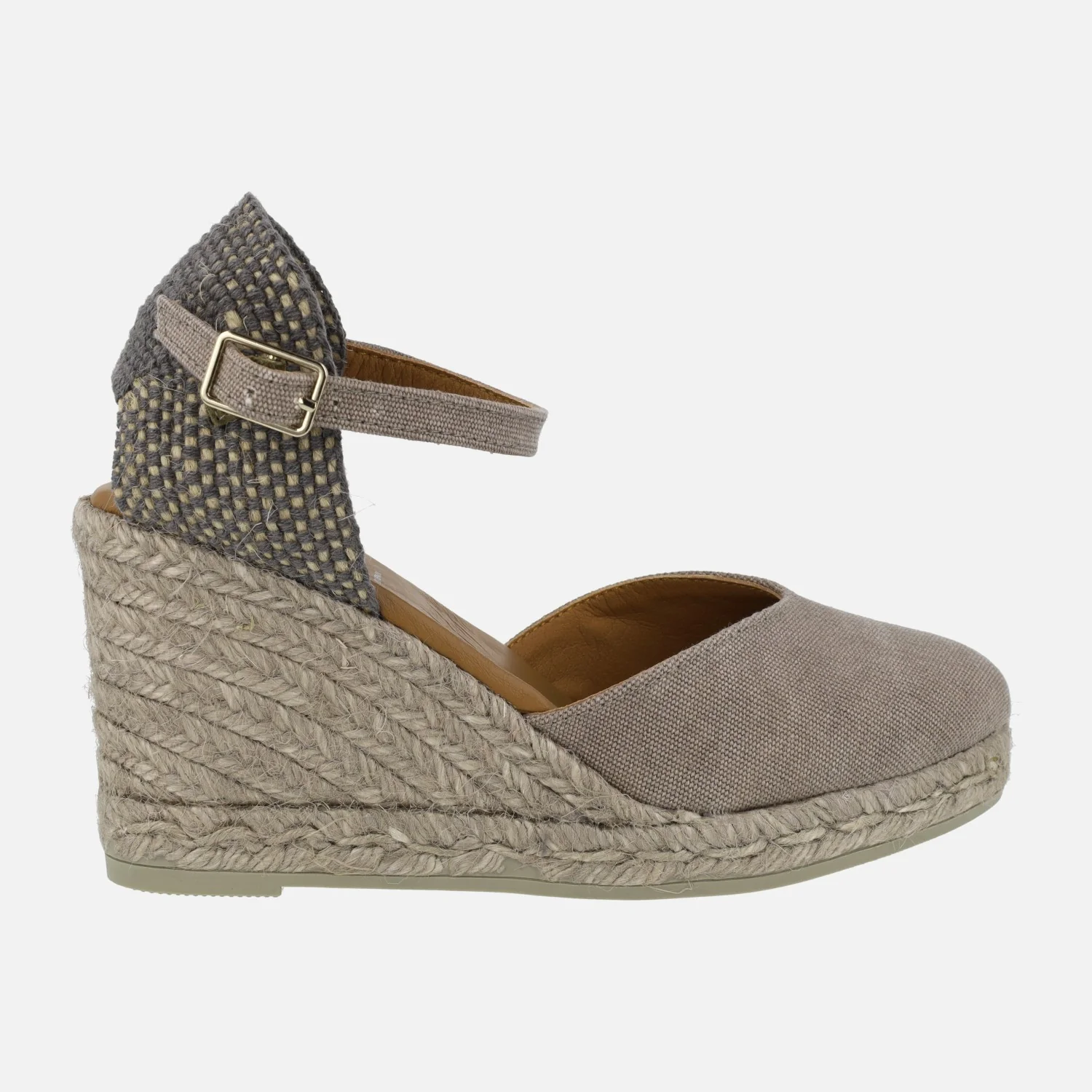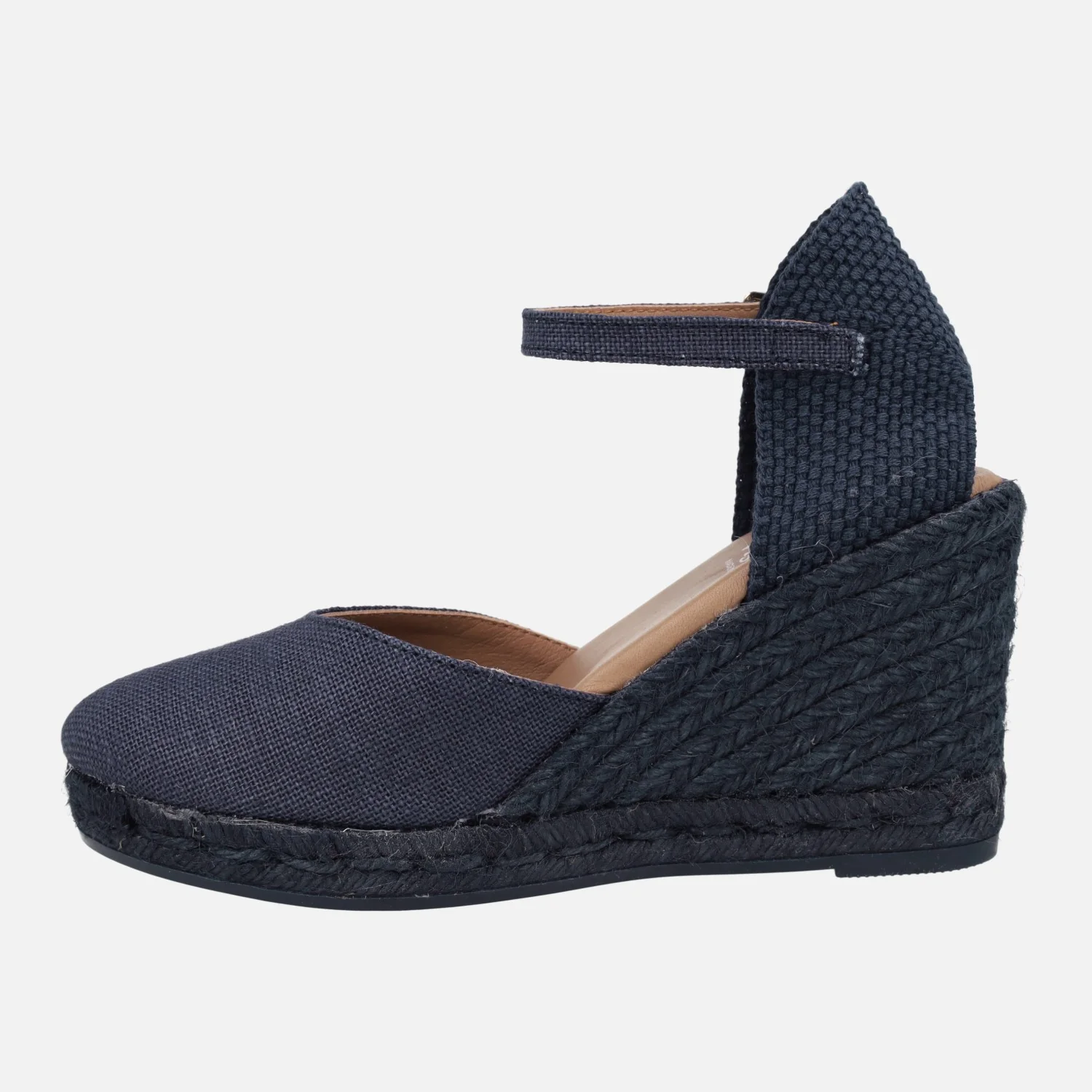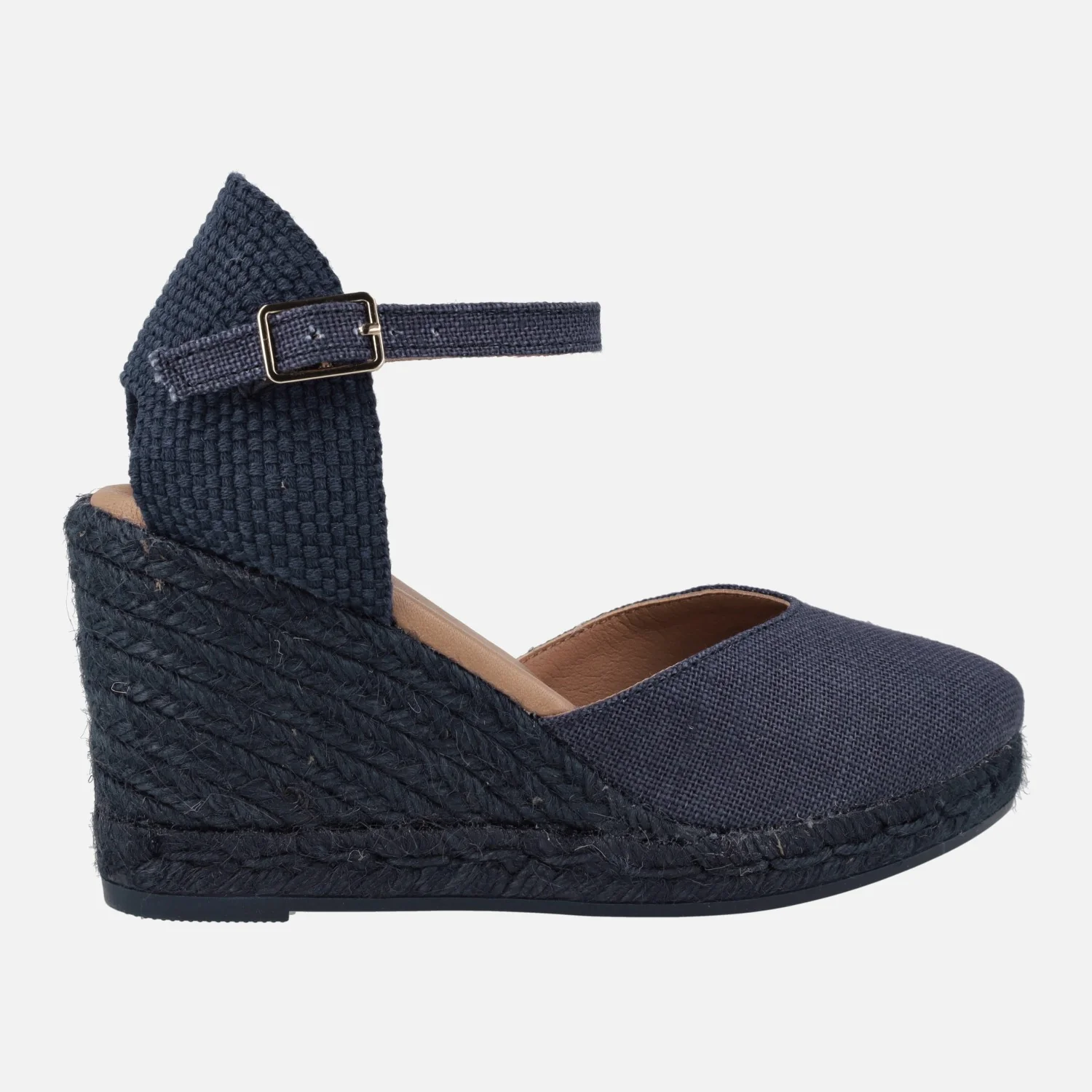 Preciosas alpargatas con cuña alta de la marca española Viguera modelo 2135. Disponibles en azul marino o taupe. Alpargatas elaboradas en tejido lino de primera calidad, con detalle de pulsera con cierre de hebilla al tobillo. Interior mixto de piel y tejido, con plantillas de piel acolchadas. Cuñas altas de esparto de 9 cms de altura en la parte trasera (2 cms de plataforma delantera). Made in Spain.