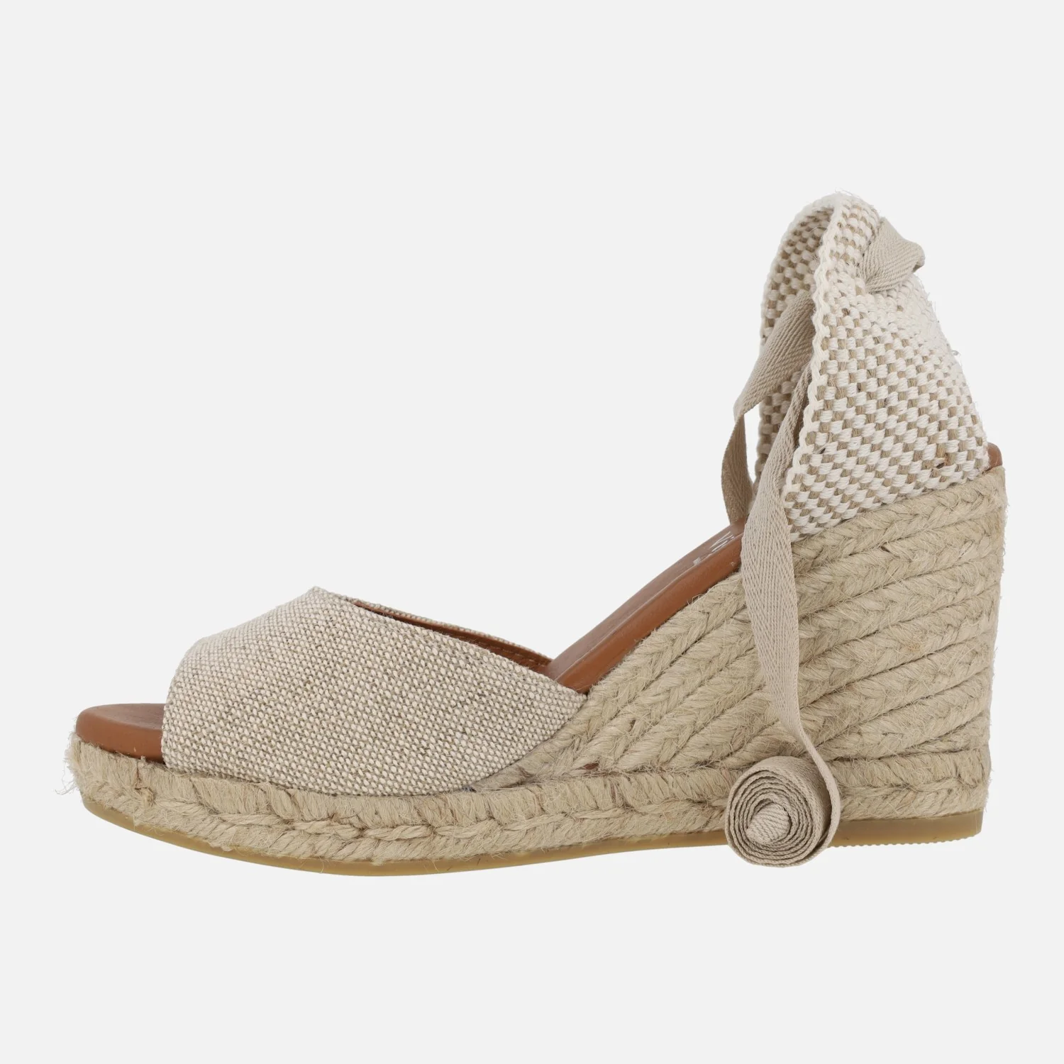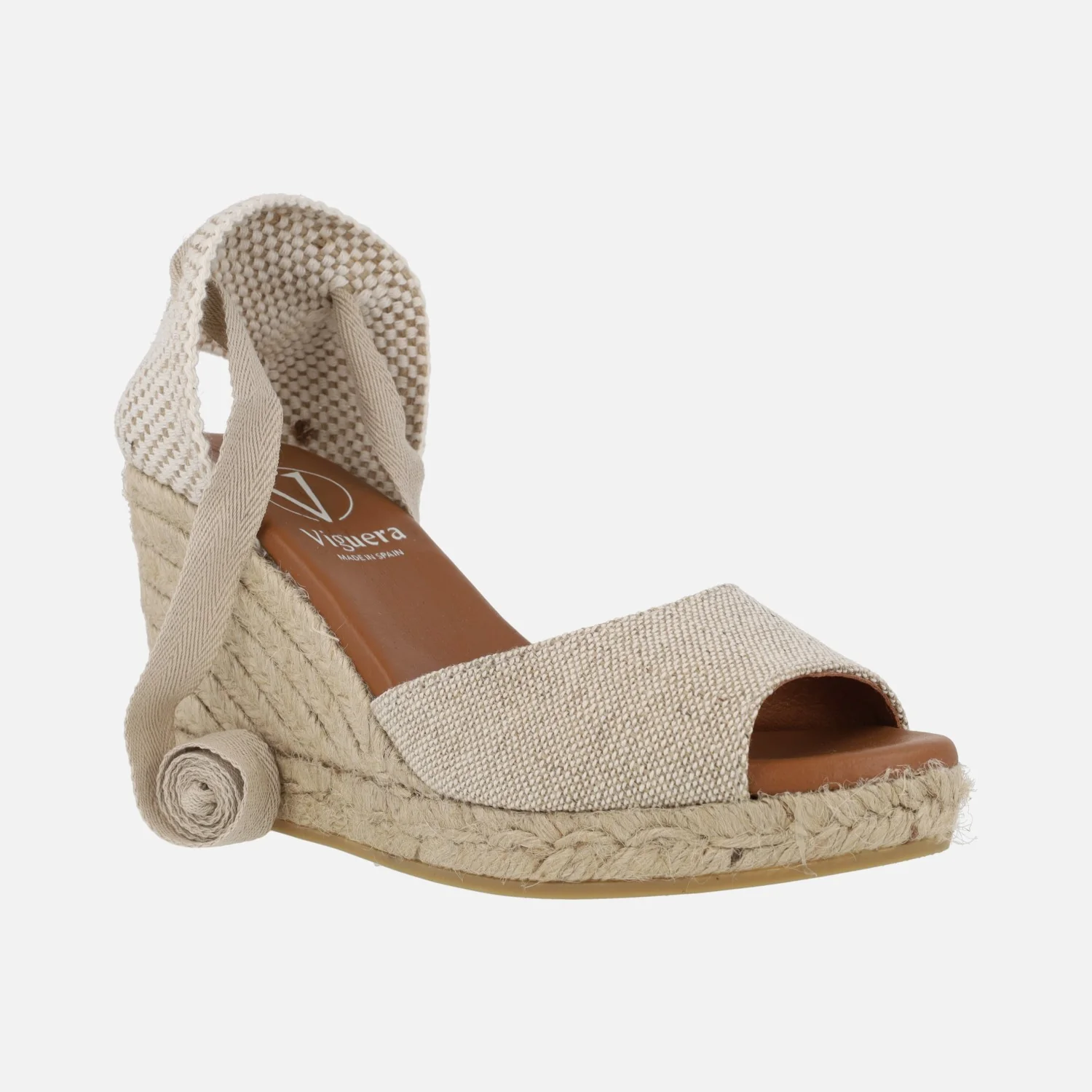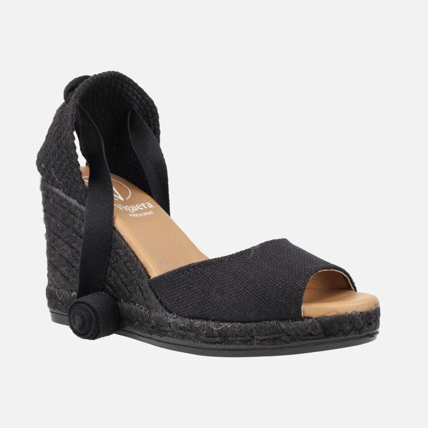 Preciosas alpargatas abiertas de puntera de la marca española Viguera modelo 2133. Disponibles en beige y en negro, alpargatas elaboradas en tejido lino de primera calidad, con detalle de cintas textiles para atar a la pierna o tobillo. Interior mixto de piel y tejido, con plantillas de piel acolchadas. Cuñas altas de esparto al tono, de casi 9 cms de altura en la parte trasera (2 cms de plataforma delantera). Made in Spain.