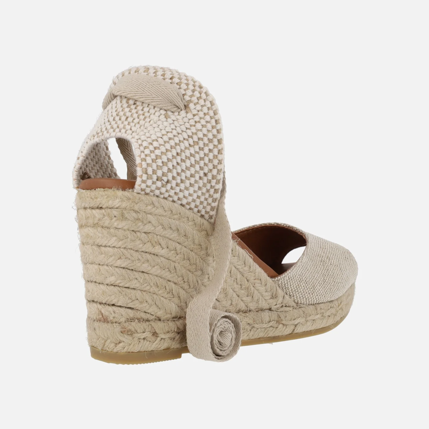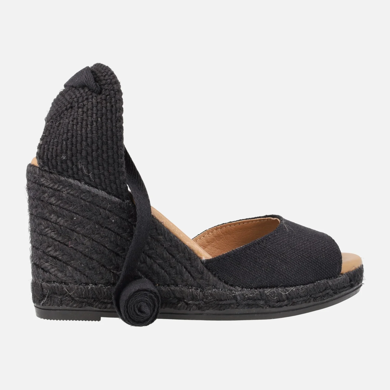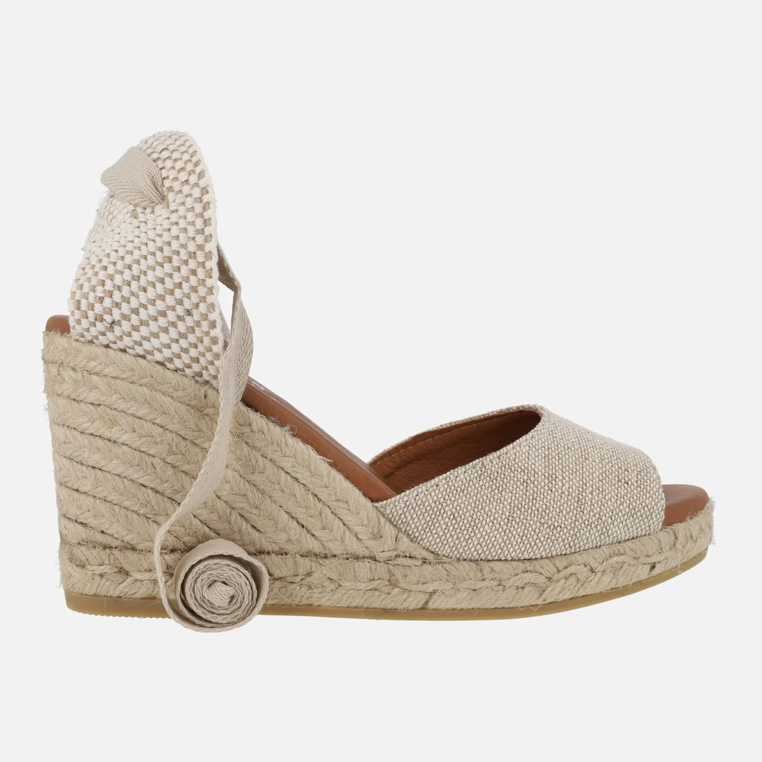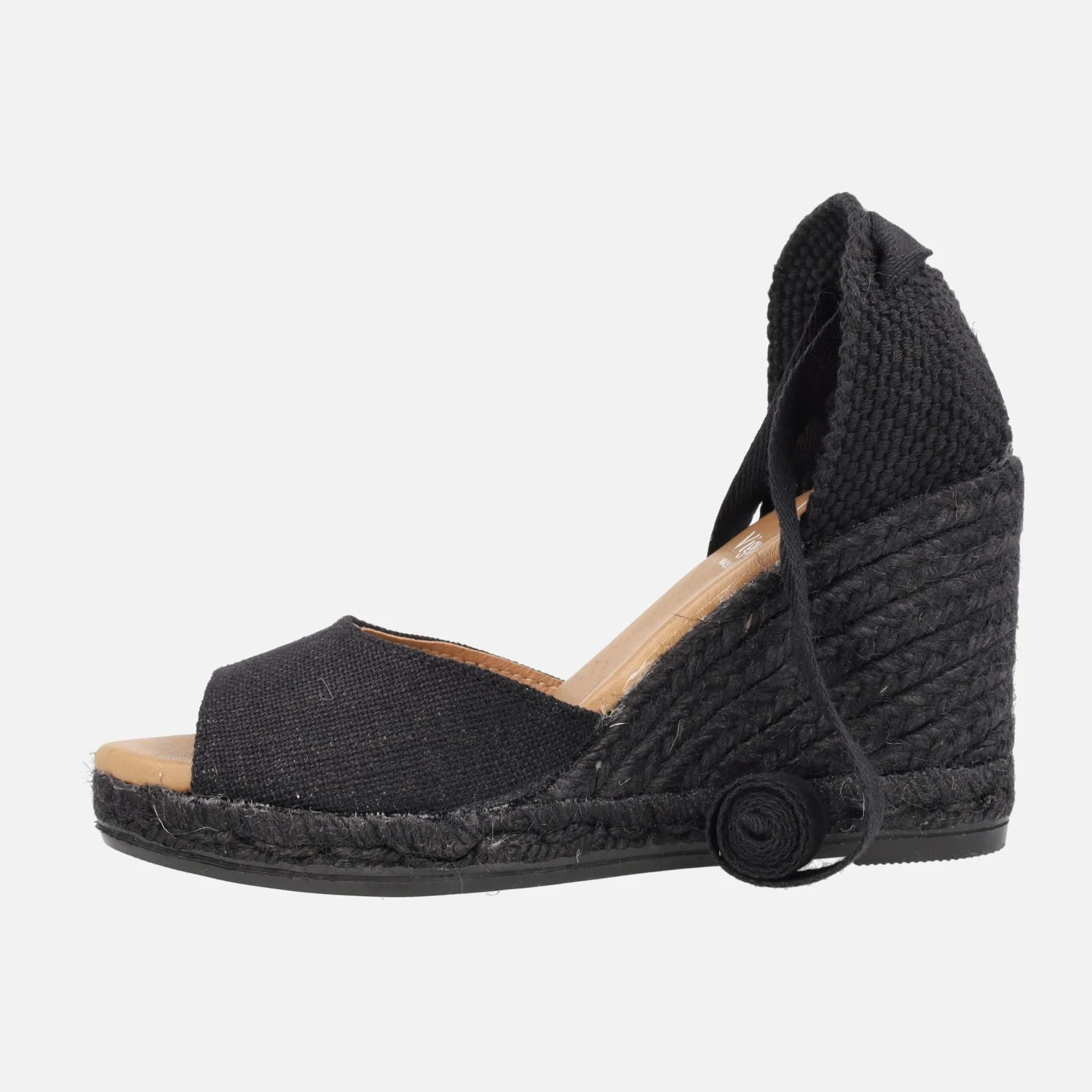 Preciosas alpargatas abiertas de puntera de la marca española Viguera modelo 2133. Disponibles en beige y en negro, alpargatas elaboradas en tejido lino de primera calidad, con detalle de cintas textiles para atar a la pierna o tobillo. Interior mixto de piel y tejido, con plantillas de piel acolchadas. Cuñas altas de esparto al tono, de casi 9 cms de altura en la parte trasera (2 cms de plataforma delantera). Made in Spain.