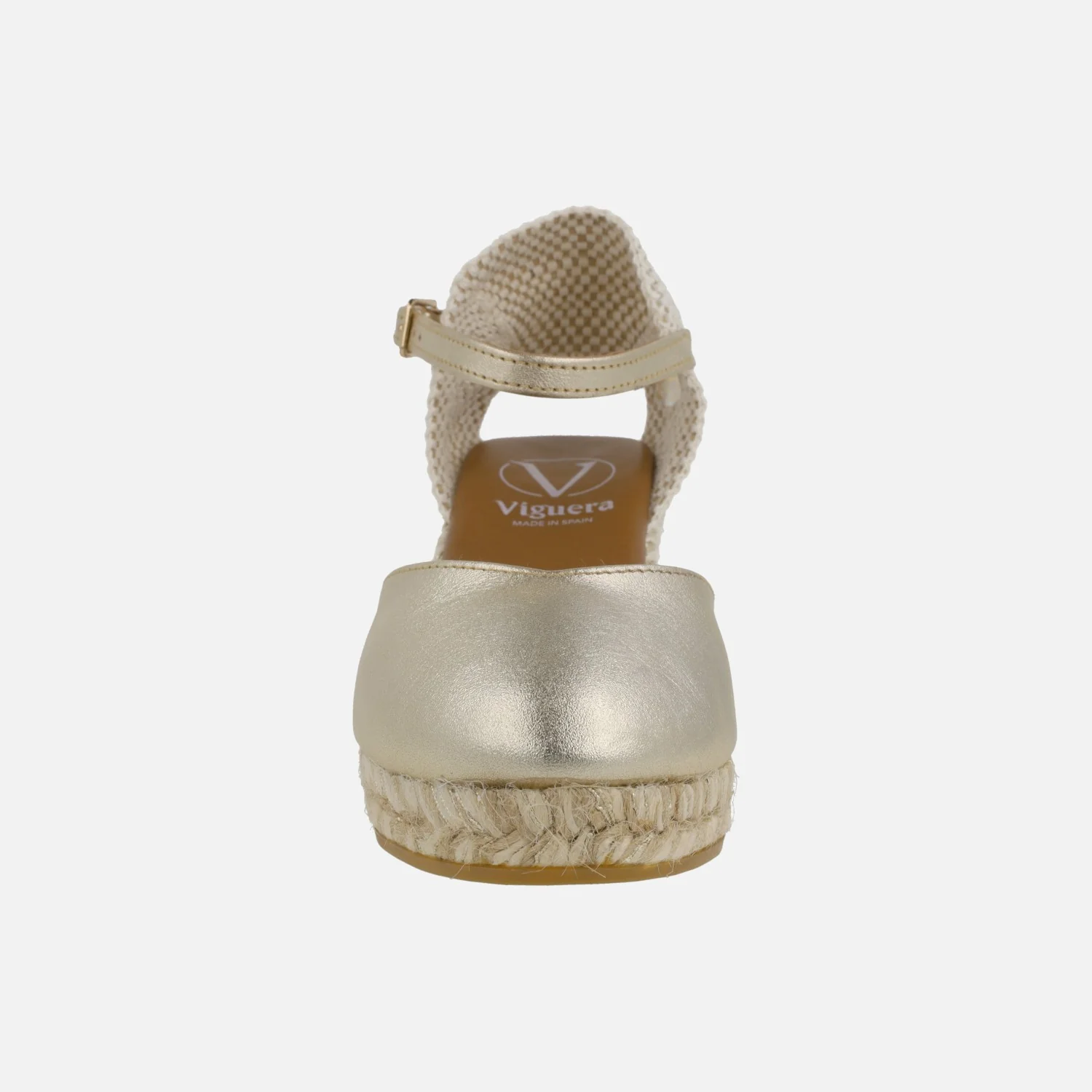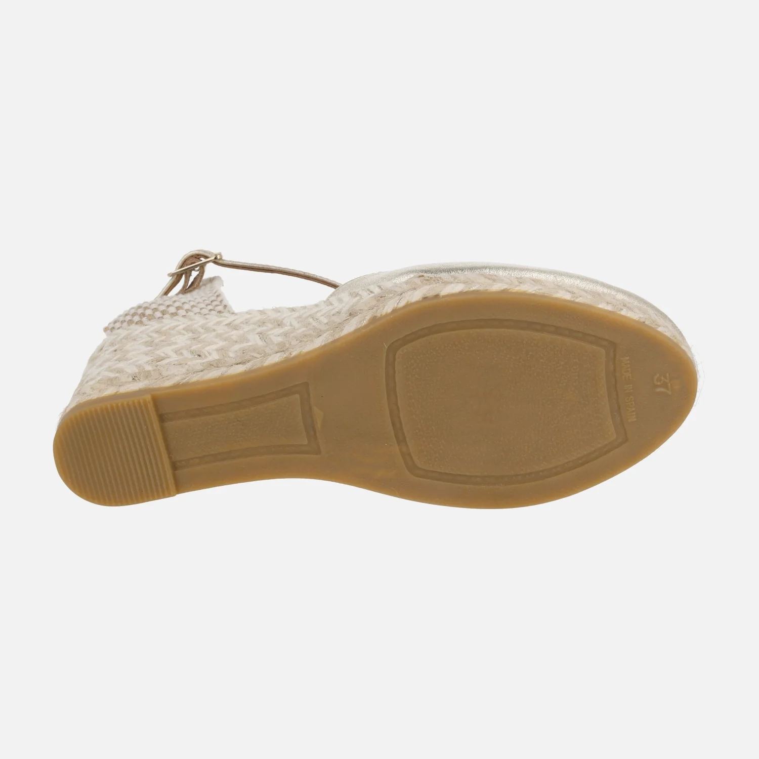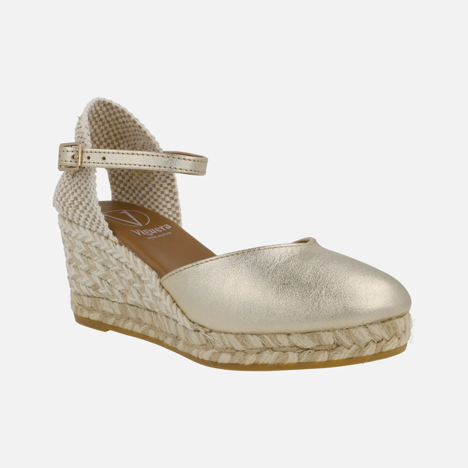 Elegantes zapatillas de esparto de la marca Viguera modelo 1983 Elista Sahara. Alpargatas elaboradas en piel dorada con talonera textil, pulsera al tobillo con cierre de hebilla. Interior mixto de piel y tejido. Cuña alta de esparto, en color natural con hilos dorados entrelazados, de una altura de 7 cms en la parte trasera (2 cms plataforma delantera).