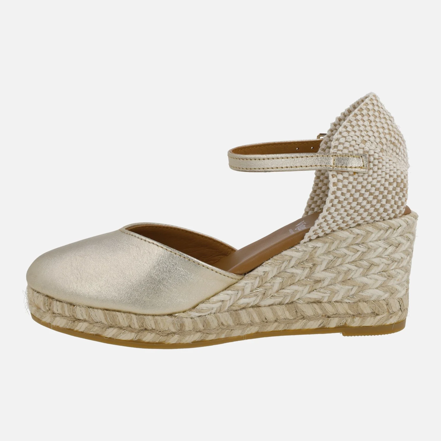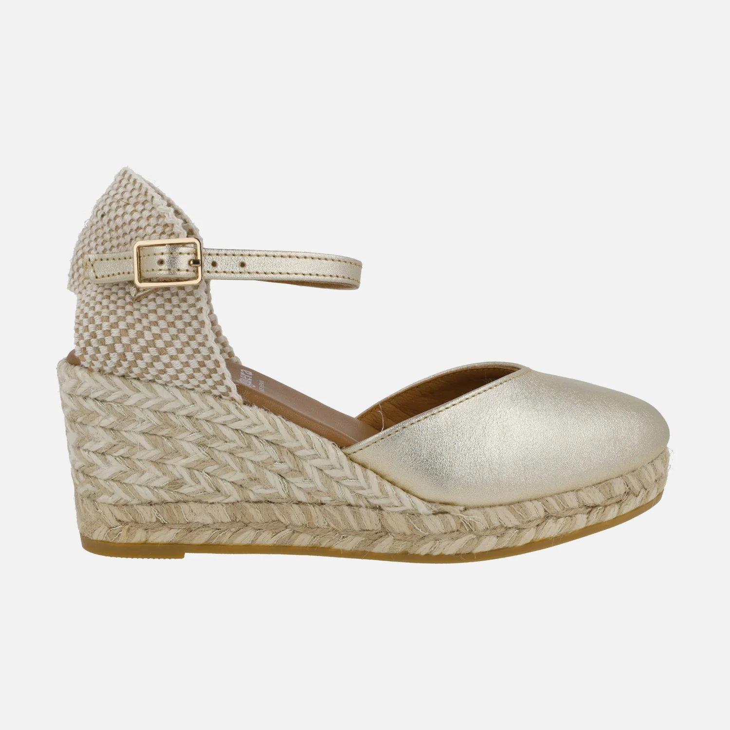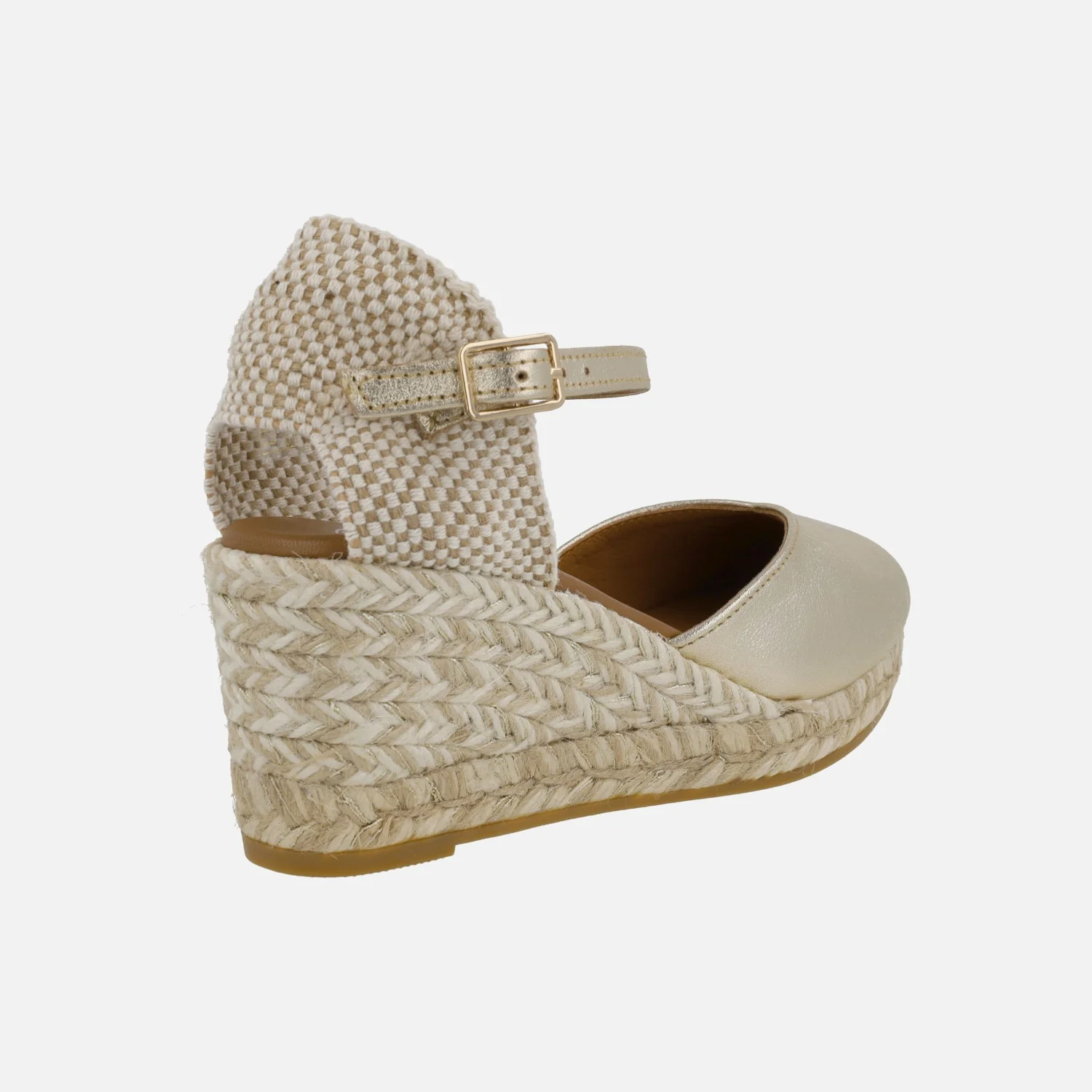 Elegantes zapatillas de esparto de la marca Viguera modelo 1983 Elista Sahara. Alpargatas elaboradas en piel dorada con talonera textil, pulsera al tobillo con cierre de hebilla. Interior mixto de piel y tejido. Cuña alta de esparto, en color natural con hilos dorados entrelazados, de una altura de 7 cms en la parte trasera (2 cms plataforma delantera).