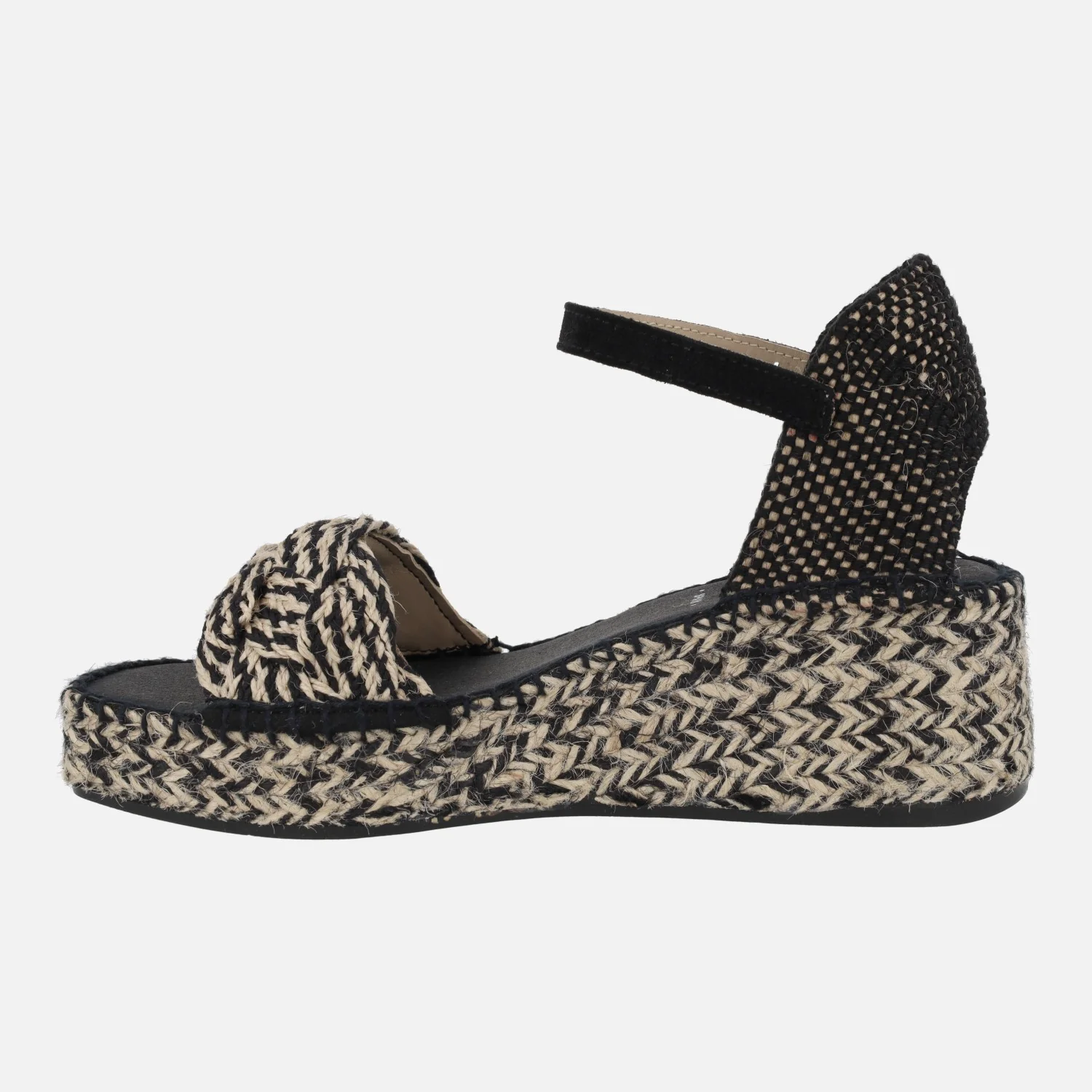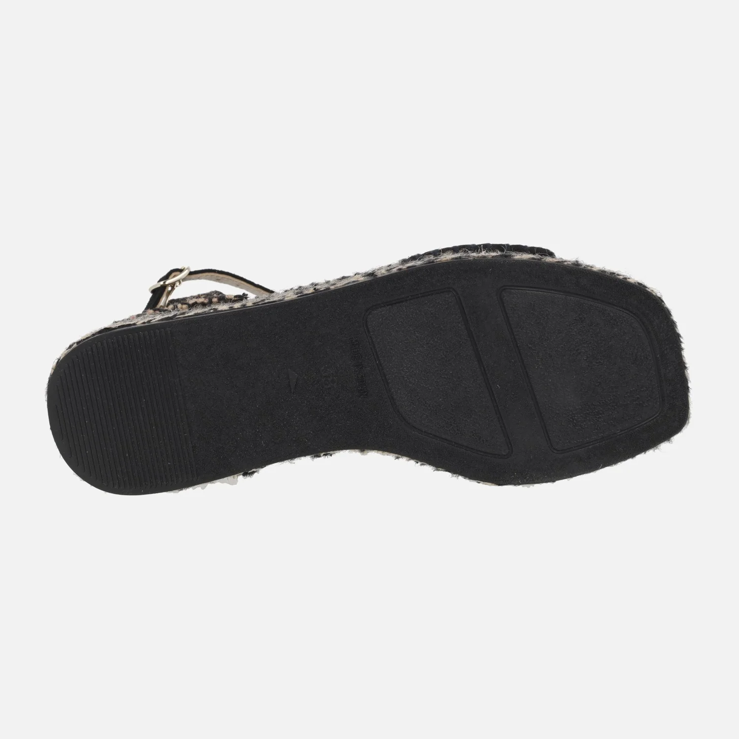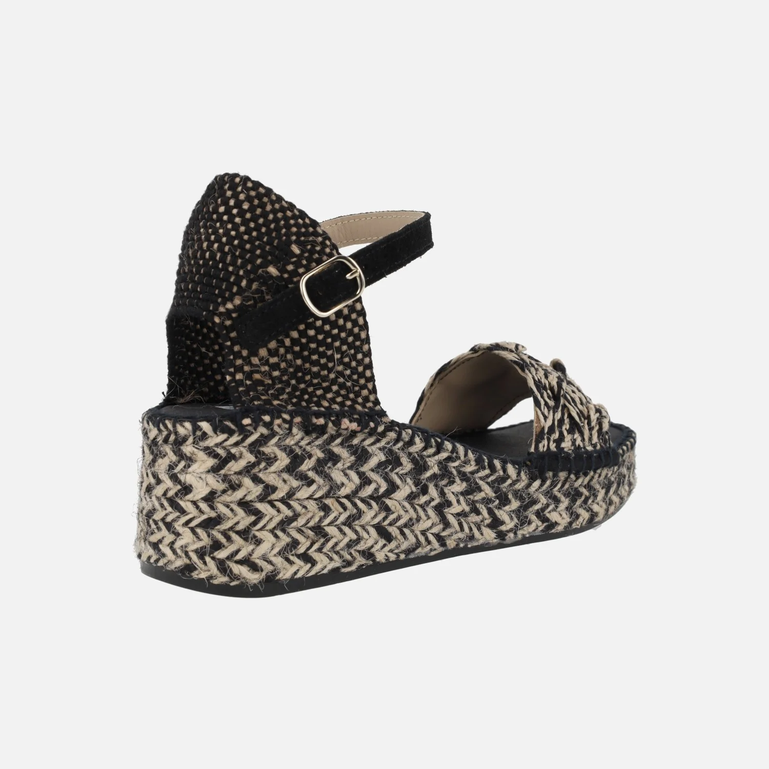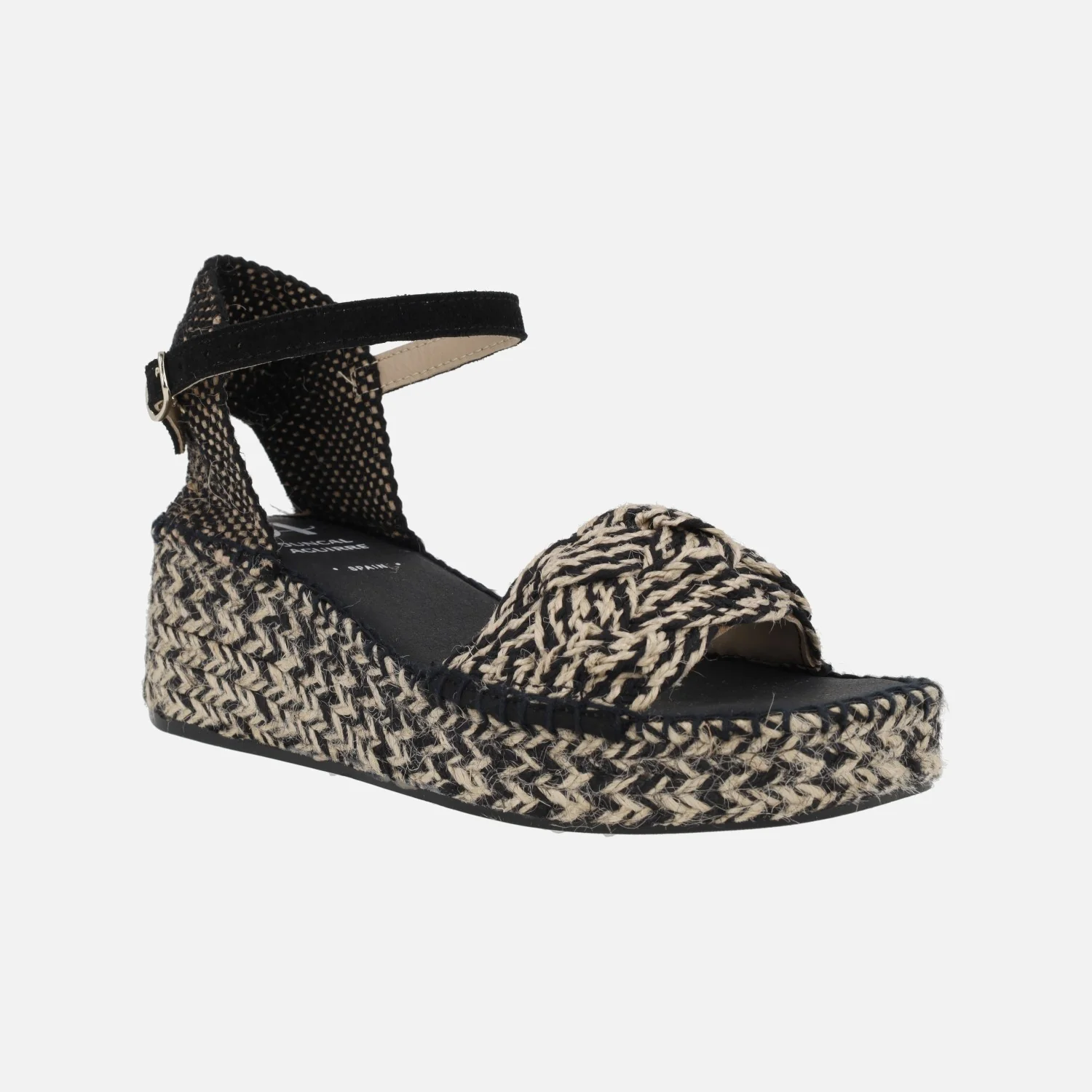 Zapatillas de esparto en combinado negro y beige de la marca Juncal aguirre modelo 2723. Alpargatas con parte delantera en rafia trenzada en beige y negro. Talonera textil con pulsera de serraje negro y cierre de hebilla al tobillo. Interior mixto en piel y tejido. Cuña de esparto, también en combinado negro y beige. Altura trasera 6 cms (3 cms parte delantera). Made in Spain.