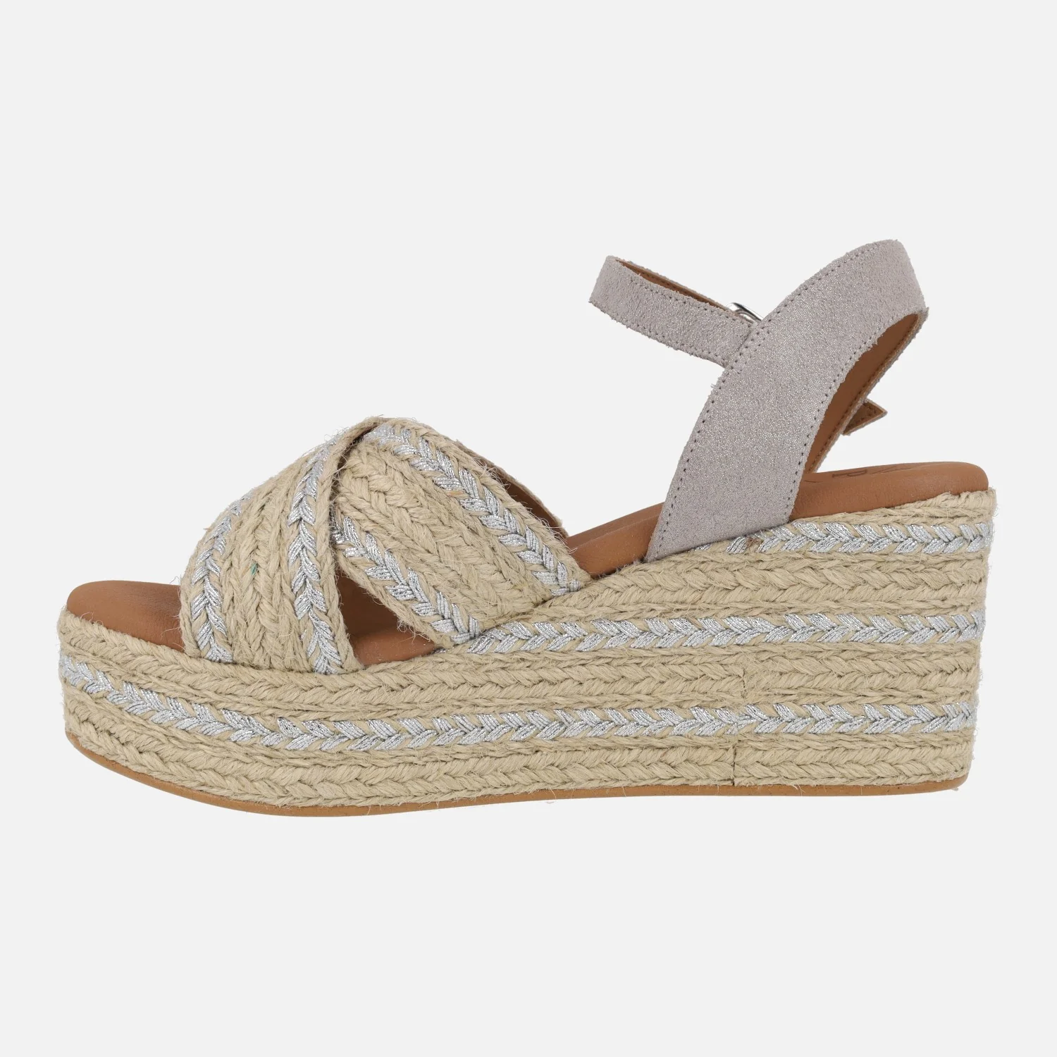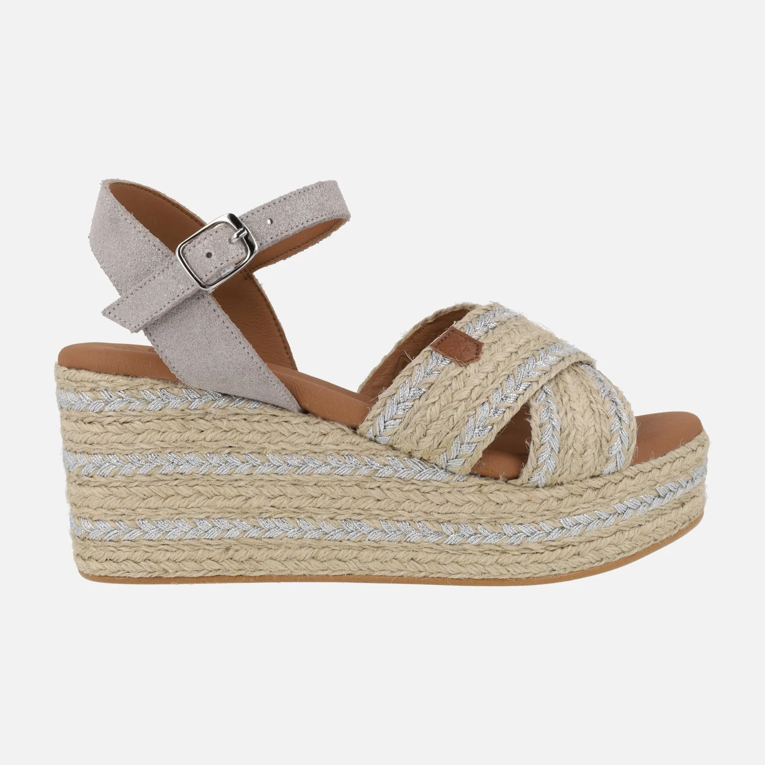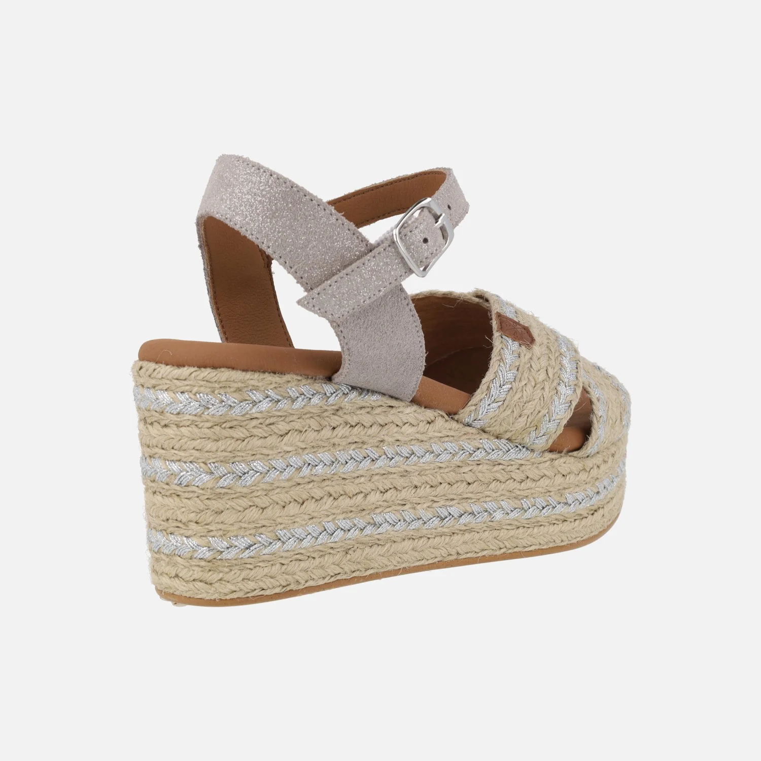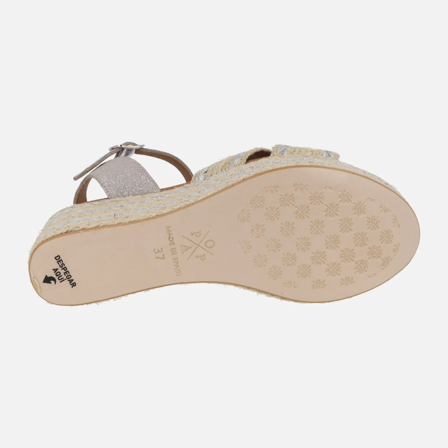 Alpargatas de tiras cruzadas Popa Benijo Sareal Plata. Elaboradas en rafia natural combinando beige y plata, con dos tiras que se cruzan en el empeine. Pulsera de piel serraje plateado que cierra al tobillo con una hebilla. Interior en piel vegana (sintéticos) con planta acolchada. Cuña alta de esparto, suela de goma. Altura trasera 8 cms (4 cms plataforma delantera). Made in Spain.