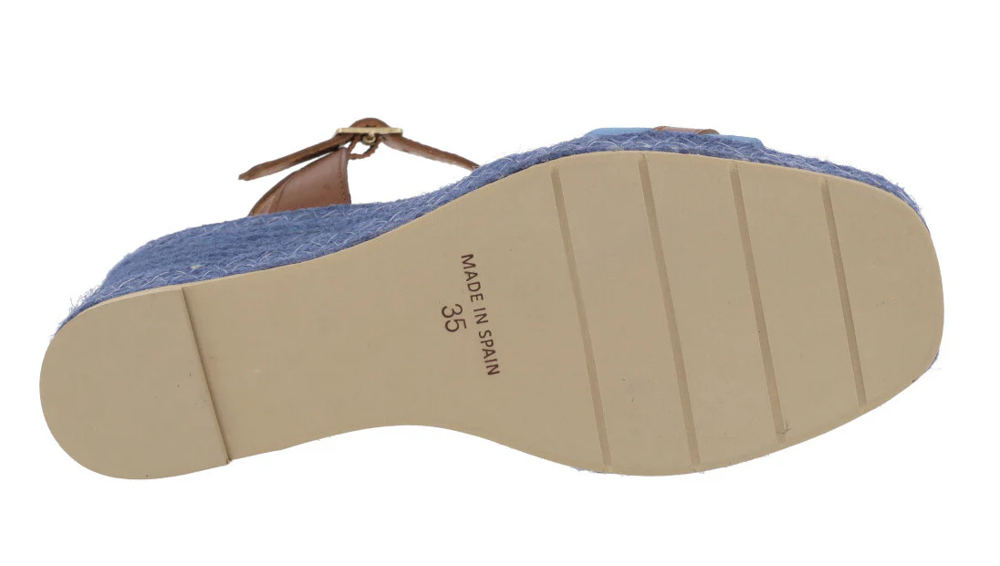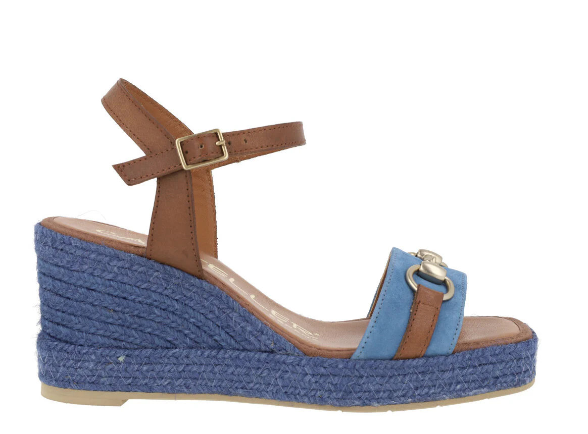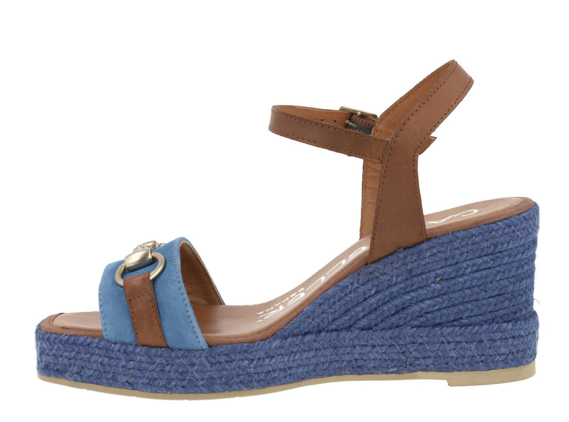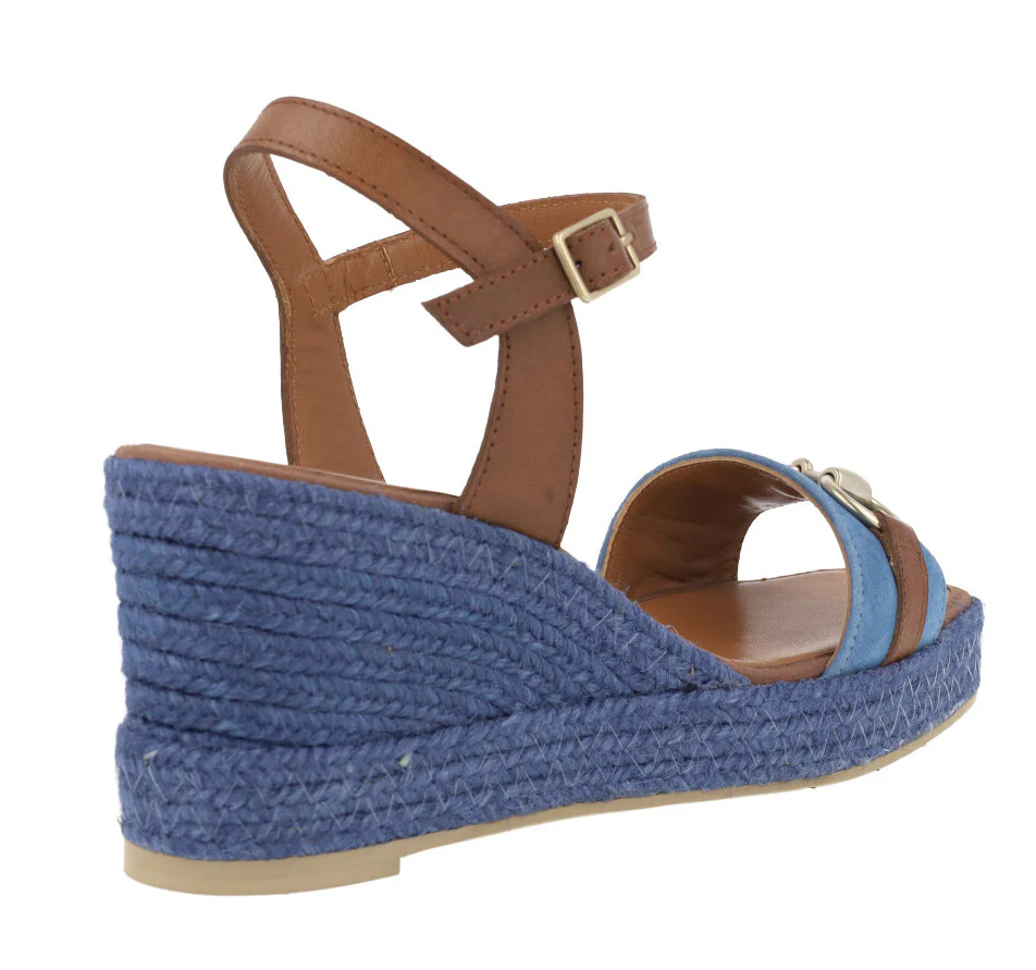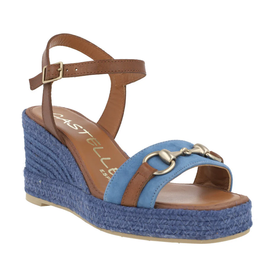 Alpargatas para mujer de la marca española Casteller, modelo 850 Azulón. Zapatillas combinadas en tonos azules y marrones, con adorno metálico color platino en la pala. Pulsera al tobillo con cierre de hebilla. Forro y planta de piel. Piso fino de goma. Cuñas de esparto en color azul, con una altura trasera de 7,5 cms (2 cms plataforma delantera). Fabricadas en España.