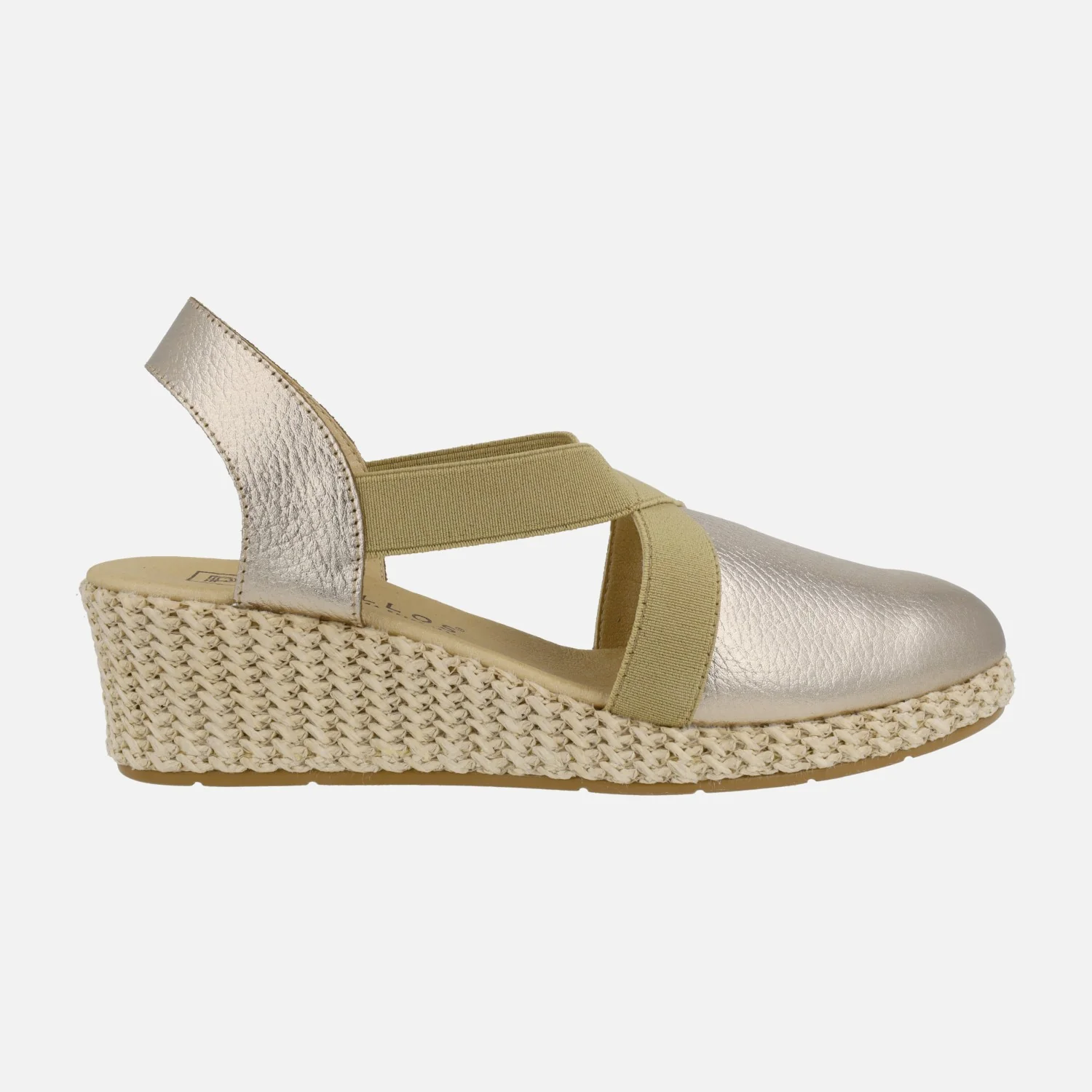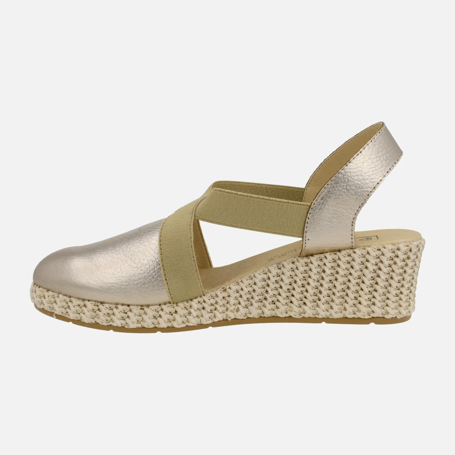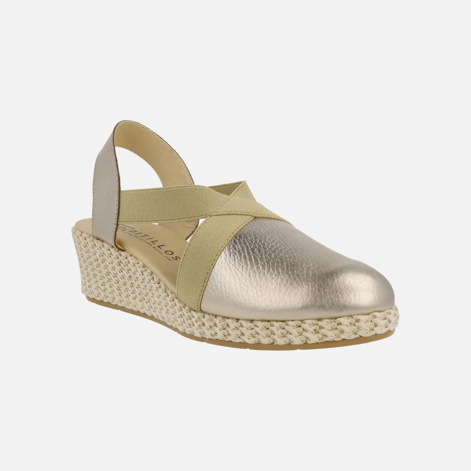 Zapatos confort para mujer de la marca Pitillos, modelo 10627 Oro. Alpargatas con cuña de rafia, cerradas de puntera y con tira al talón. Elaboradas en piel metalizada dorada combinada con tejido elástico, con tiras que cruzan el empeine y se ajustan de maravilla a tus pies. Interiores en tejido. Cuña de rafia de 5 cms de altura trasera (1 cm parte delantera).