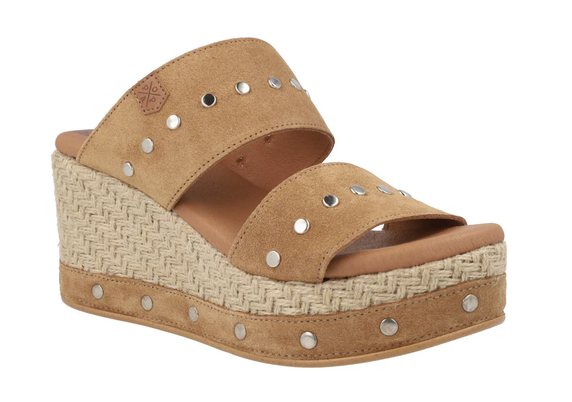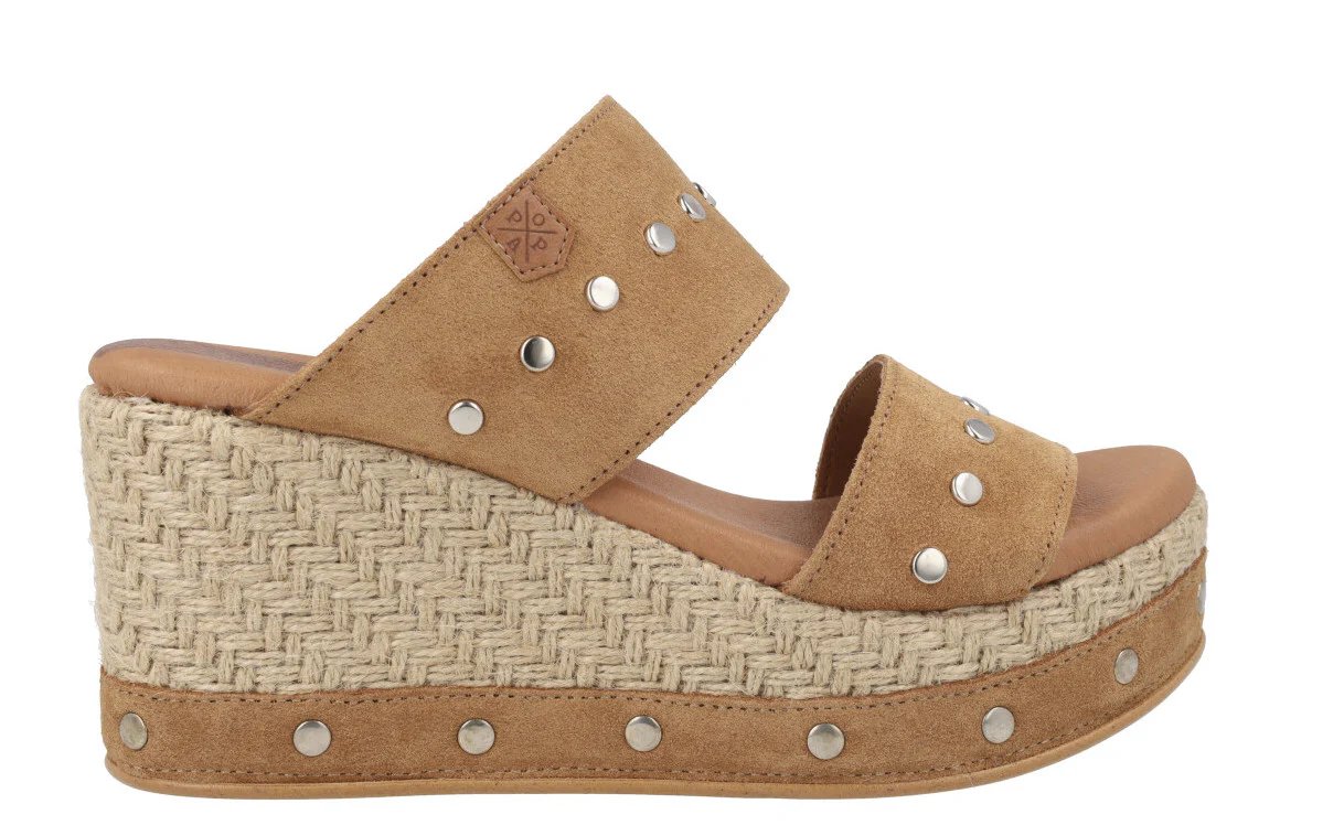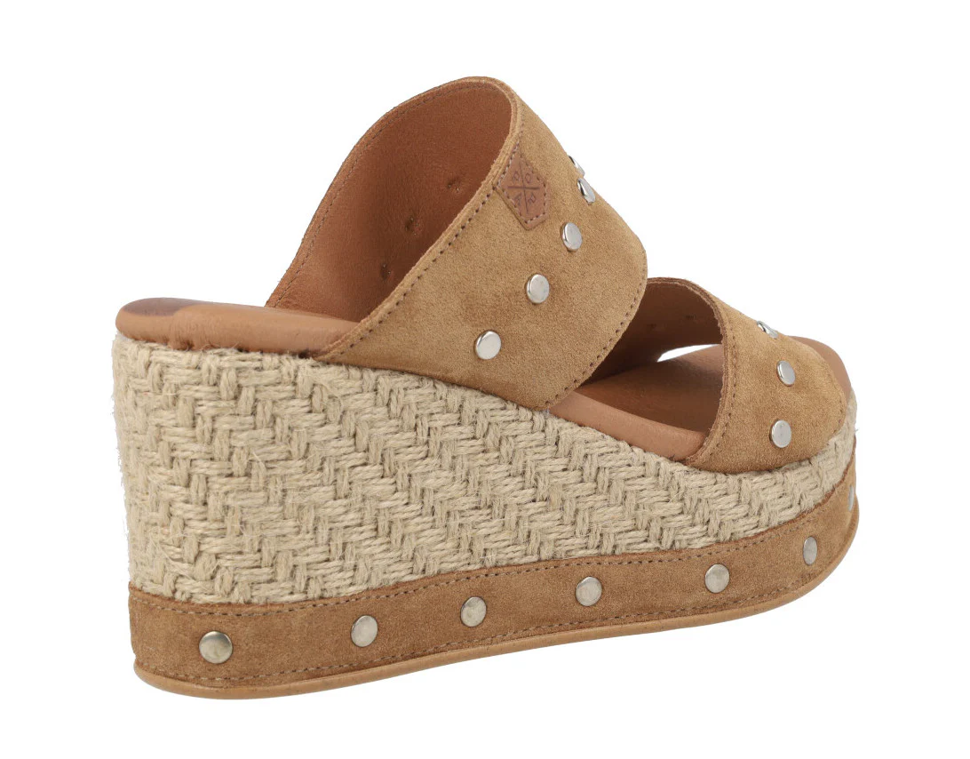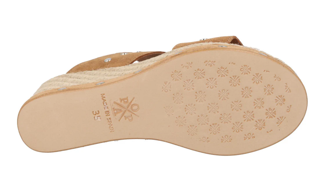Alpargatas Popa Marion cuero, con cuña alta y plataforma. Zapatillas de esparto estilo zueco, compuestas por dos tiras de ante color cuero con detalle de tachas metálicas. Cuña alta de esparto, de 8 cms de altura con tira baja de ante y remaches. Plataforma de 4 cms.