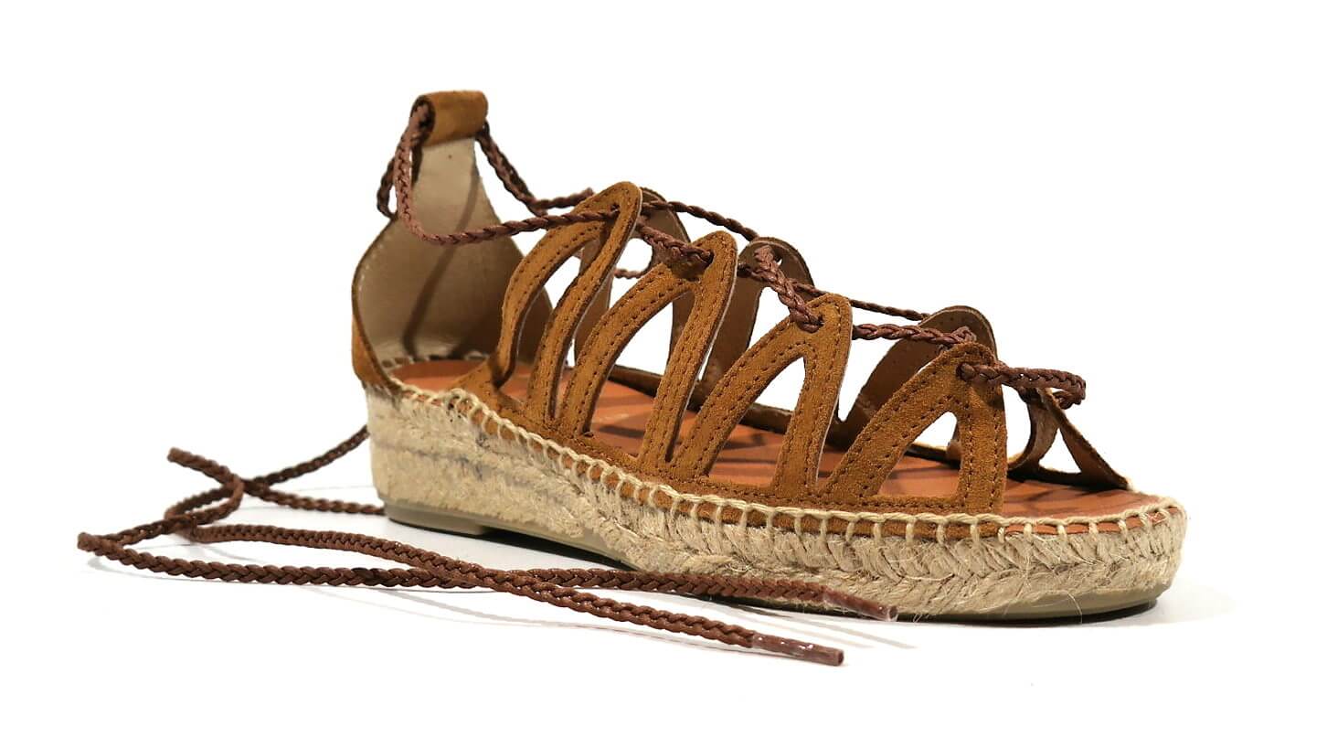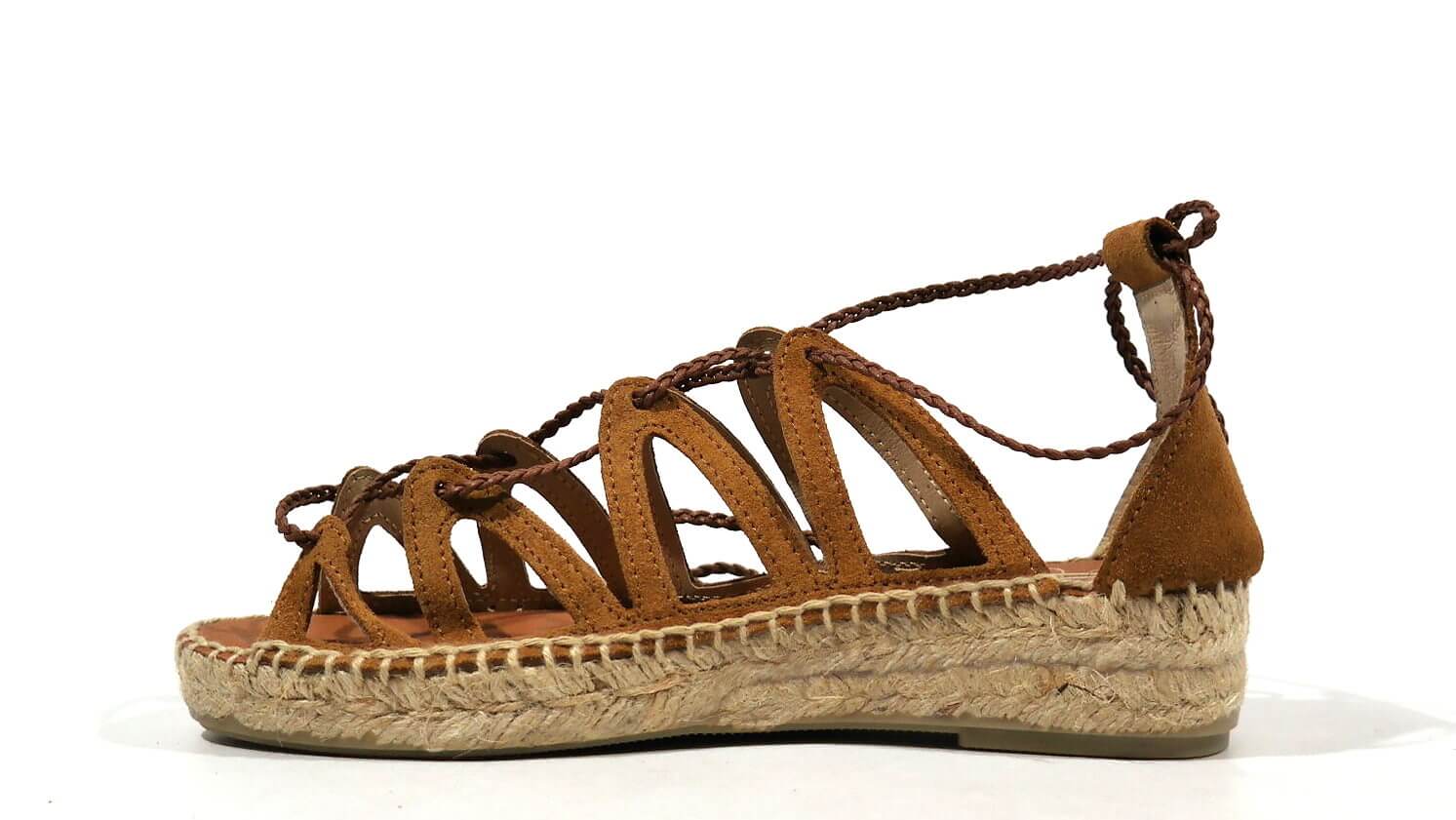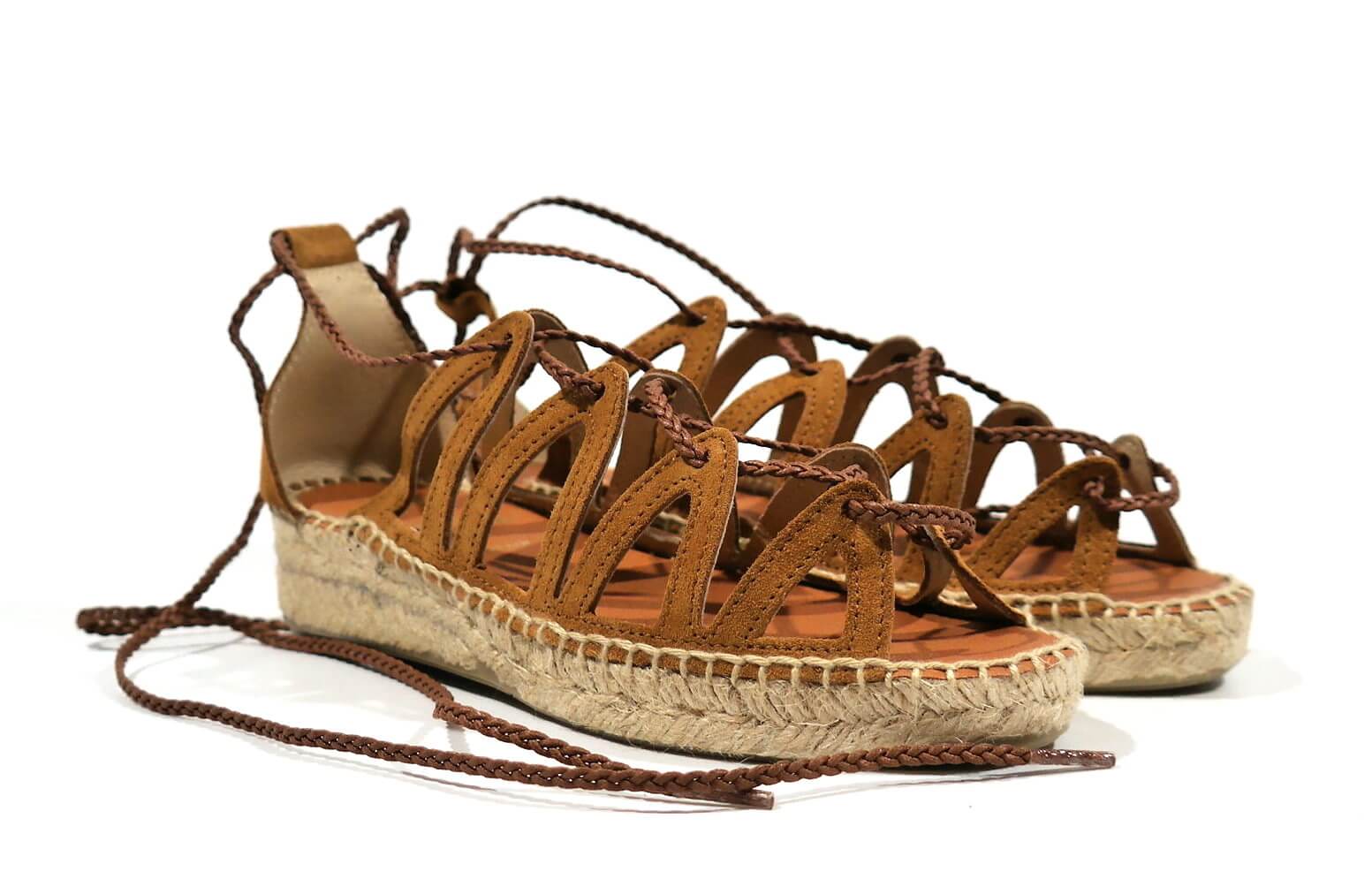 Sandalias romanas Juncal Aguirre modelo Pizarra 1927 Honey. Sandalias realizadas en serraje cuero, con cintas que cruzan y atan a la pierna o tobillo. Talón cerrado. Forro de piel, planta de microfibra. Piso de esparto con base de goma, con una altura de 4 cms en la parte de atrás (2,5 en la parte delantera). Made in Spain.