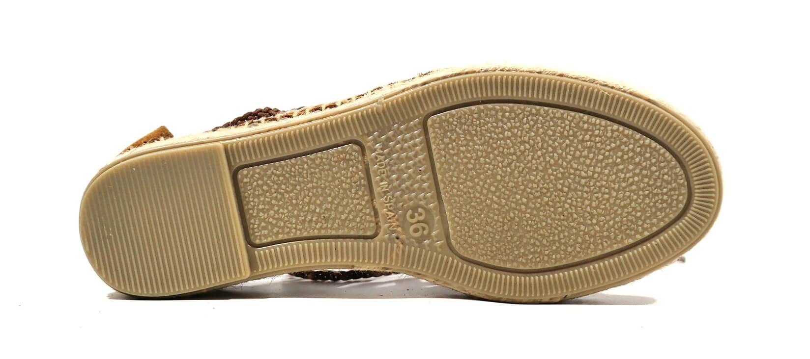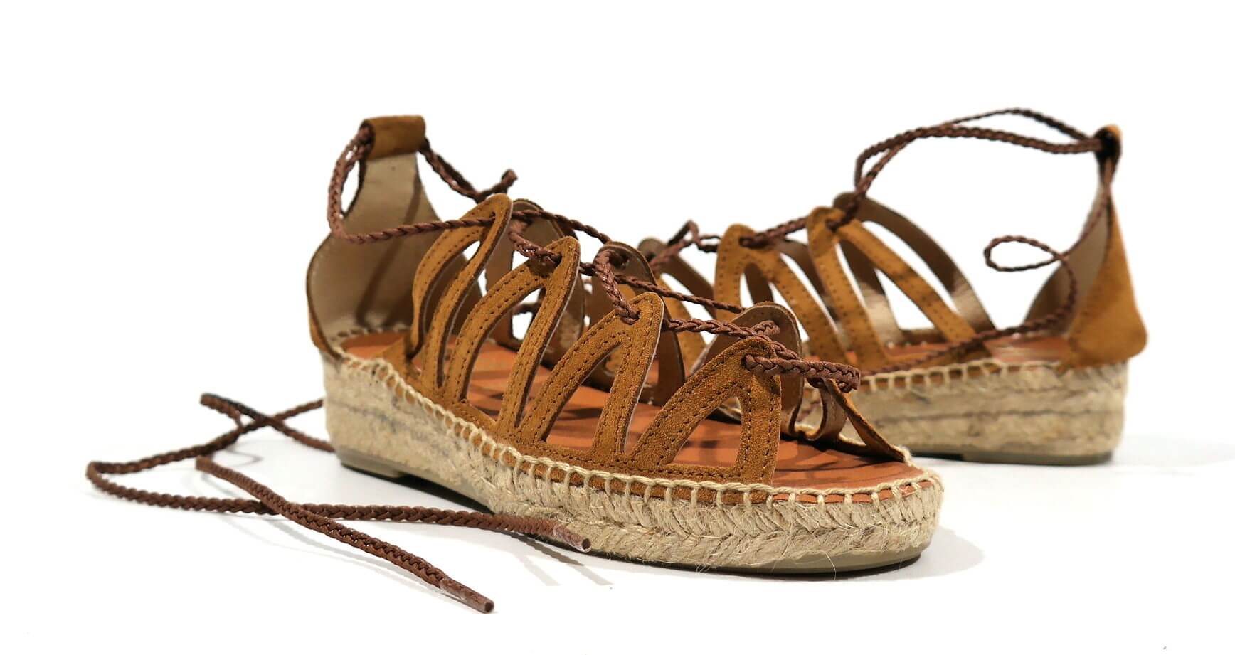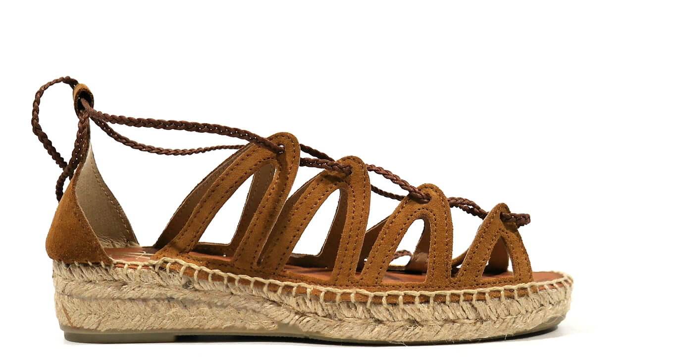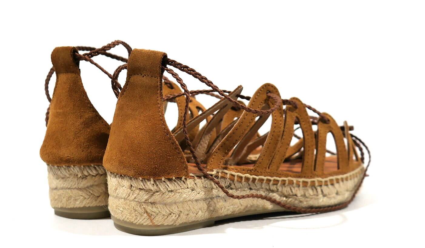 Sandalias romanas Juncal Aguirre modelo Pizarra 1927 Honey. Sandalias realizadas en serraje cuero, con cintas que cruzan y atan a la pierna o tobillo. Talón cerrado. Forro de piel, planta de microfibra. Piso de esparto con base de goma, con una altura de 4 cms en la parte de atrás (2,5 en la parte delantera). Made in Spain.