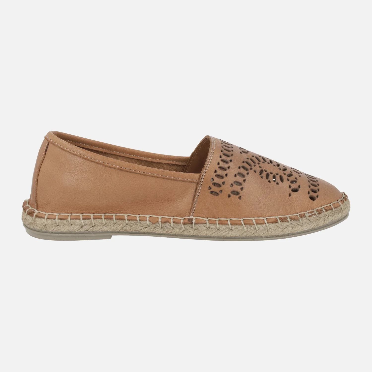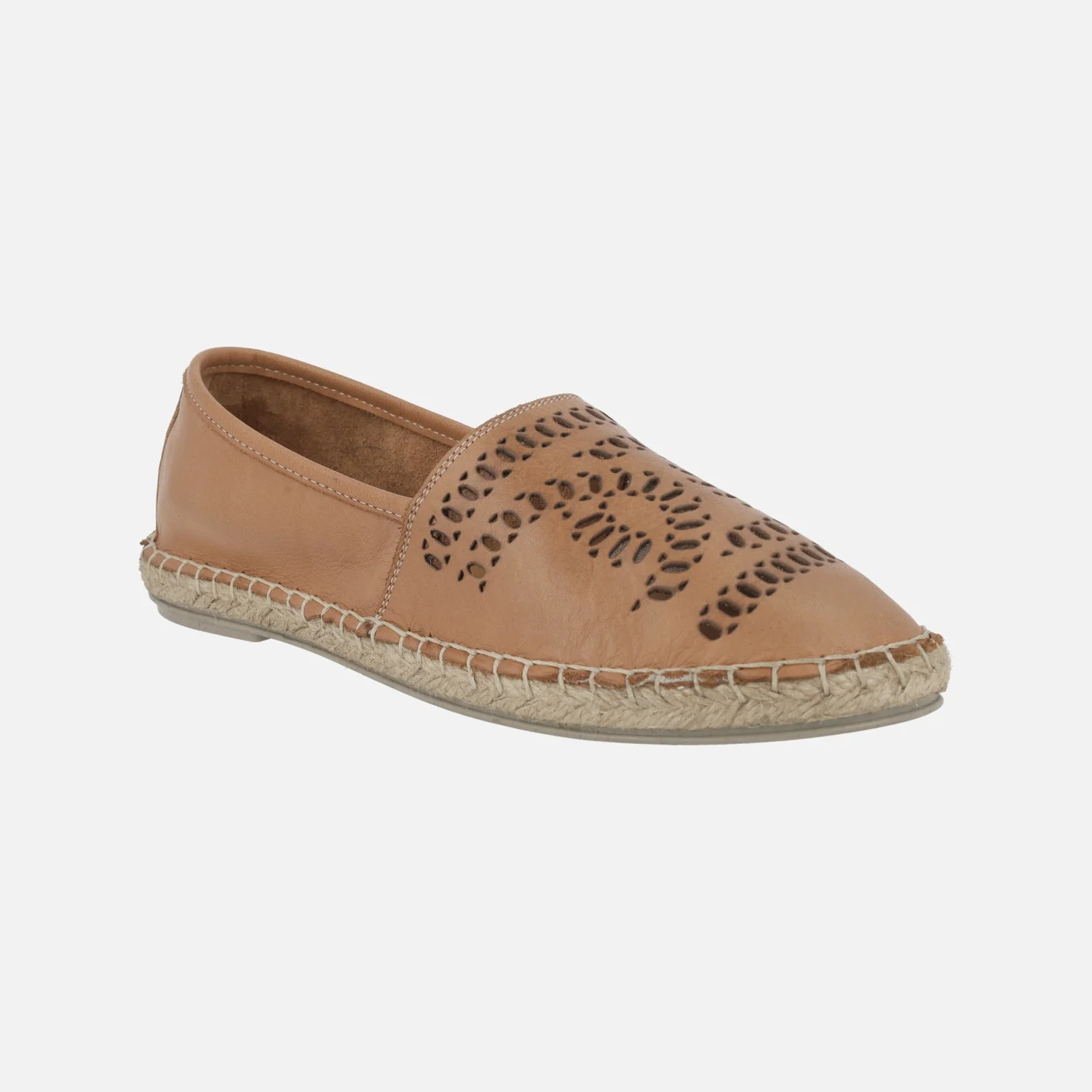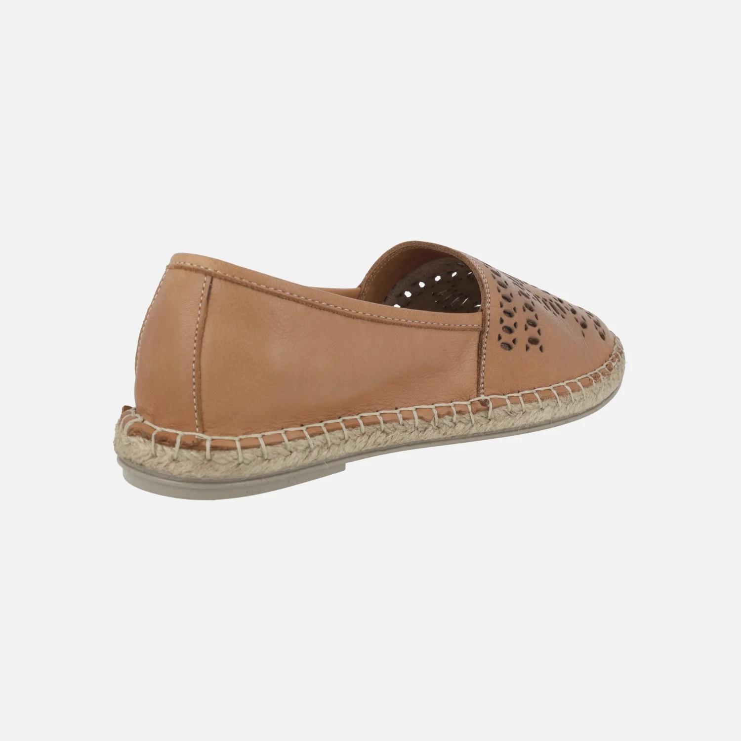 Alpargatas planas de piel modelo ZOE de la marca Top3. Zapatillas de estilo camping elaboradas en piel cuero con dibujos troquelados en la pala. Interiores en piel. Entre suela de esparto y suela de goma. Altura del piso aproximadamente 2 cms.