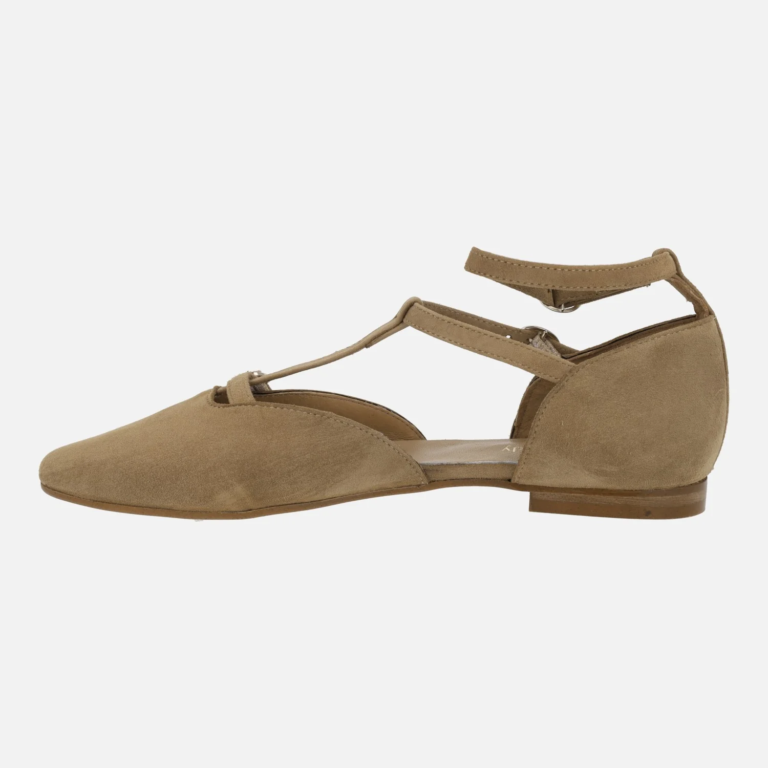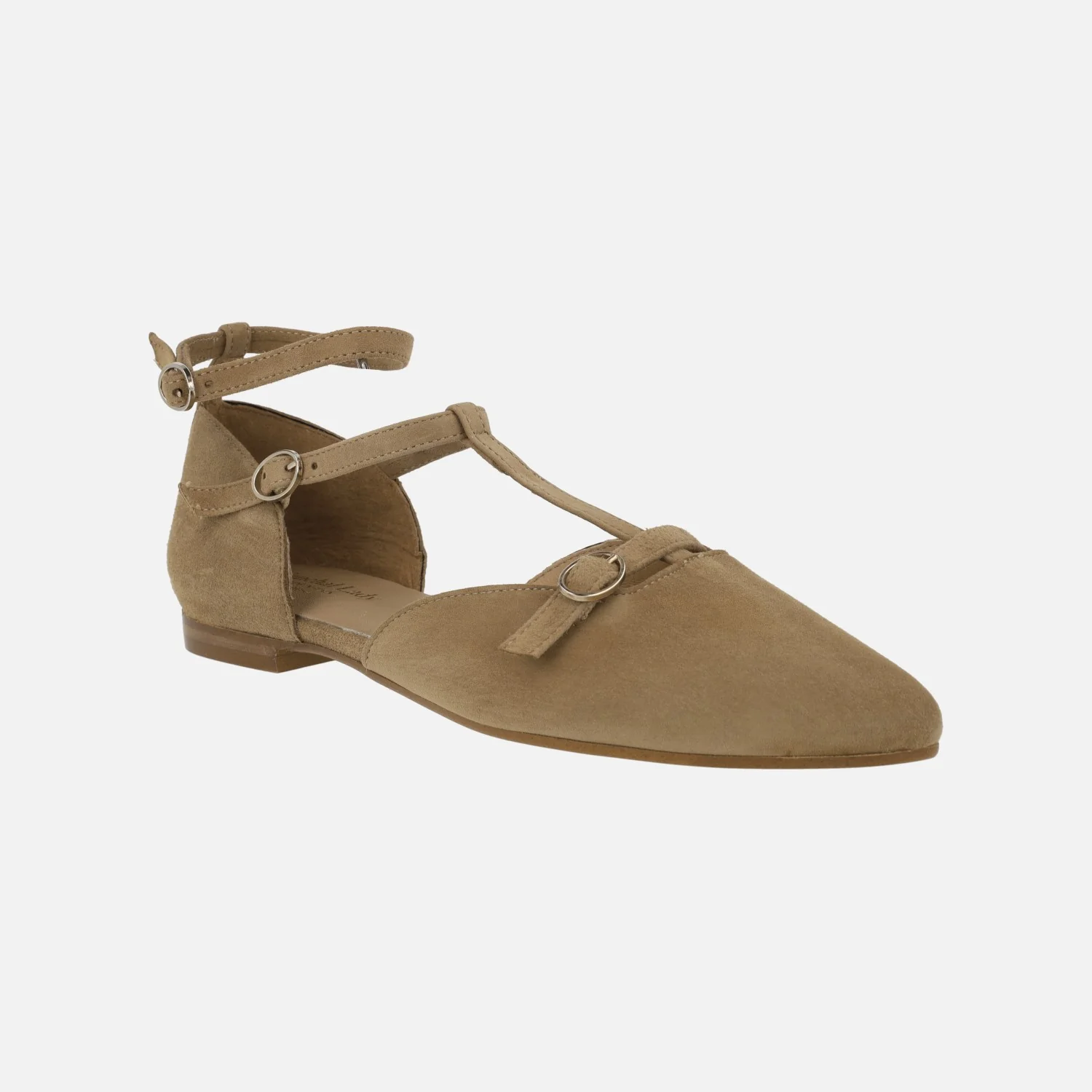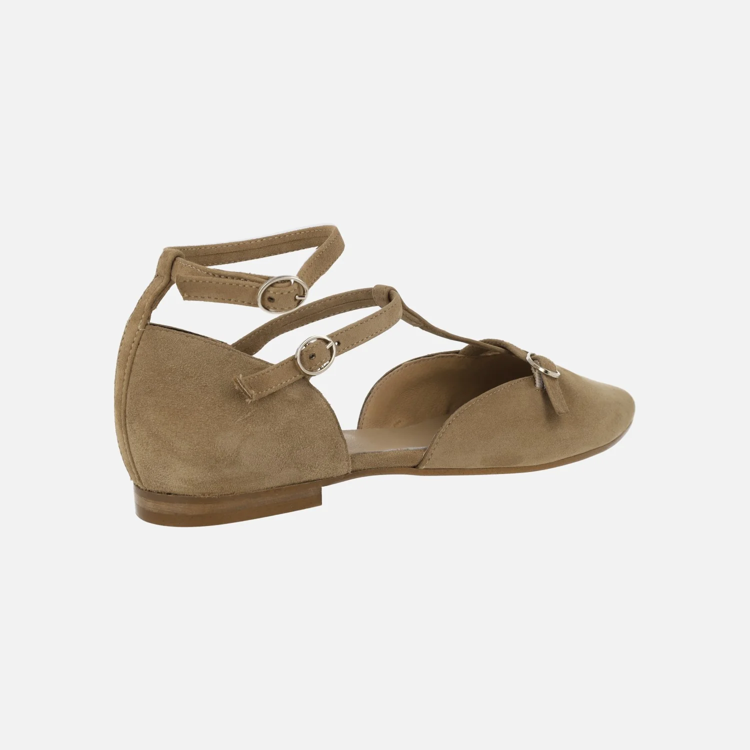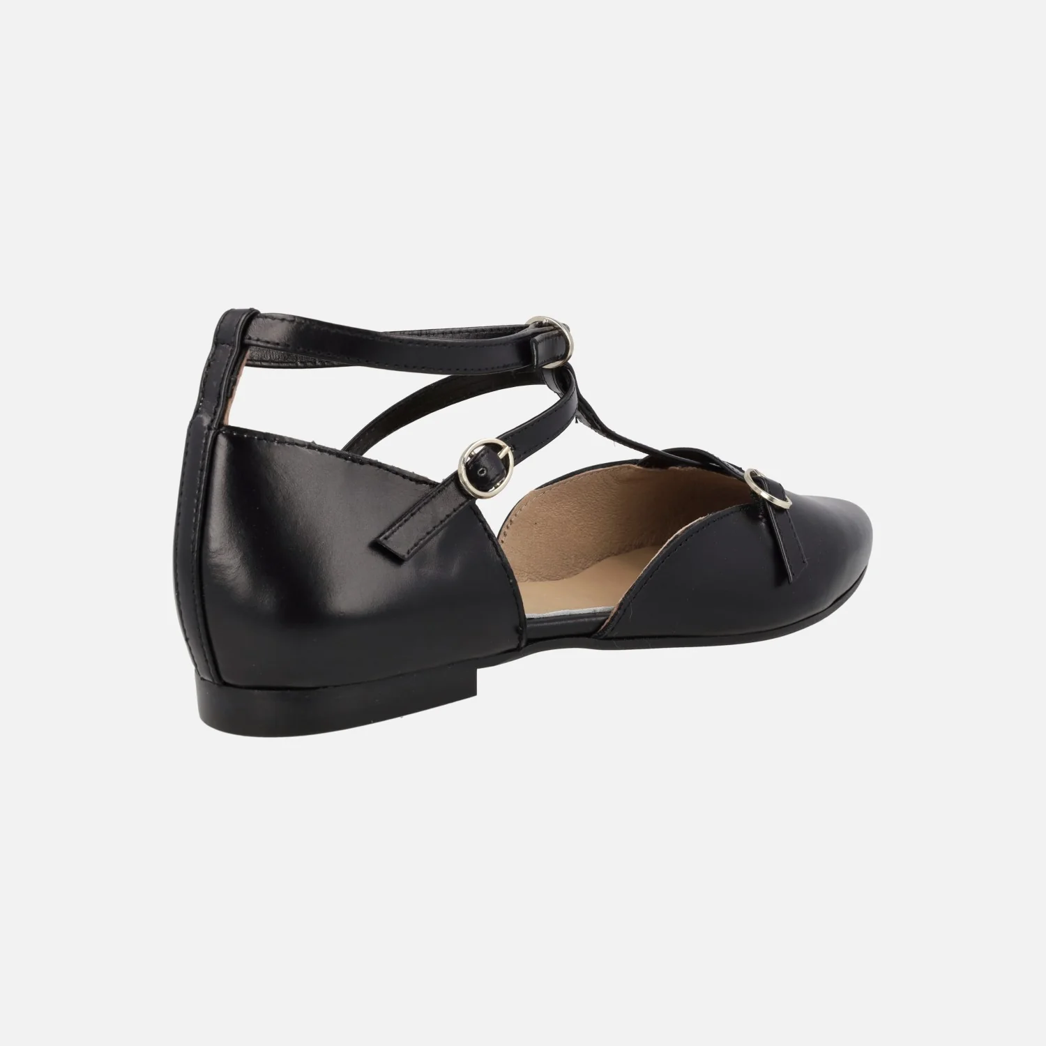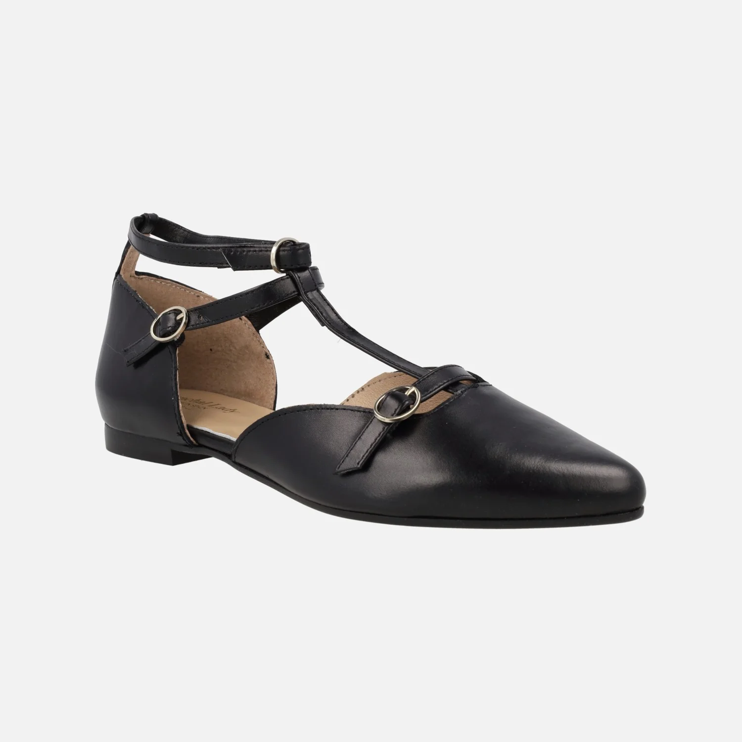 Bailarinas de piel de la marca Funchal lady modelo 7202. Bailarinas abiertas por los laterales, con varias pulseras con cierre de hebilla (una al tobillo, otra al empeine y otra en la puntera). Forro y planta de piel. Piso plano, de apenas 1 cm de altura. Disponibles en piel negra y en serraje camel. Made in Spain.