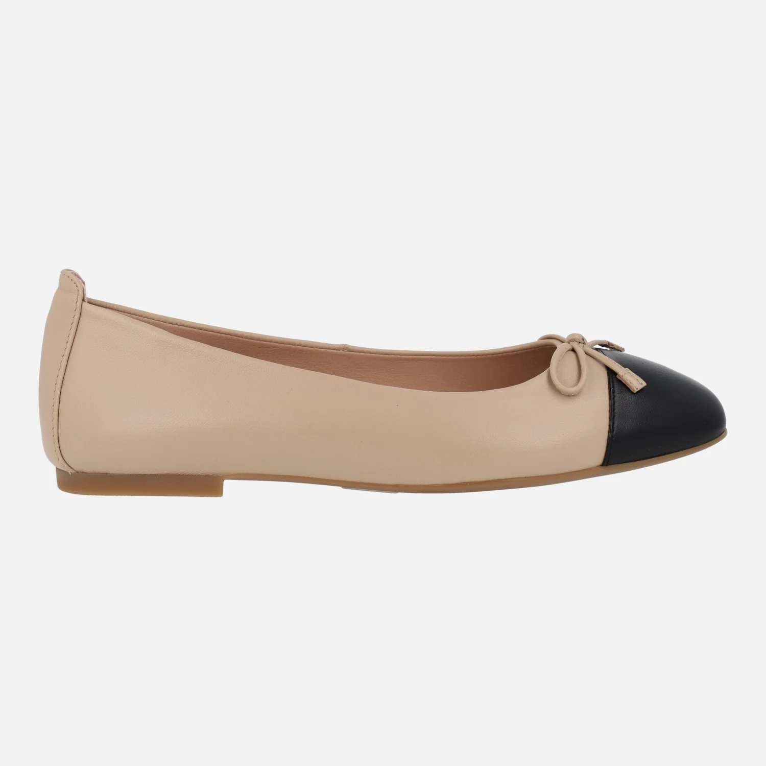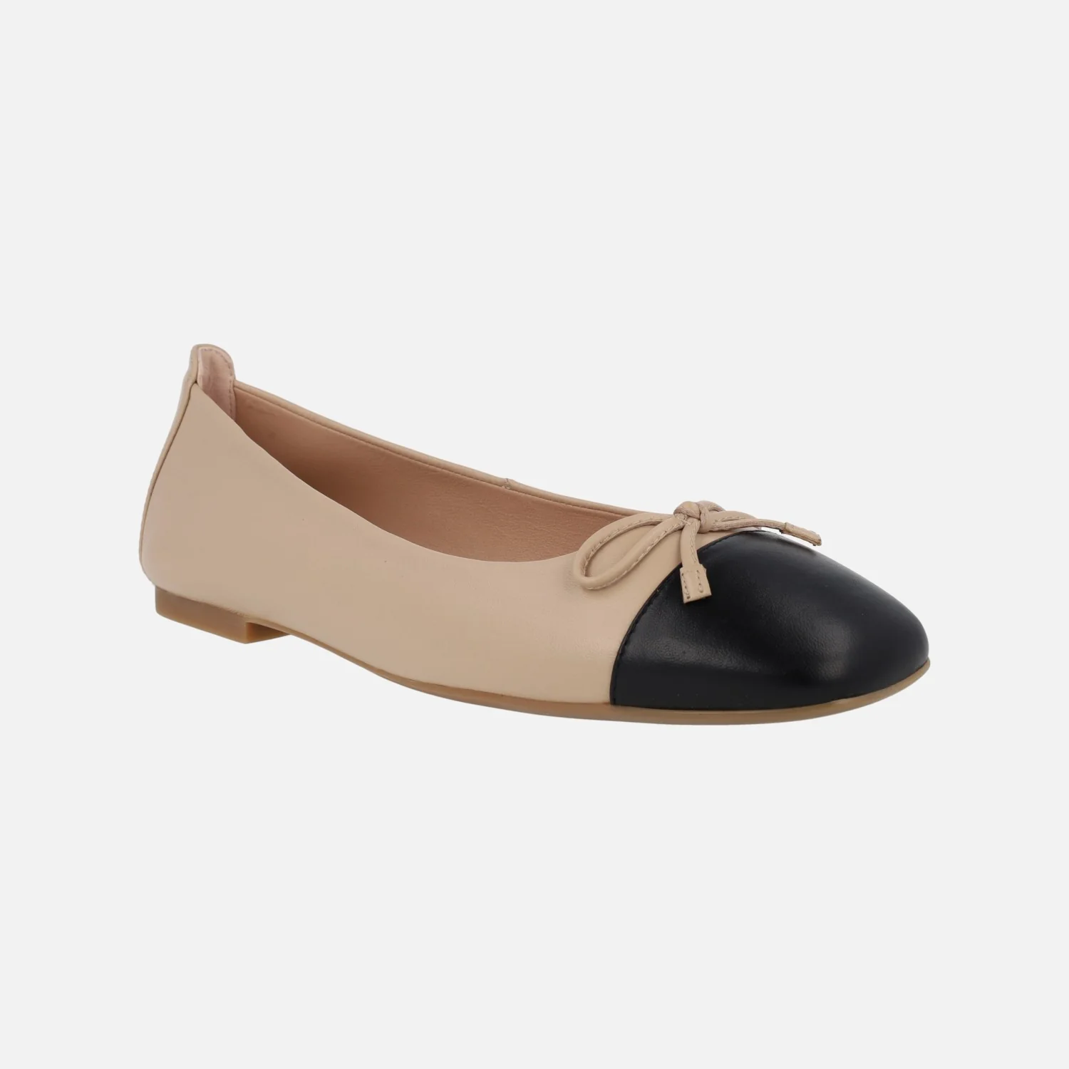 Bailarinas modelo Belle de la marca Unisa. Fabricadas en piel color Beig con la puntera en piel Negra haciendo contraste. Lleva un adorno de lazo. El forro y las plantillas son de piel y el piso es de goma flexible y antidestizante. Tacón bajo, de aproximadamente 1,5 cms. Todo un clásico.