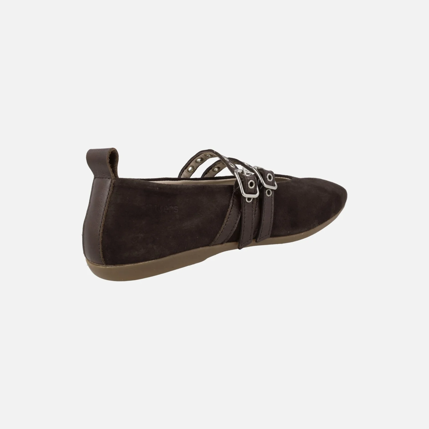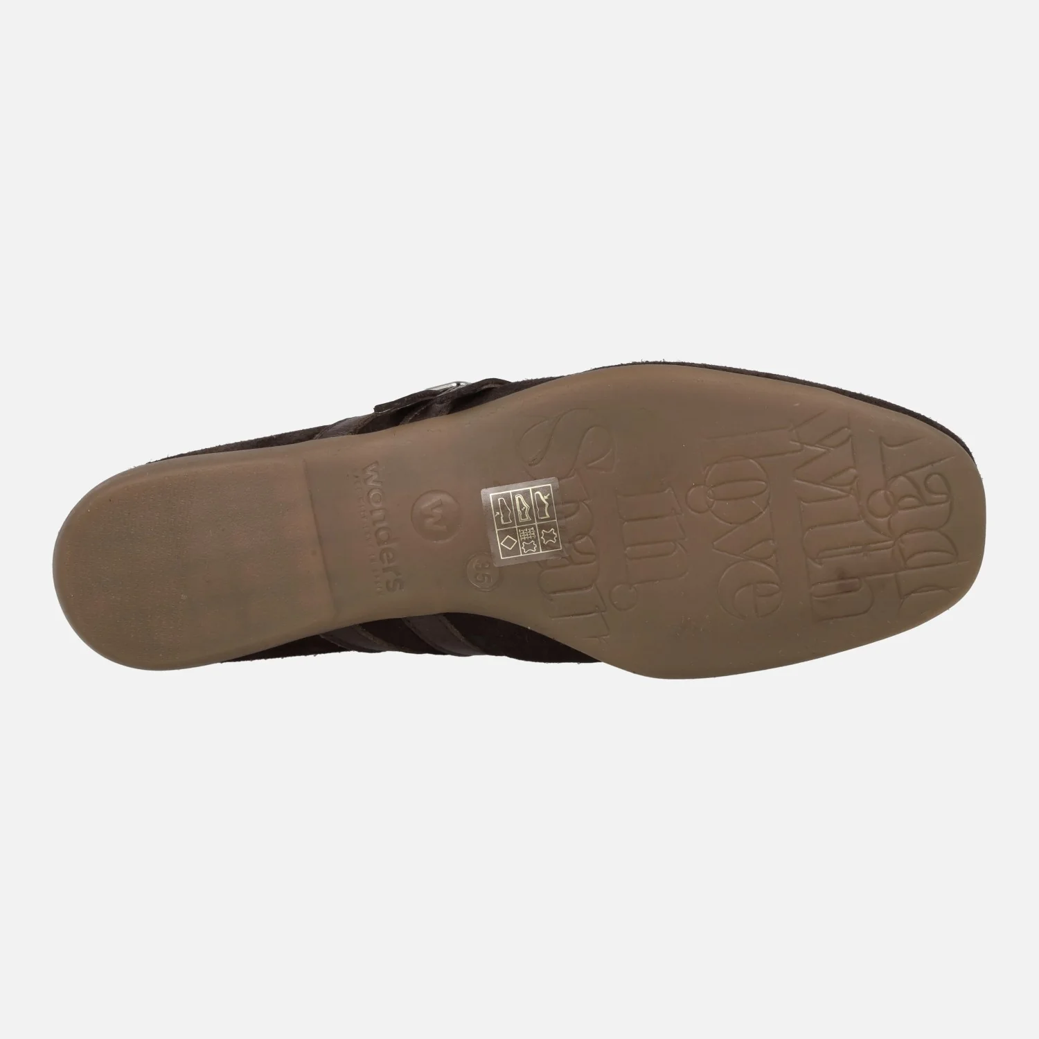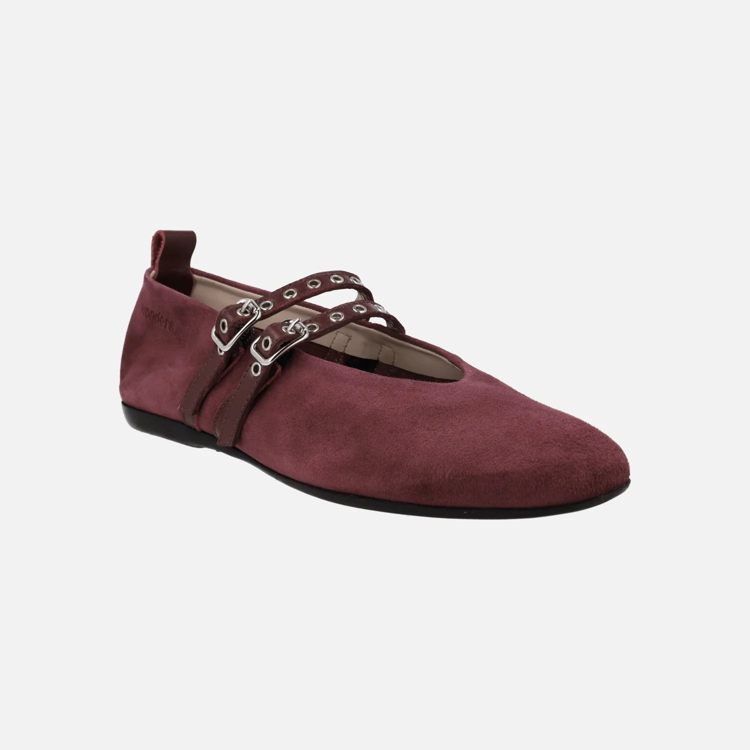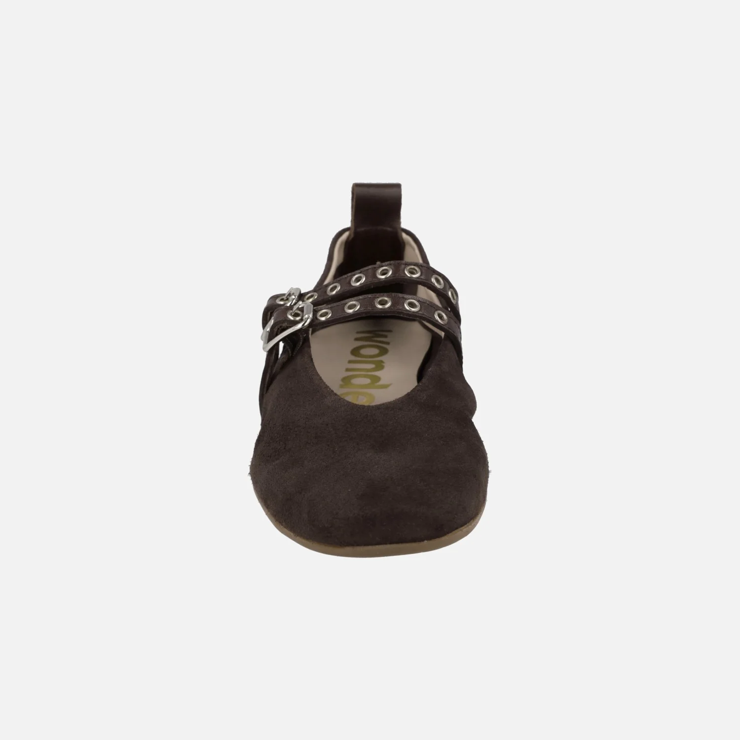 Preciosas bailarinas de ante modelo Pepa 133 de Wonders A-86133 disponibles en marrón chocolate (testa) o en burdeos (vino). Bailarinas estilo mercedes (mary jane) elaboradas en ante con dos pulseras que cruzan el empeine y cierran con hebilla. Interior mixto en piel y tejido. Suela sintética, plana, de apenas 1 cm de altura.