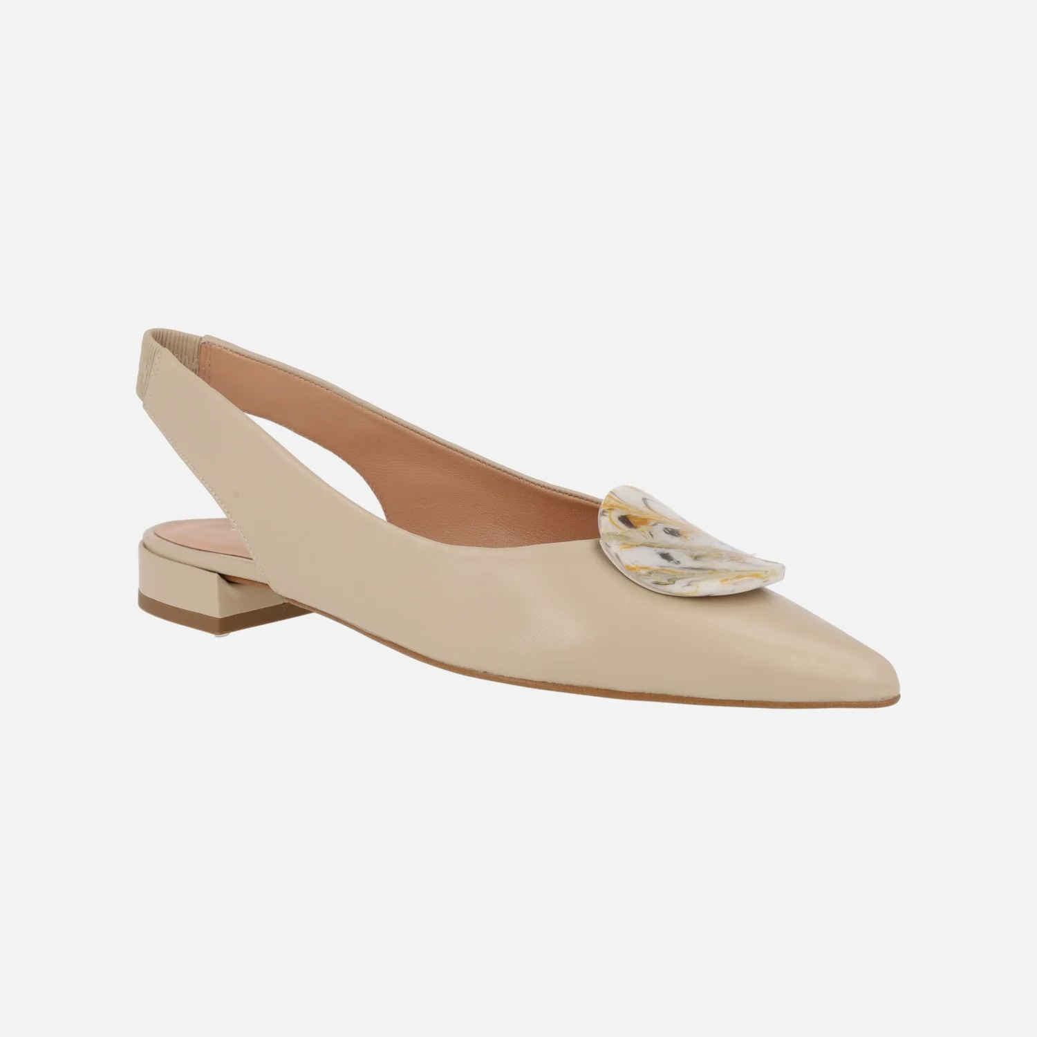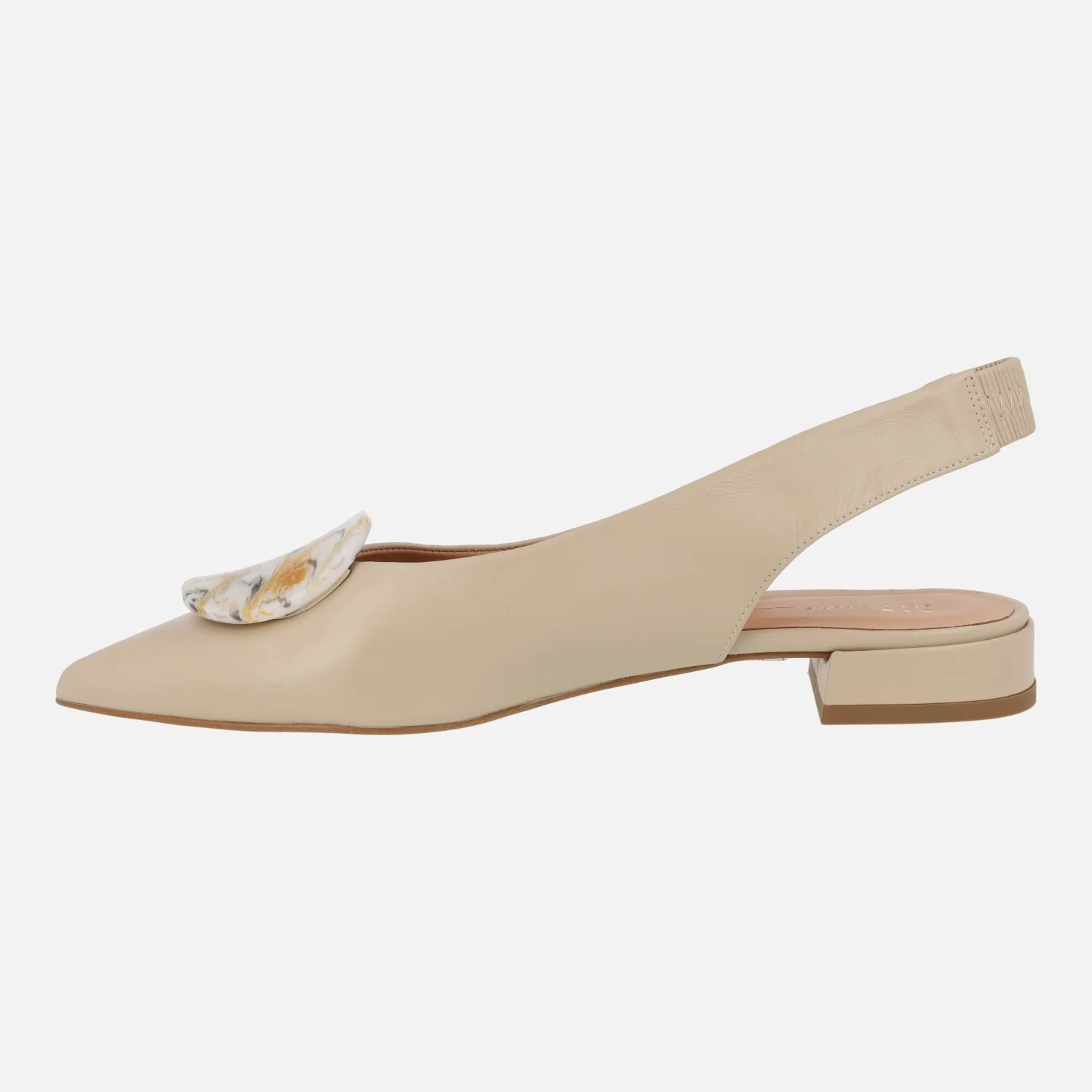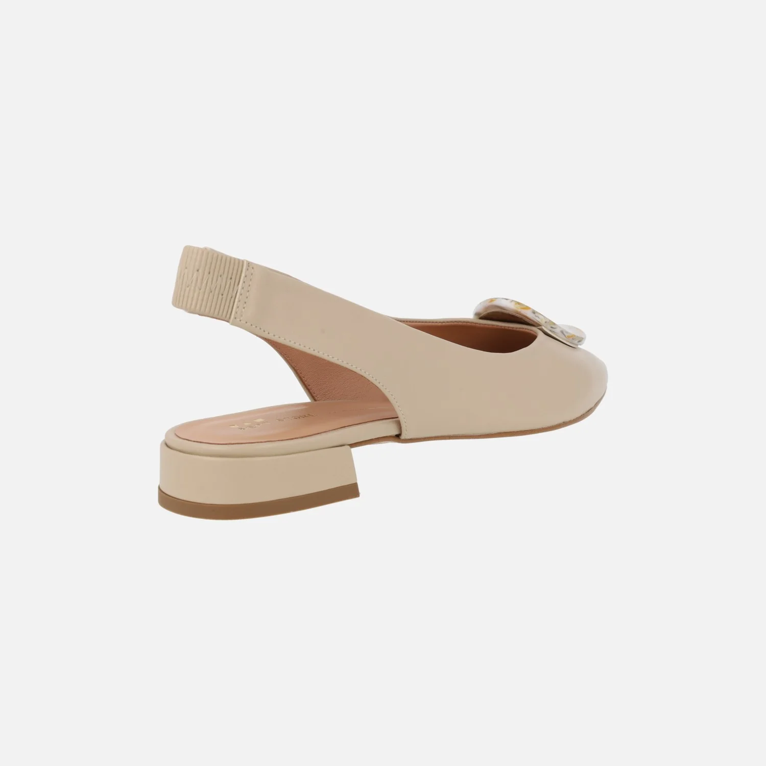 Bailarinas de piel beige de la marca Sept store modelo 24220. Bailarinas destalonadas, elaboradas en piel beige, con tira al talón con elástico para una mejor sujeción. Interiores de piel. Tacones bajitos, de 2 cms de altura. Adorno circular en la pala. Made in Spain.