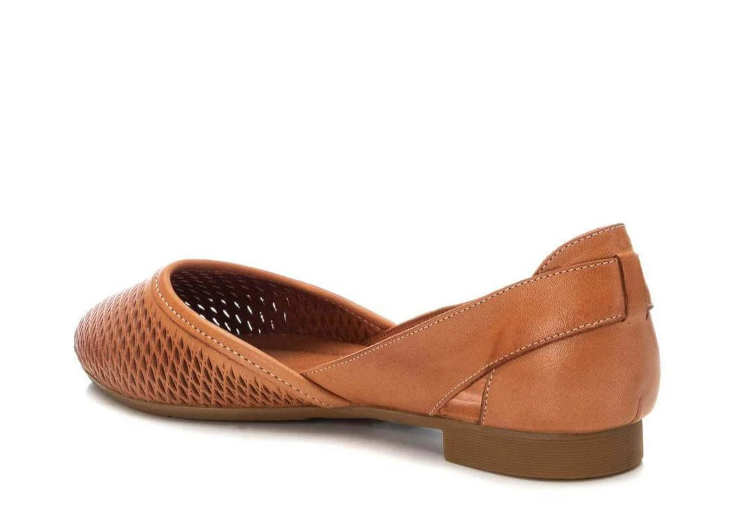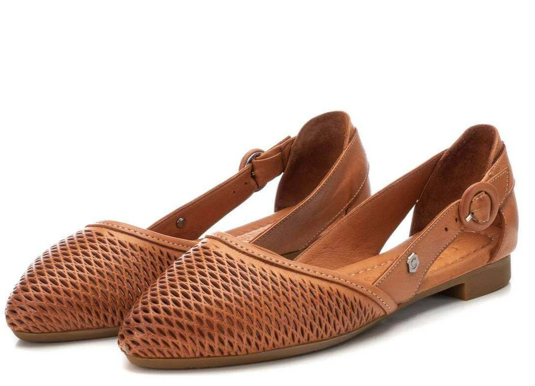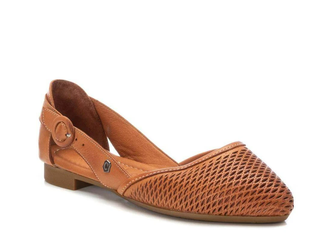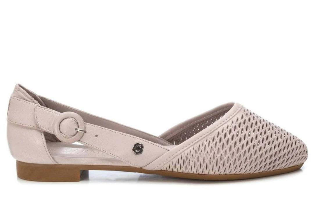Bailarinas de piel para mujer de la marca Carmela shoes, modelo 160760. Bailarinas con pala picada, abiertas por los lados y con hebilla redonda en lateral exterior. Disponibles en marrón camel, hielo o negras. Planta acolchada de piel. Piso fino de goma, de apenas 1,5 cms de altura.