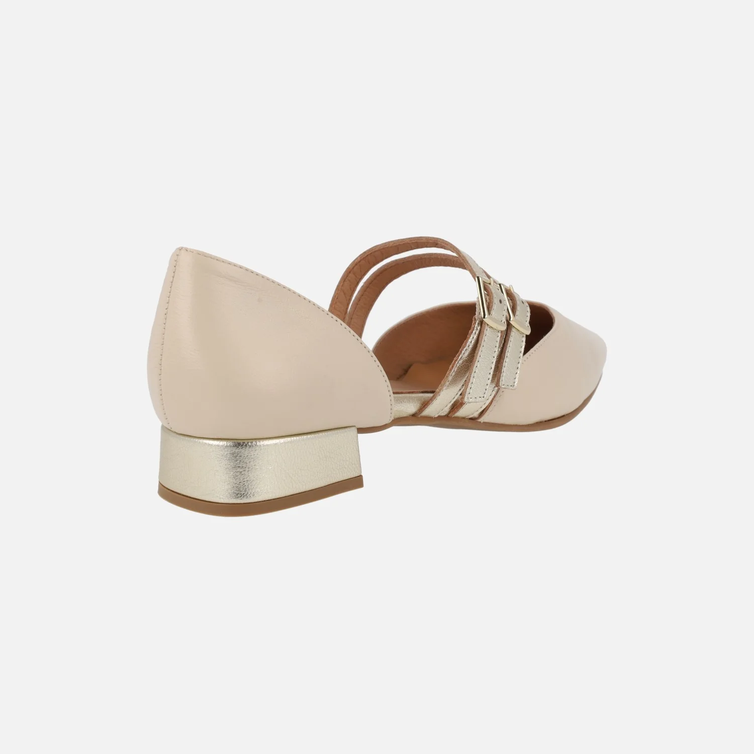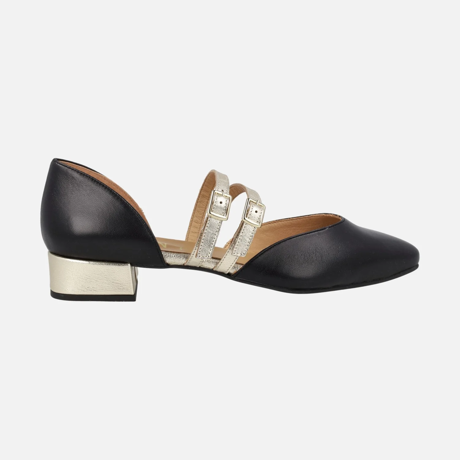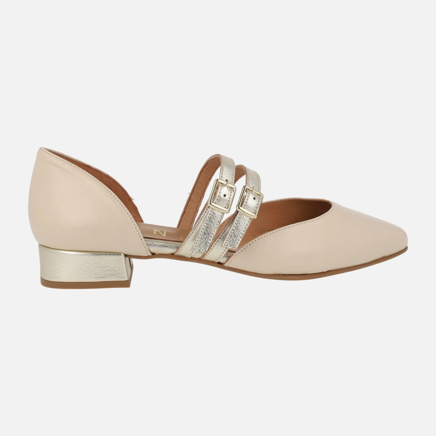 Bailarinas de piel modelo 47812 de la marca Design Frank, disponibles en beige y en negro. Bailarinas elaboradas en piel, con puntera ovalada y aberturas laterales. Dos tiras con hebillas al empeine. Detalle de tacón y pulseras al empeine en metalizado oro. Forro y planta de piel. Piso sintético, con tacones de 2,5 cms de altura. Made in Spain.