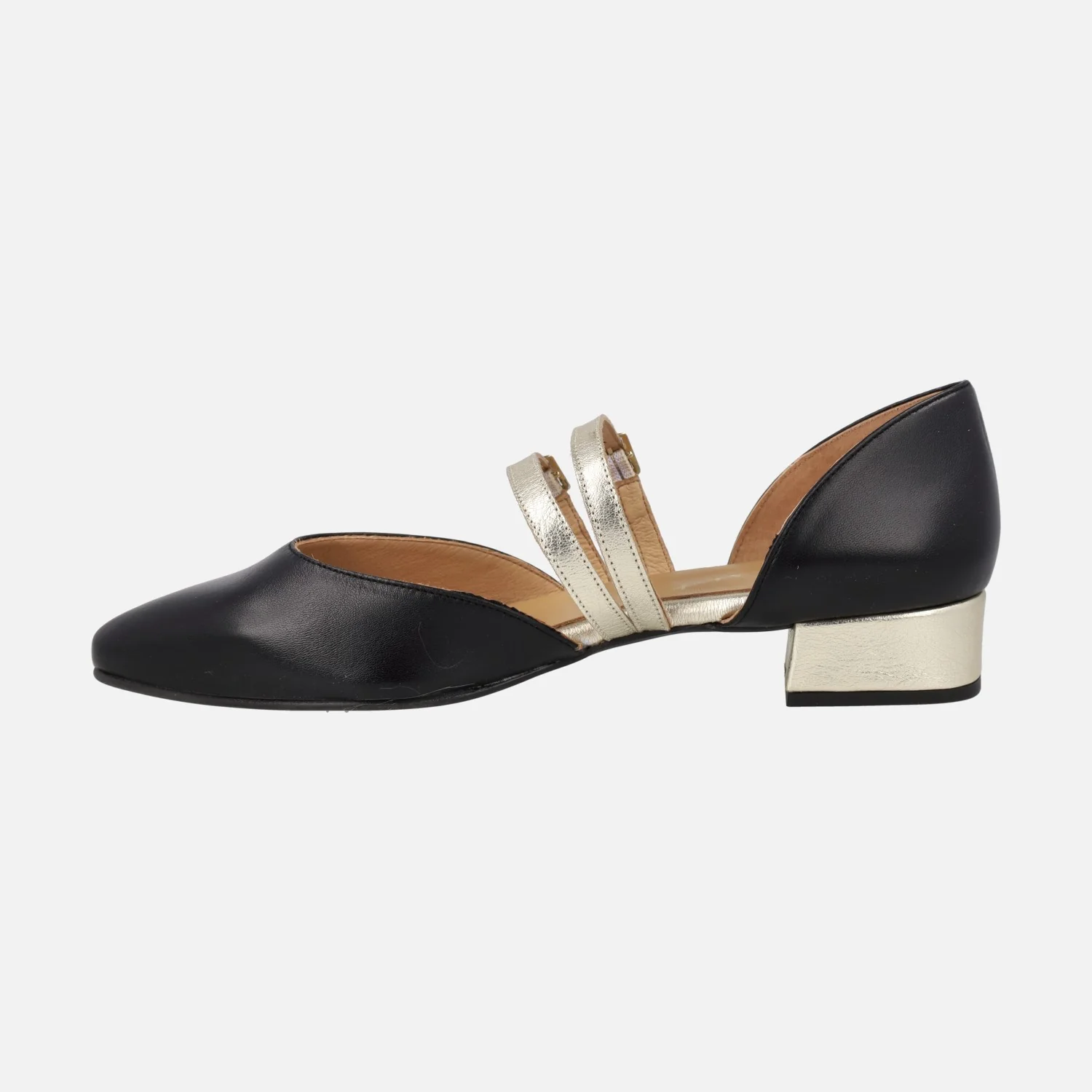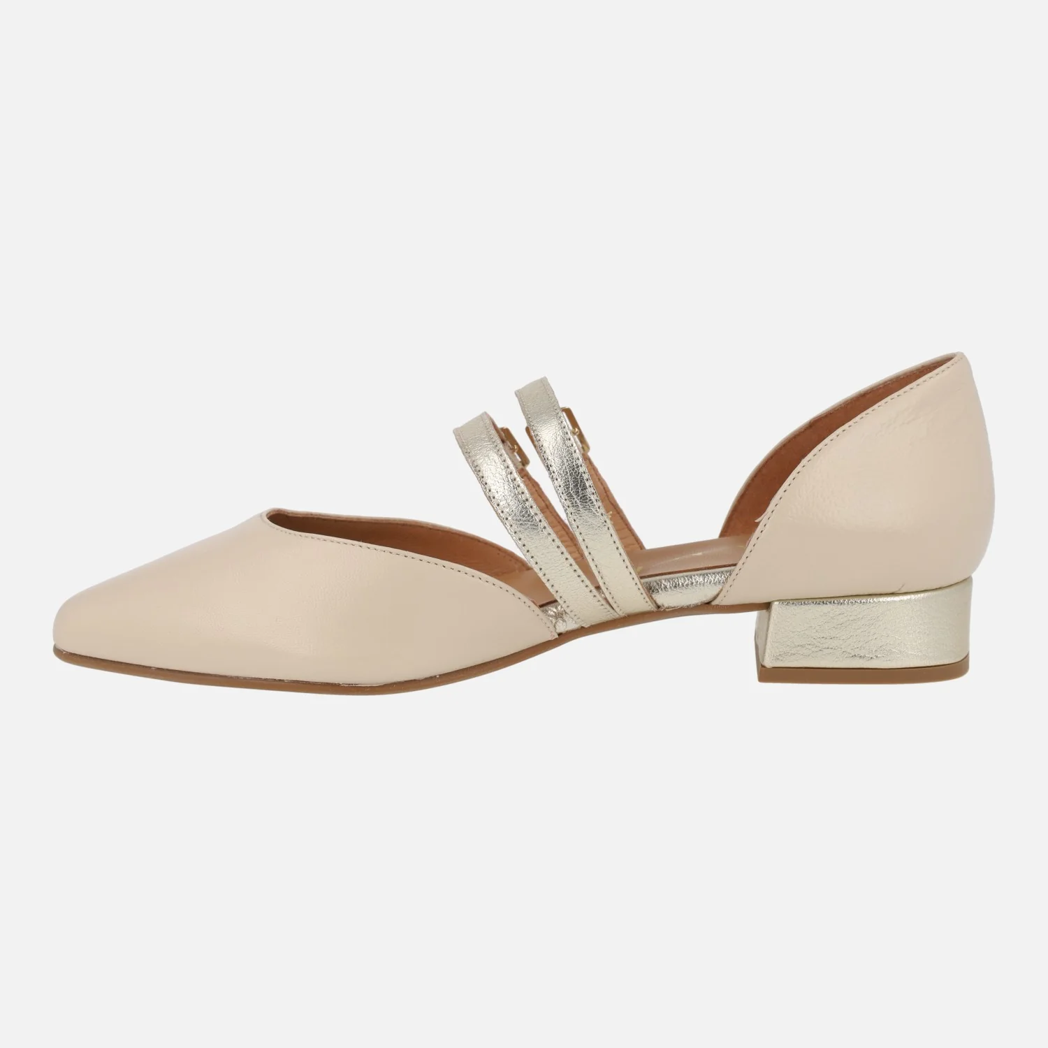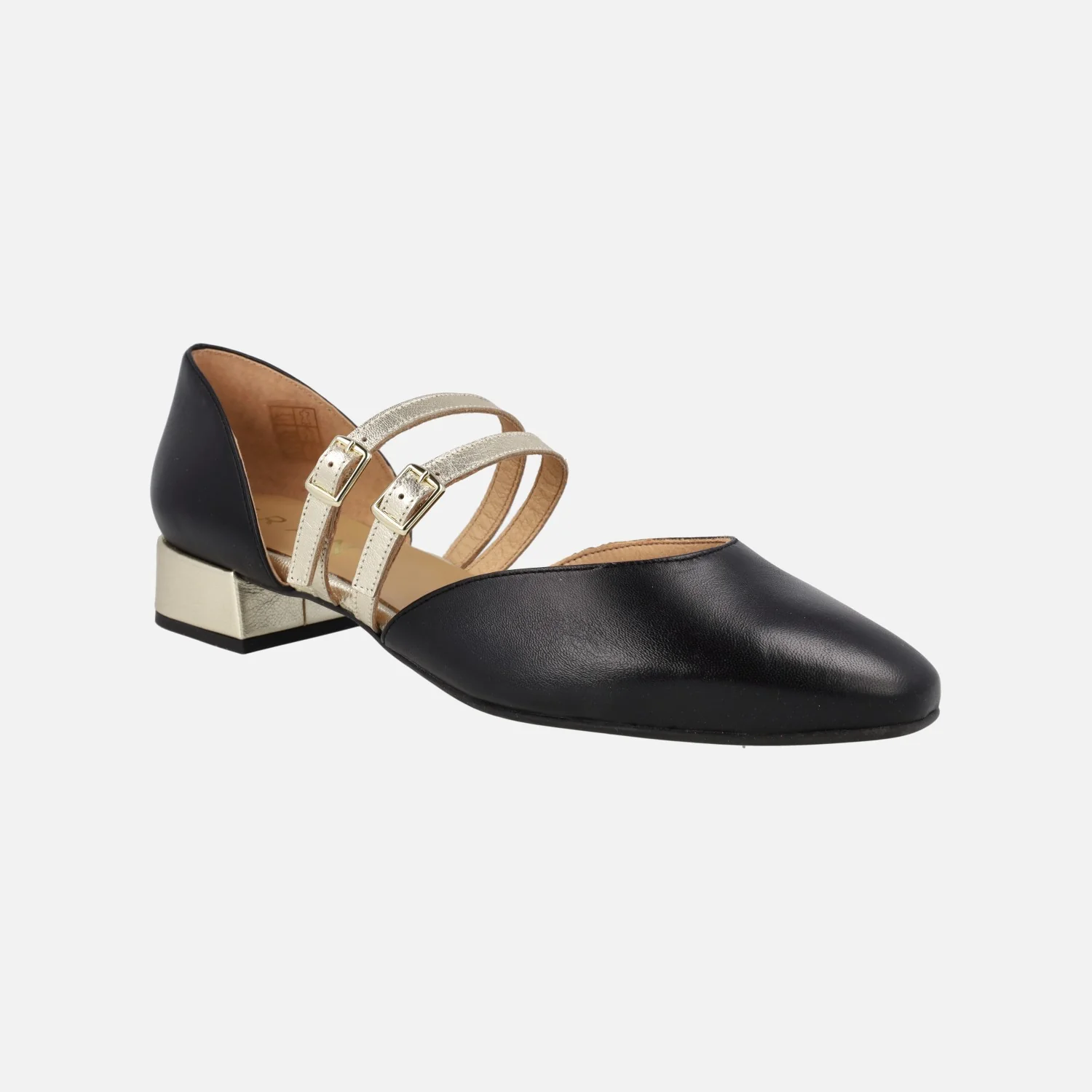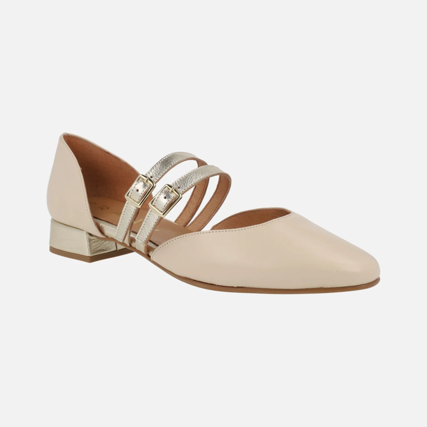 Bailarinas de piel modelo 47812 de la marca Design Frank, disponibles en beige y en negro. Bailarinas elaboradas en piel, con puntera ovalada y aberturas laterales. Dos tiras con hebillas al empeine. Detalle de tacón y pulseras al empeine en metalizado oro. Forro y planta de piel. Piso sintético, con tacones de 2,5 cms de altura. Made in Spain.
