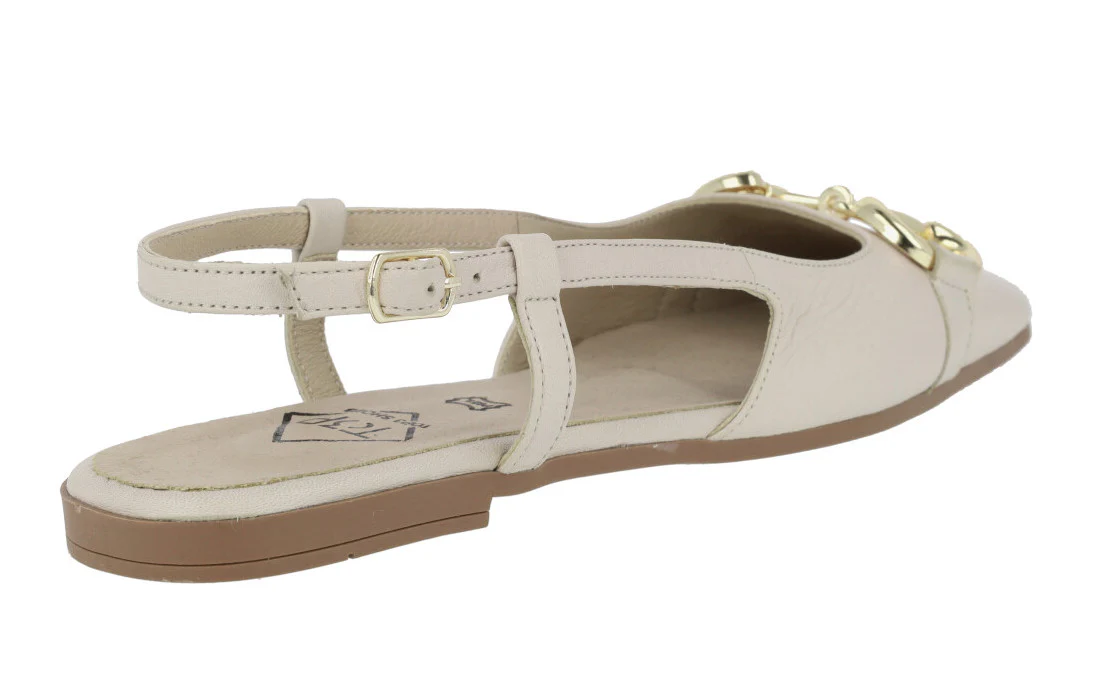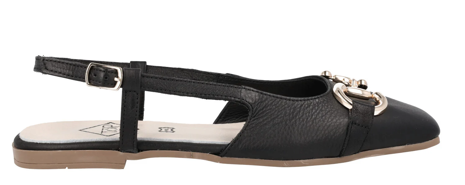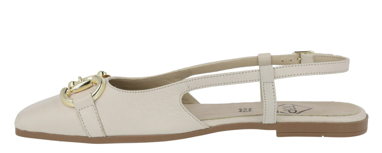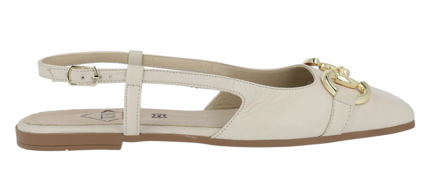 Bailarinas para mujer modelo 23357 de la marca Top3, disponibles en color hielo (blanco roto) o negras. Bailarinas de piel, destalonadas, con tira al talón y cierre de hebilla. Adorno metálico dorado en la pala. Interiores de piel. Piso plano, de goma, de apenas 1 cm de altura.
