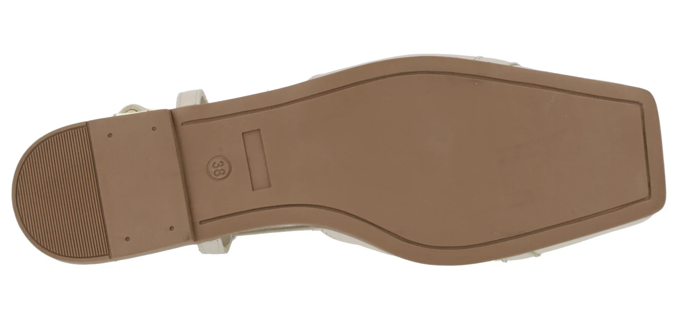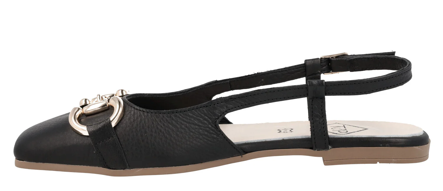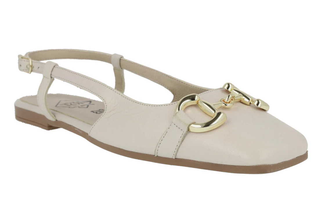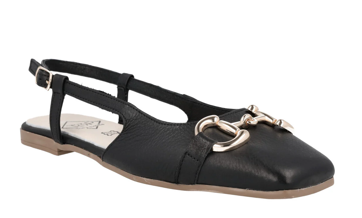Bailarinas para mujer modelo 23357 de la marca Top3, disponibles en color hielo (blanco roto) o negras. Bailarinas de piel, destalonadas, con tira al talón y cierre de hebilla. Adorno metálico dorado en la pala. Interiores de piel. Piso plano, de goma, de apenas 1 cm de altura.