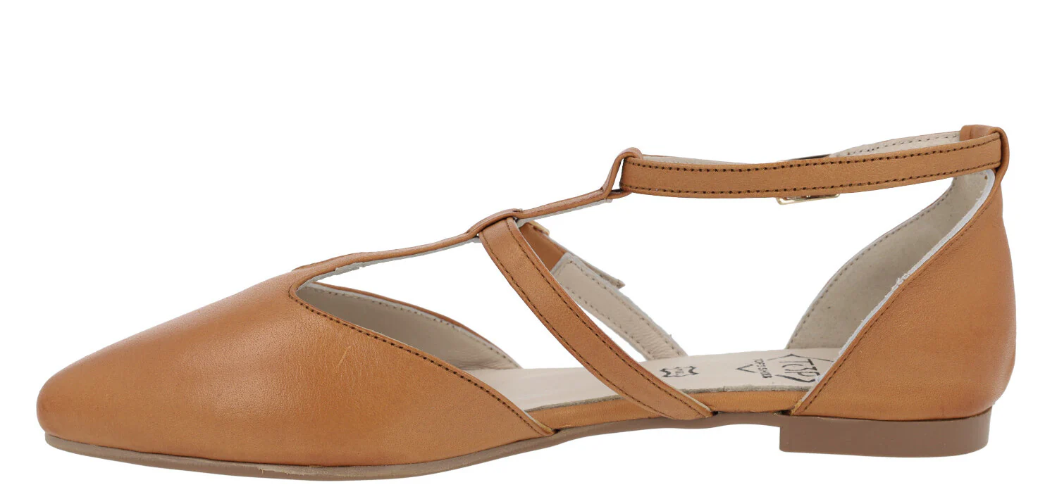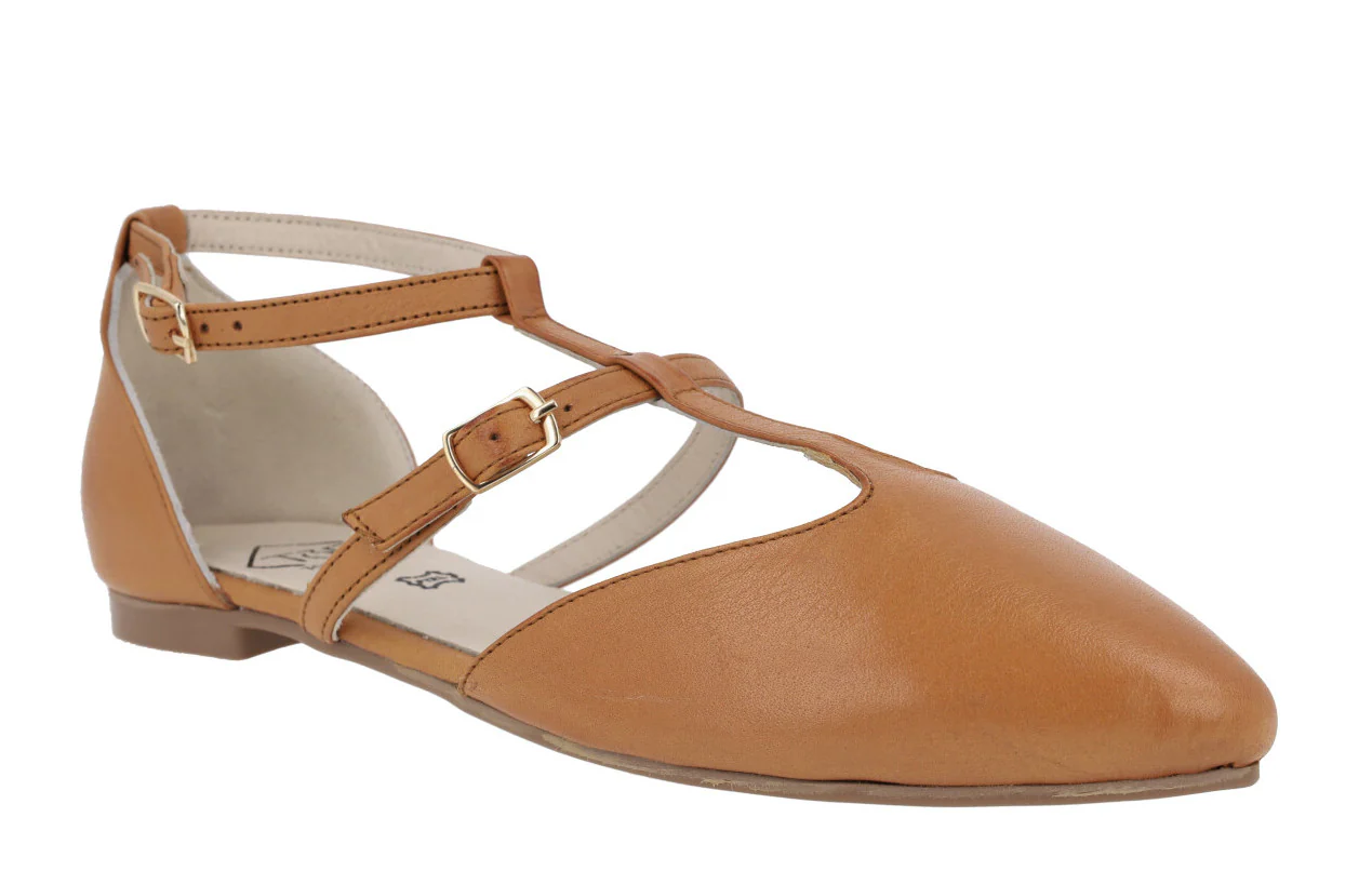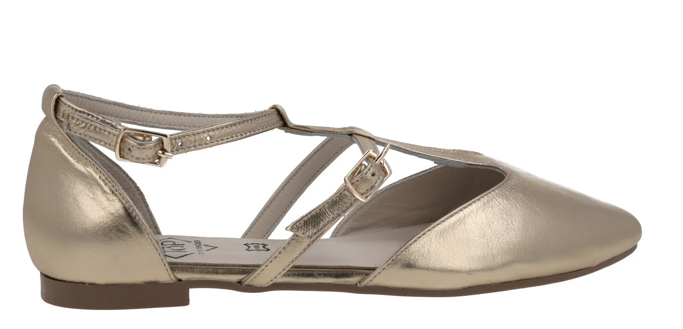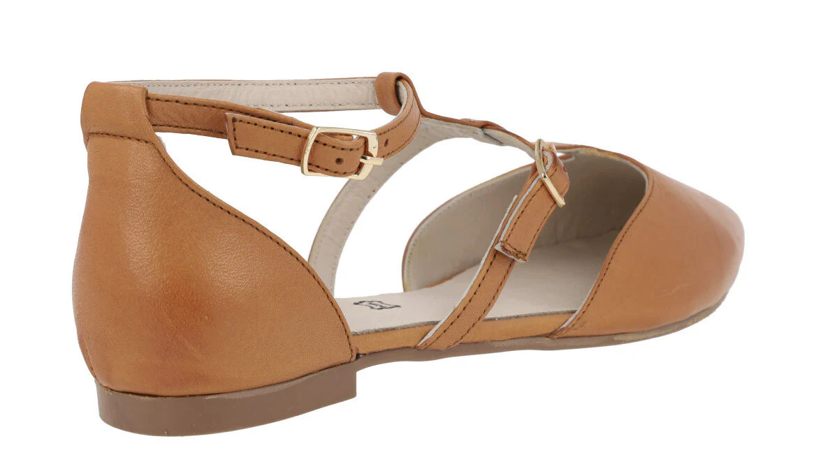 Bailarinas de piel para mujer de la marca Top3 modelo 23334. Bailarinas de piel color camel, abiertas por los laterales, con una tira fina que cruza el empeine y dos pulseras con hebillas. Forro y planta de piel. Bailarinas planas, de apenas 1 cm de altura en la parte trasera.
