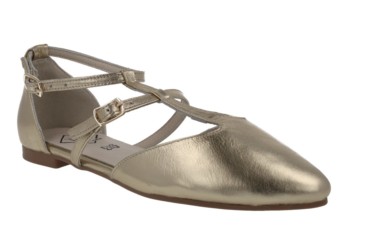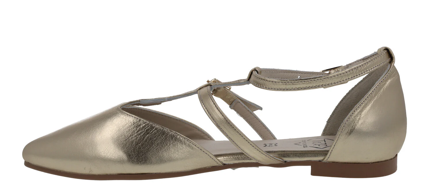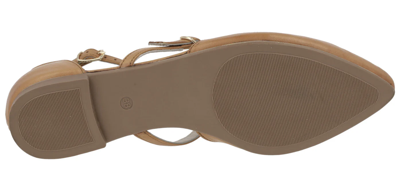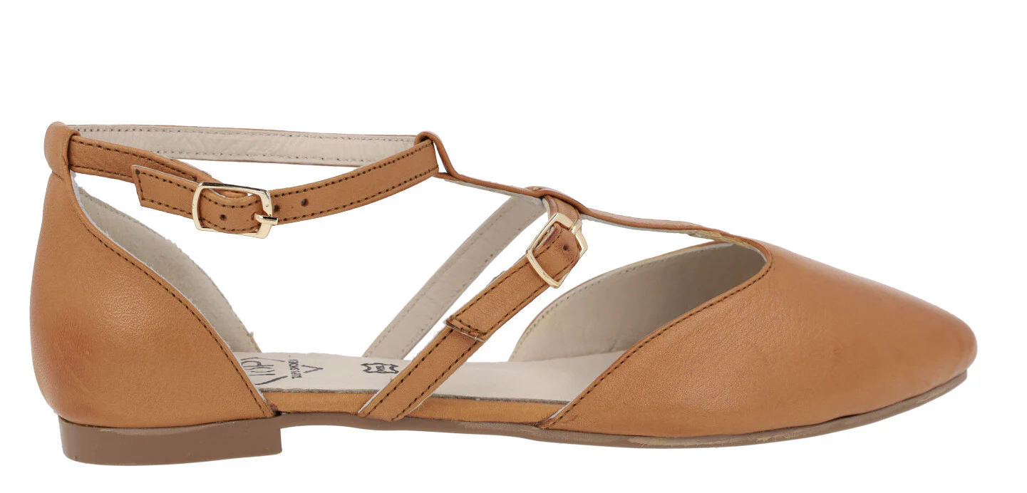 Bailarinas de piel para mujer de la marca Top3 modelo 23334. Bailarinas de piel color camel, abiertas por los laterales, con una tira fina que cruza el empeine y dos pulseras con hebillas. Forro y planta de piel. Bailarinas planas, de apenas 1 cm de altura en la parte trasera.
