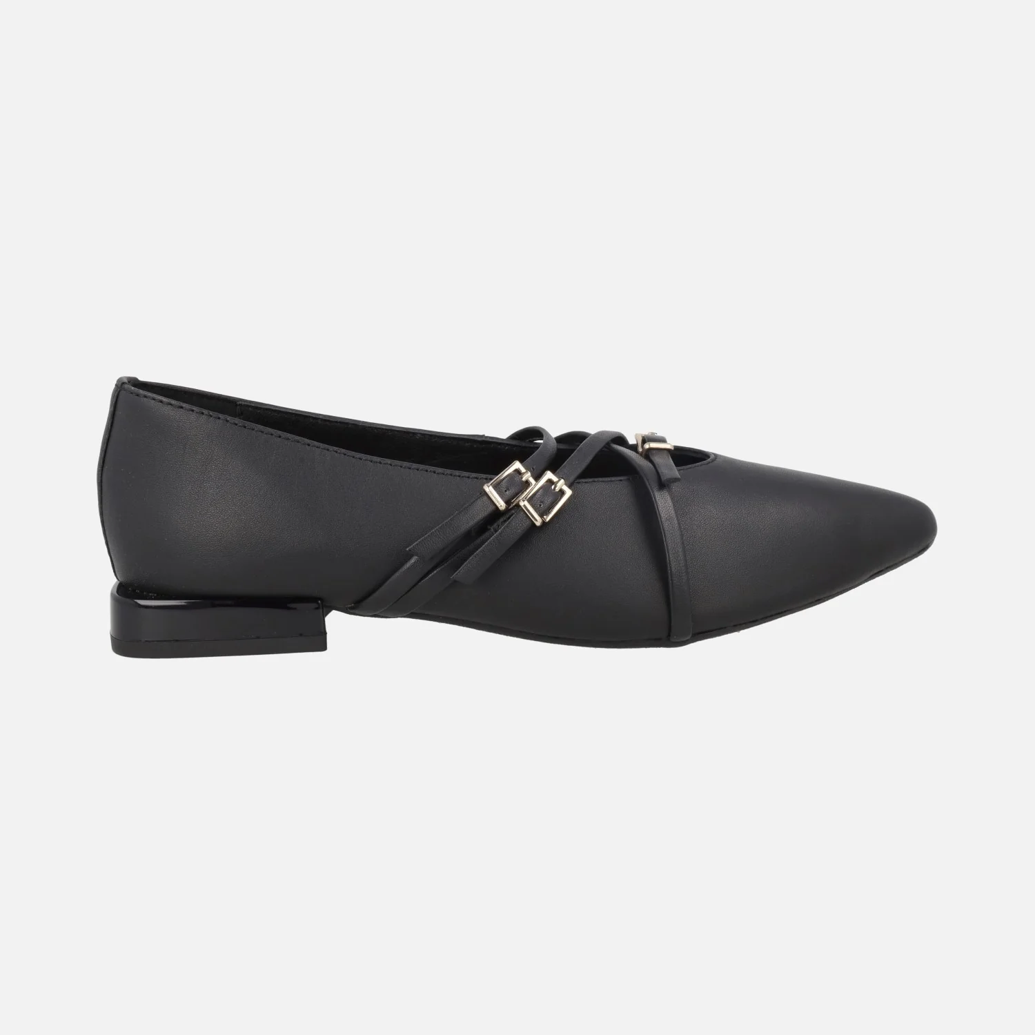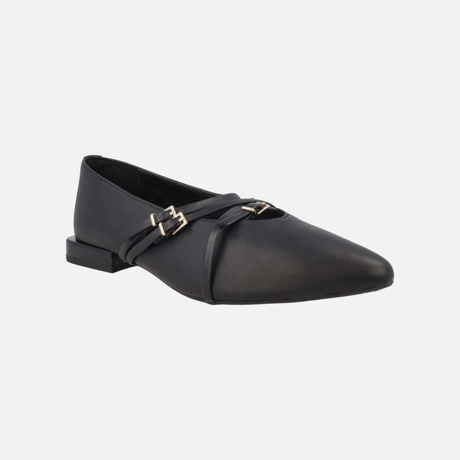 Bailarinas negras de piel con detalle de tiras y hebillas modelo Hokah 76868-P Negro de la marca Gioseppo, nueva colección. Bailarinas con puntera afilada, elaboradas en piel negra con tiras y hebillas doradas. Interiores de piel con planta acolchada. Piso sintético, tacones de 2 cm.