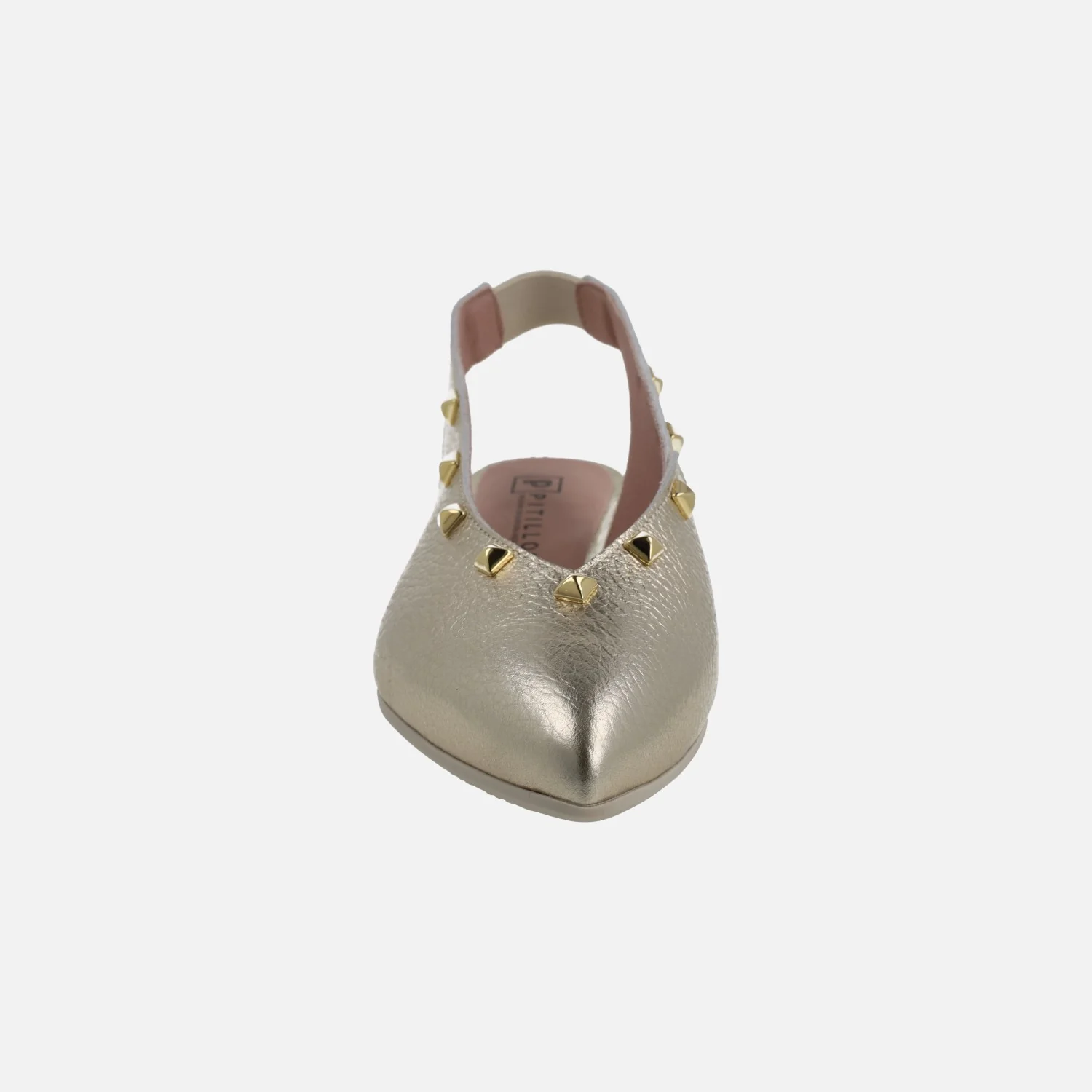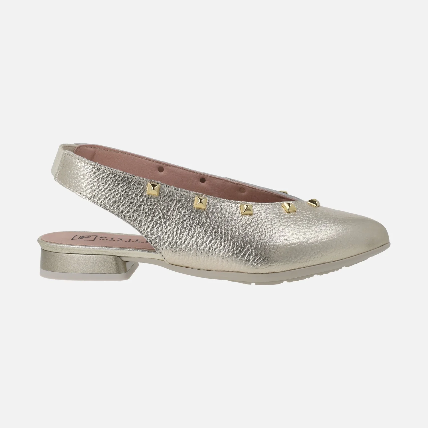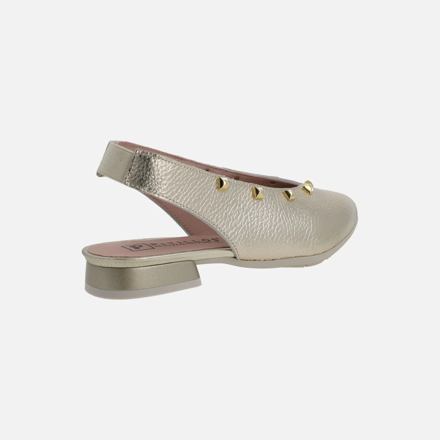 Preciosas bailarinas destalonadas de la marca Pitillos, modelo 11173 Oro. Bailarinas elaboradas en piel metalizada oro, con tira al talón que lleva una pequeña pieza elástica para mejor ajuste y sujeción. Interior mixto en tejido y sintéticos. Tacón bajo, suela sintética. Altura de tacón aproximadamente 2,5 cm.