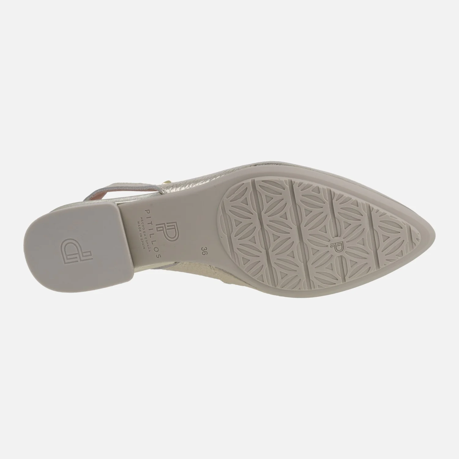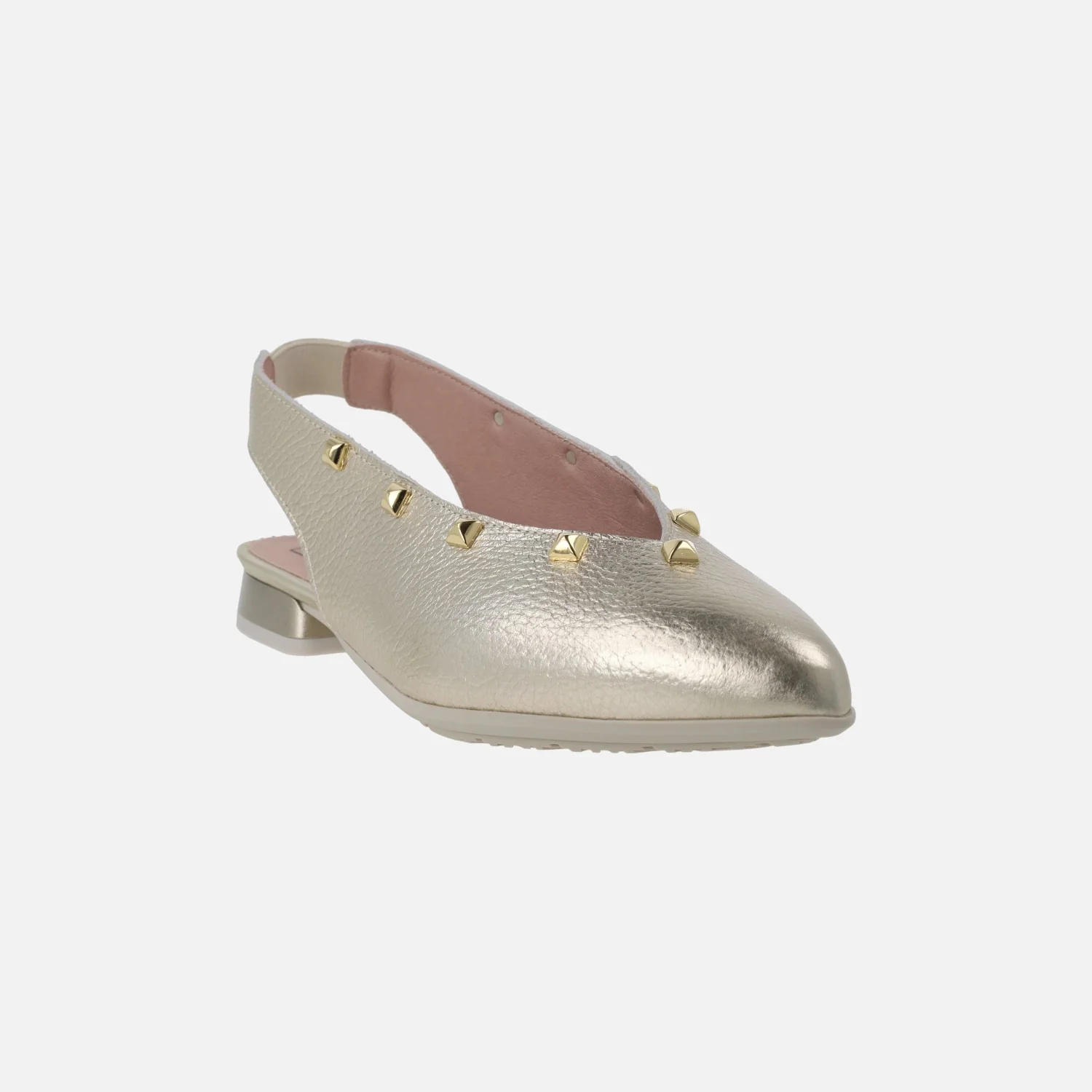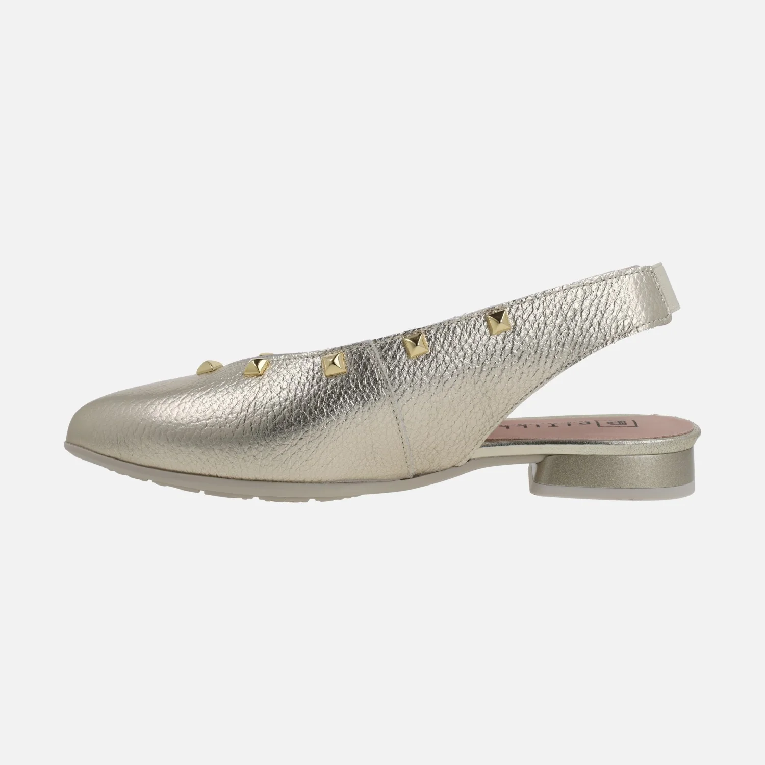 Preciosas bailarinas destalonadas de la marca Pitillos, modelo 11173 Oro. Bailarinas elaboradas en piel metalizada oro, con tira al talón que lleva una pequeña pieza elástica para mejor ajuste y sujeción. Interior mixto en tejido y sintéticos. Tacón bajo, suela sintética. Altura de tacón aproximadamente 2,5 cm.