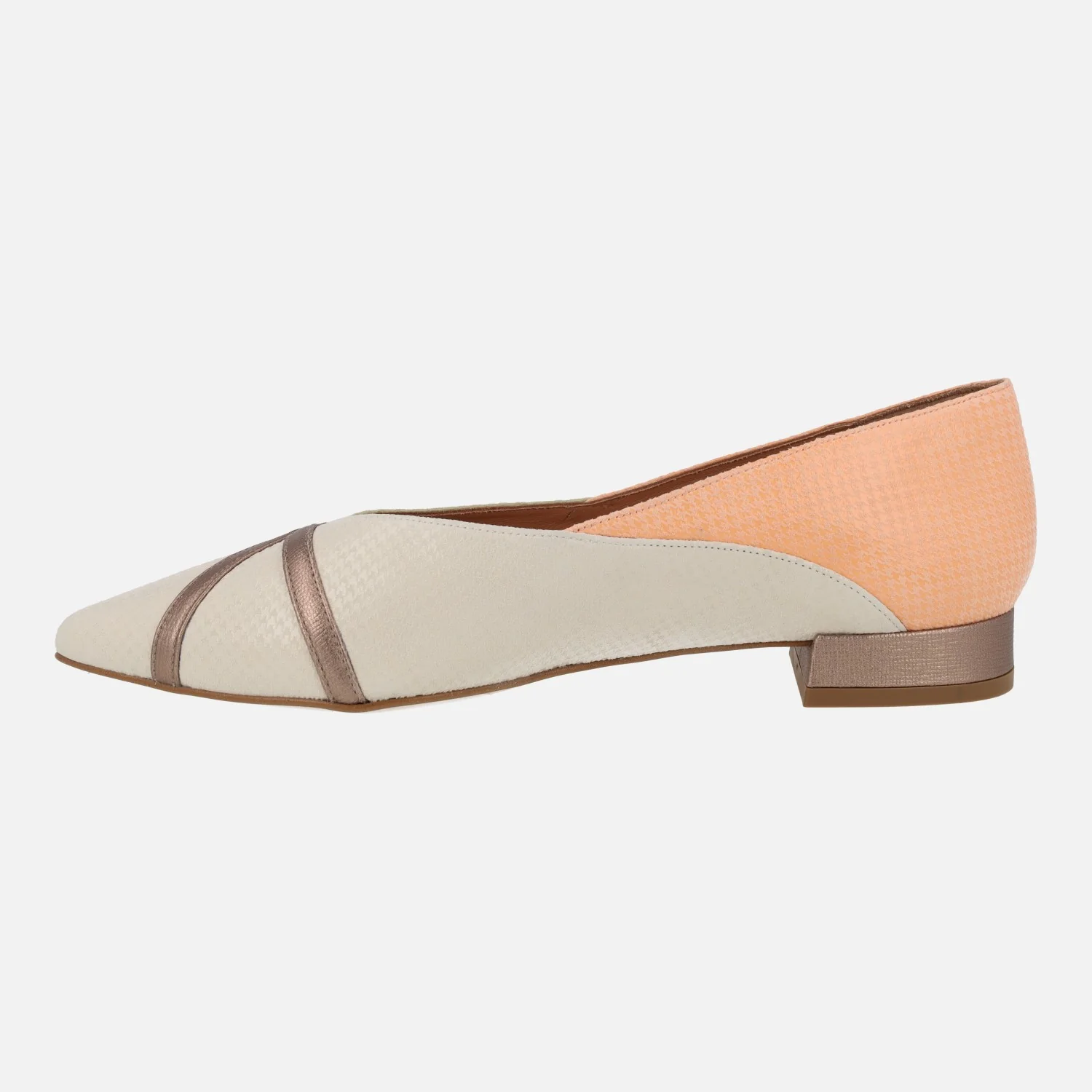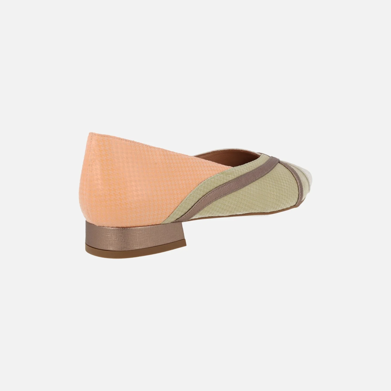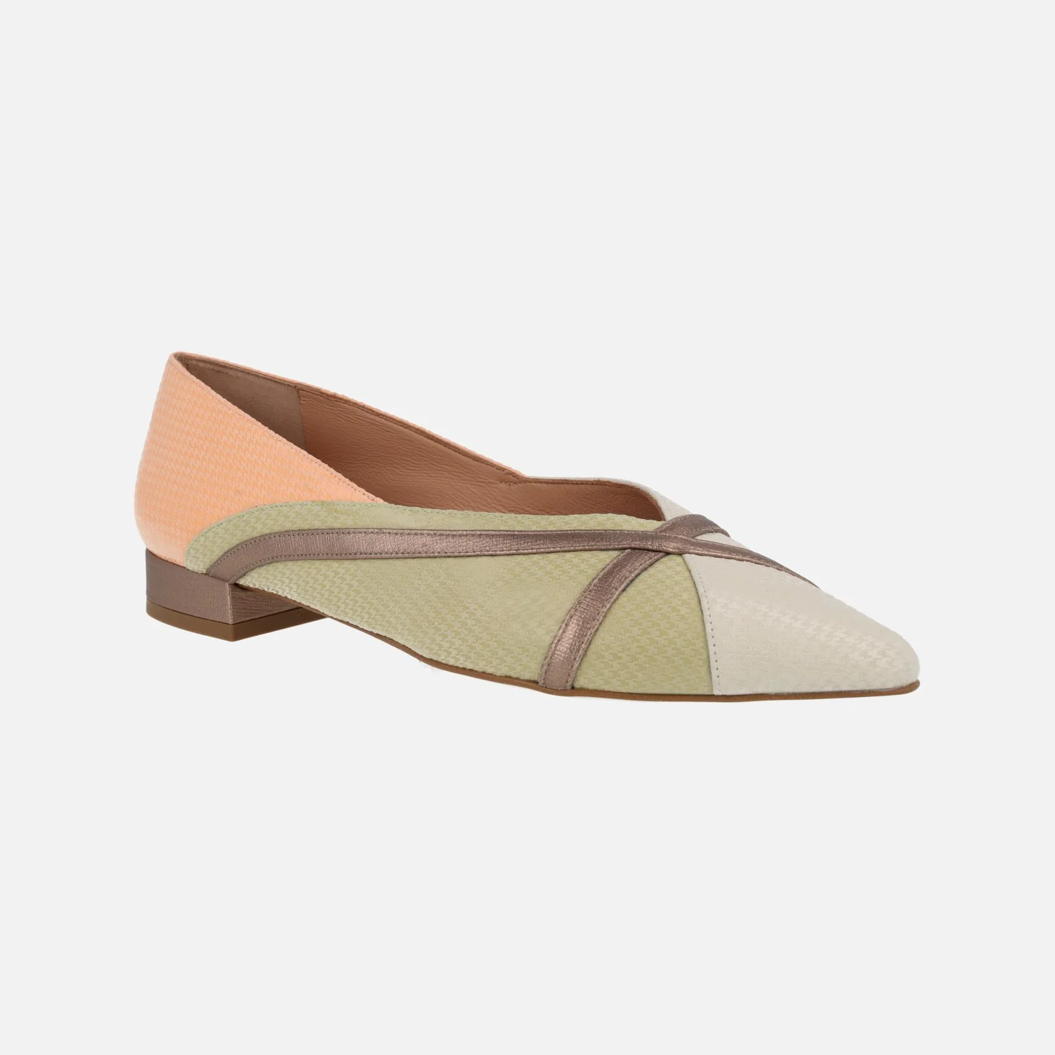 Preciosas bailarinas de horma afilada marca Sept Store, modelo 23-257 A. Bailarinas elaboradas en piel suave, grabada, en combinado naranja/verde/beige con dos tiras y tacón en metalizado bronce. Forro y planta de piel. Tacones bajitos, de 2 cms de altura. Made in Spain.