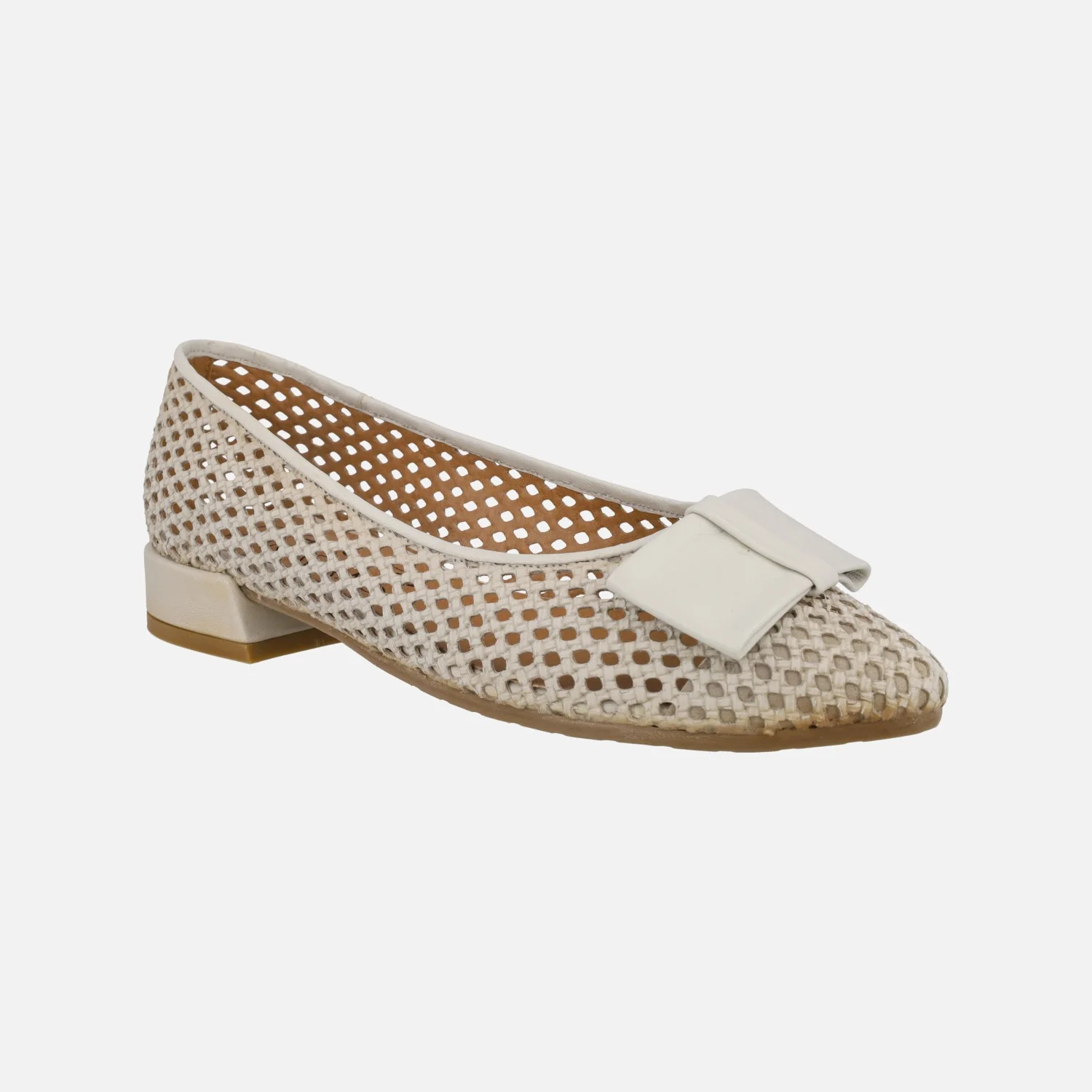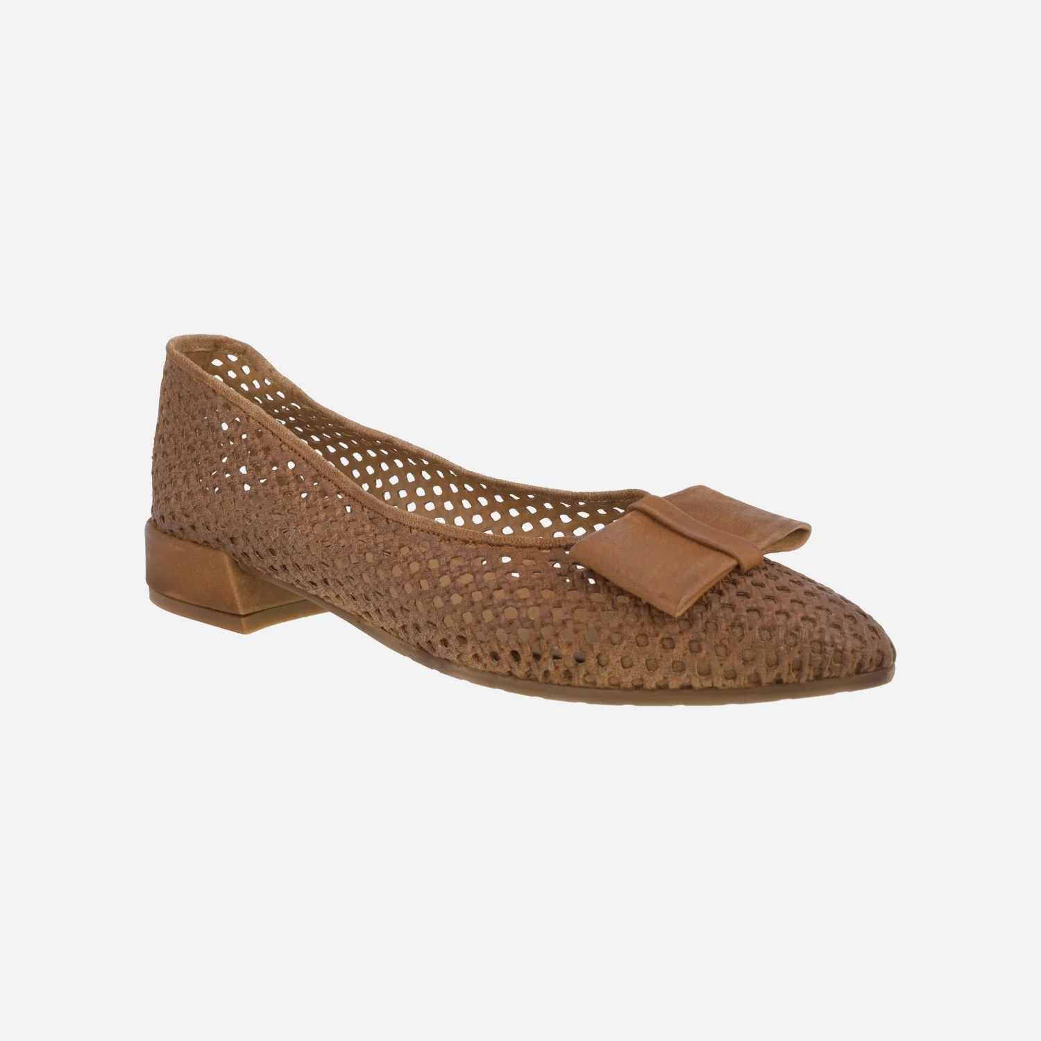 Bailarinas de piel trenzada de la marca Nature modelo 25256, disponibles en marrón cuero y en crudo. Bailarinas de piel con tacón bajo y adorno de lazo en la puntera. Interiores en sintéticos. Tacones de 2,5 cms de altura.
