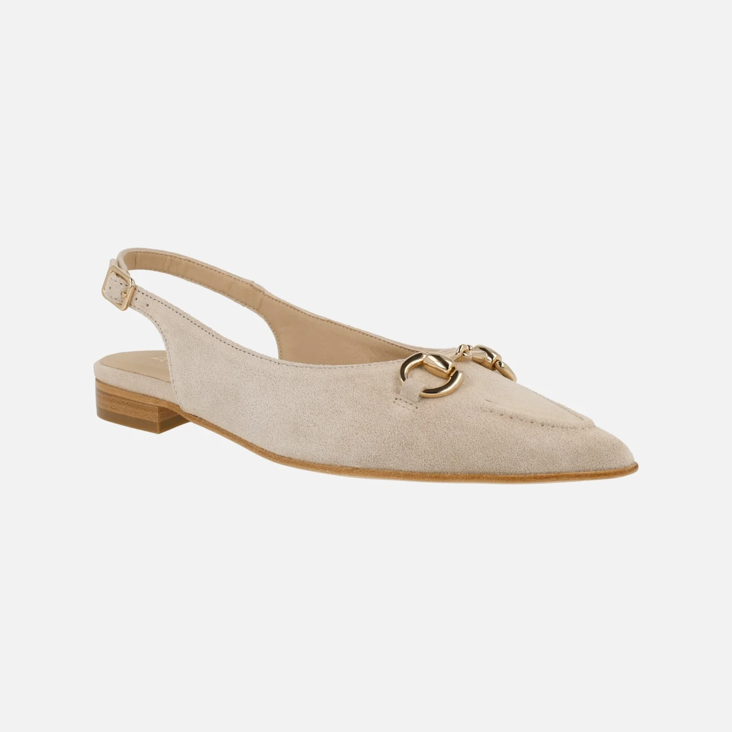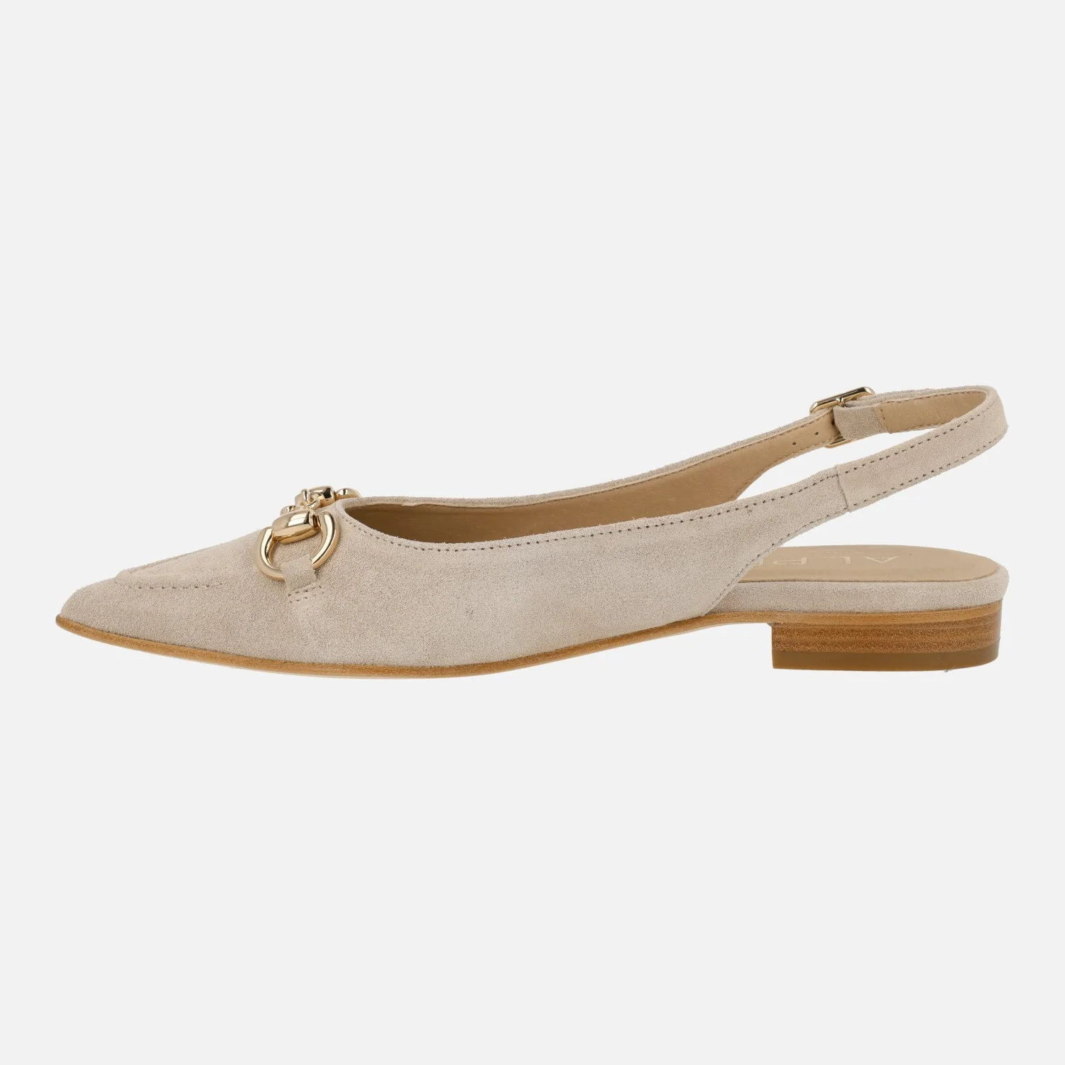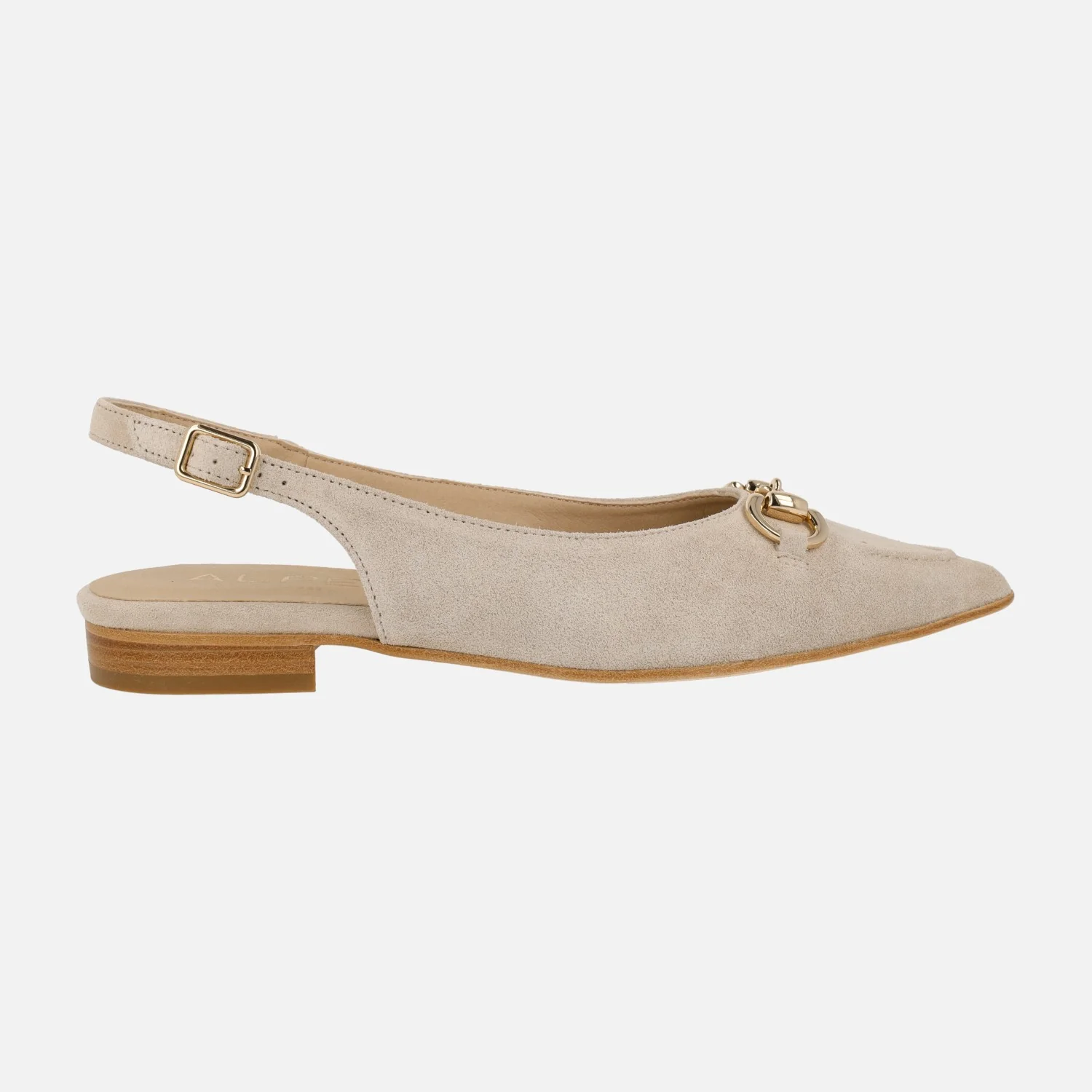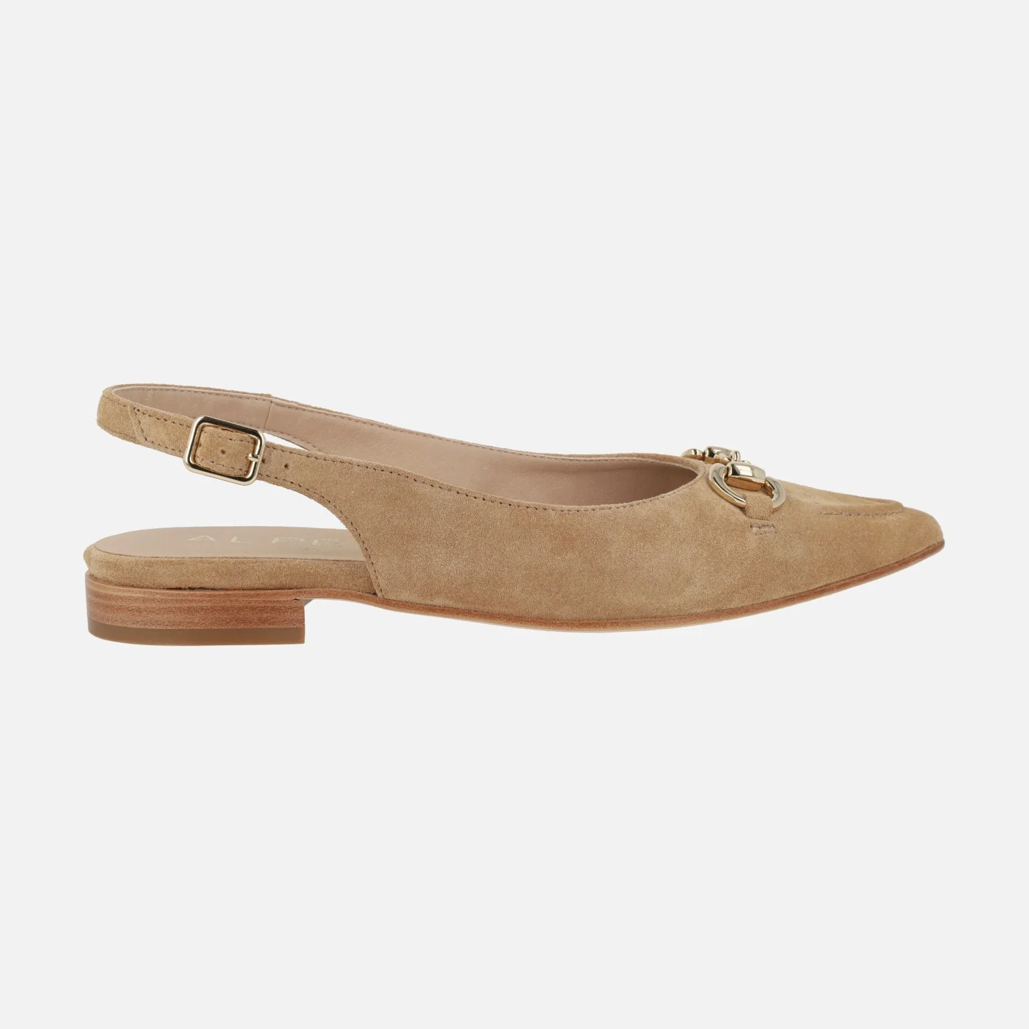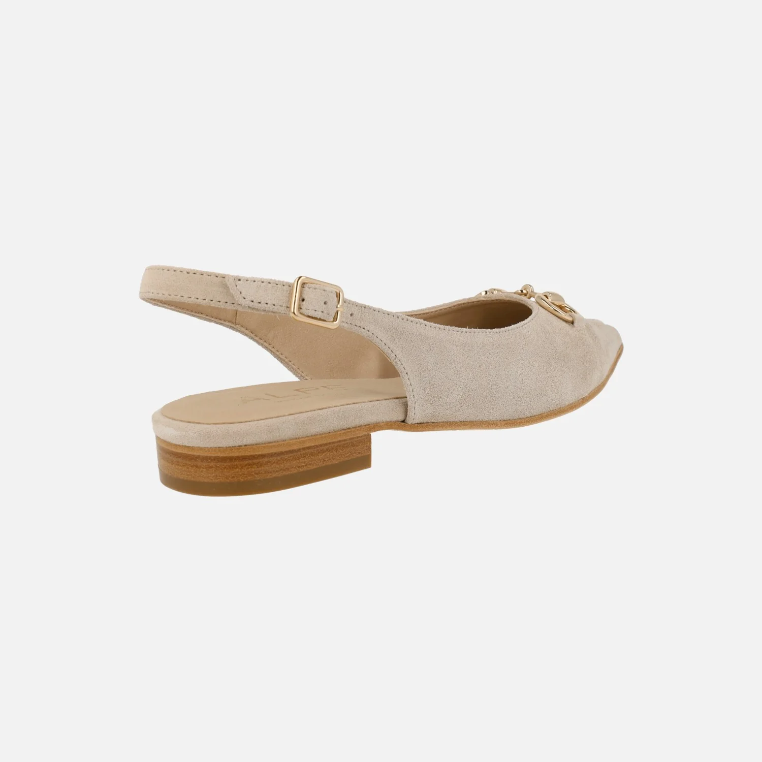 Bailarinas destalonadas para mujer de la marca Alpe, modelo 5403 Audrey. Zapatos corte salón destalonados con adorno metálico dorado en la pala. Detalle de costura marcada en la puntera. Tira al talón con hebilla regulable. Interior textil. Piso sintético, de apenas 2,5 cms de altura.