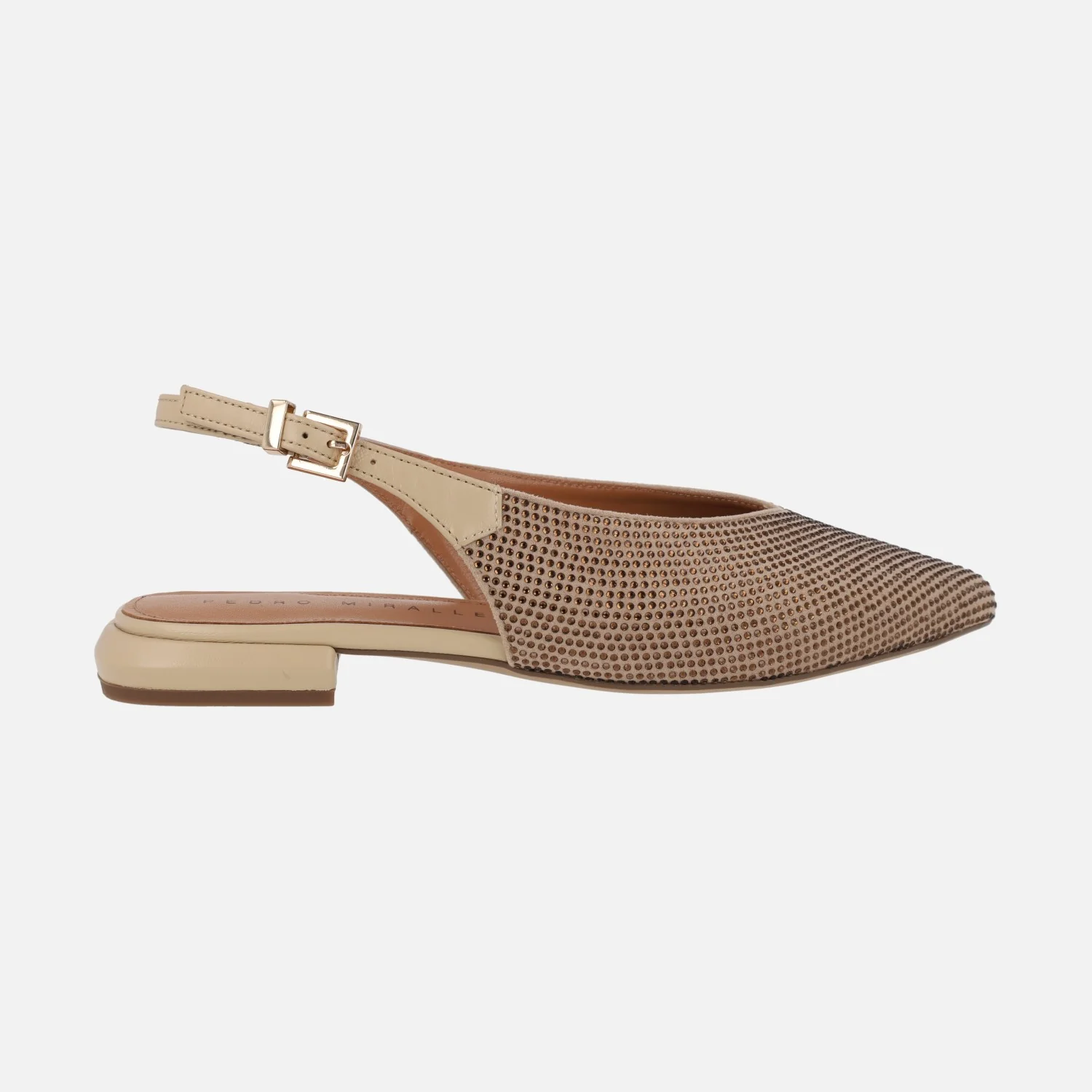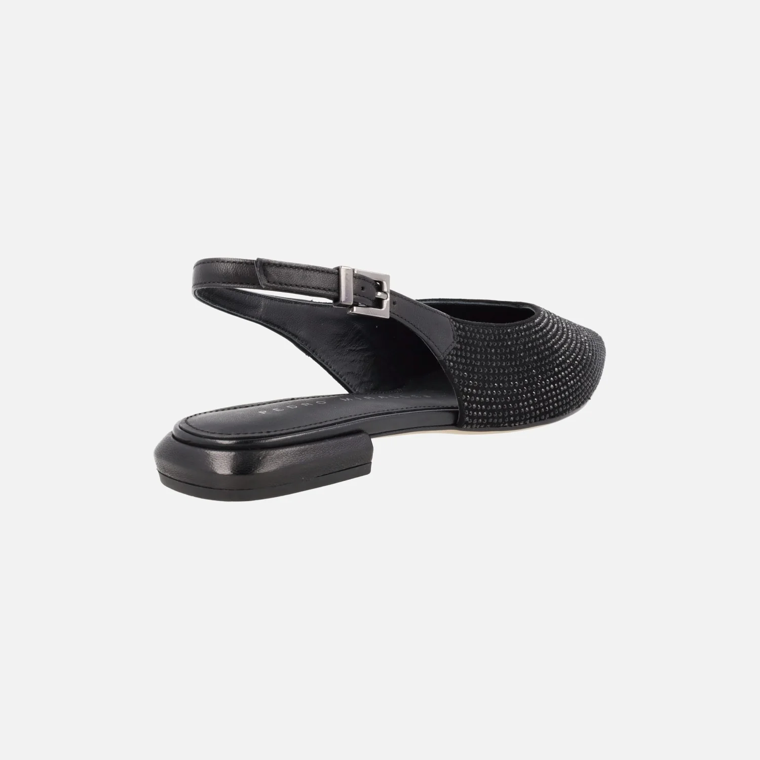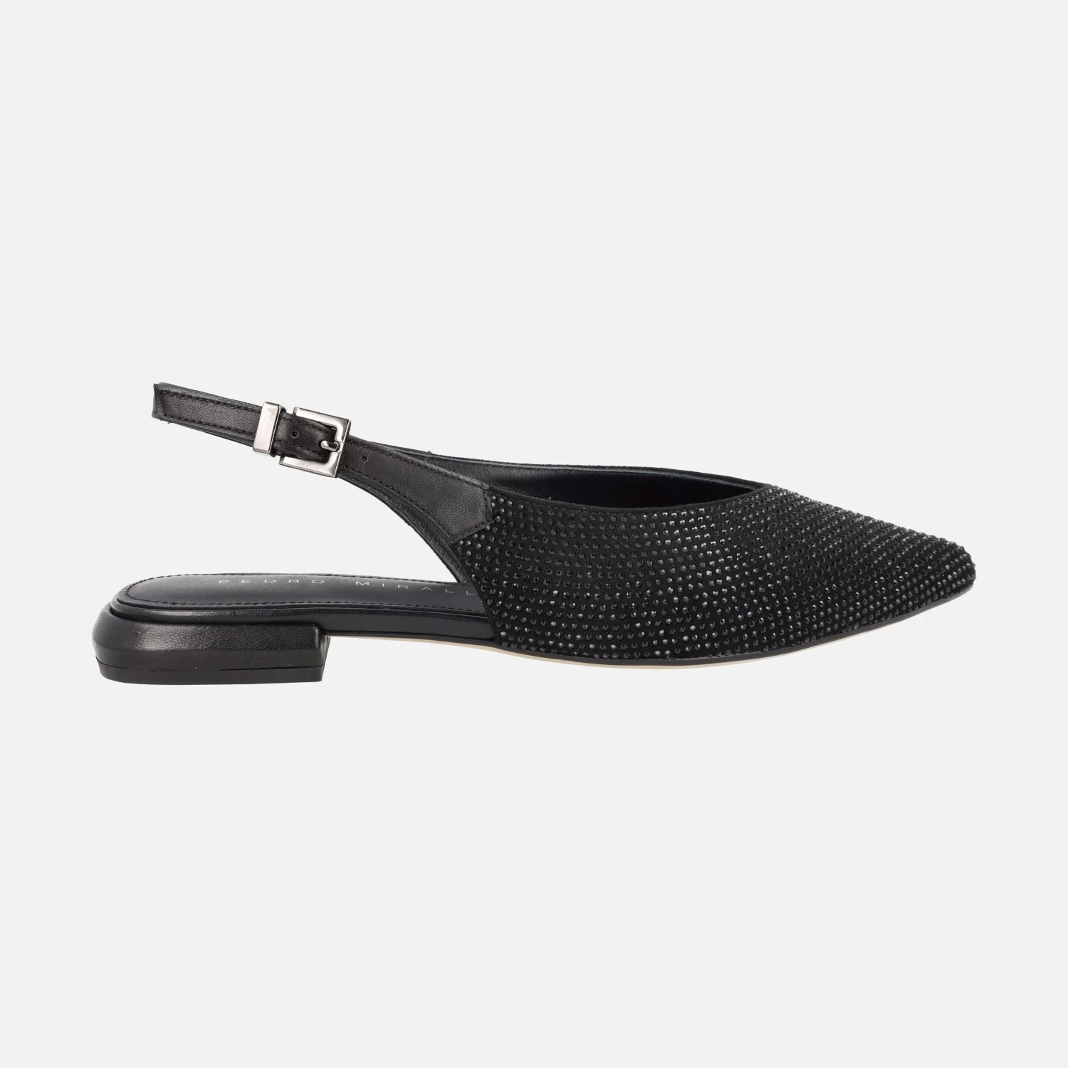 Preciosas bailarinas Pedro Miralles modelo Palma 14483 Softanil negro o beige. Bailarinas destalonadas con toda la parte delantera cubierta de strass. Tira de piel al talón con cierre de hebilla. Forro y planta de piel. Tacones bajitos, apenas 2,5 cms de altura. Made in Spain.