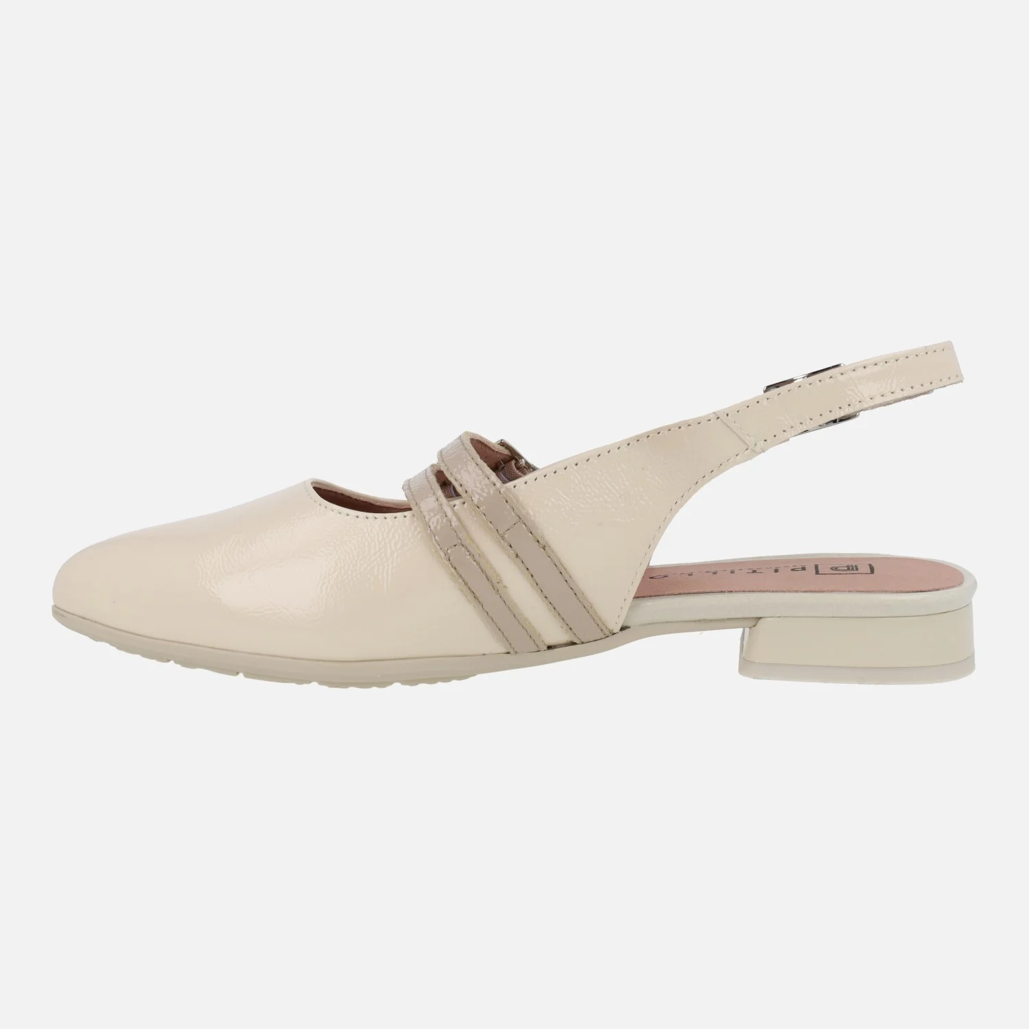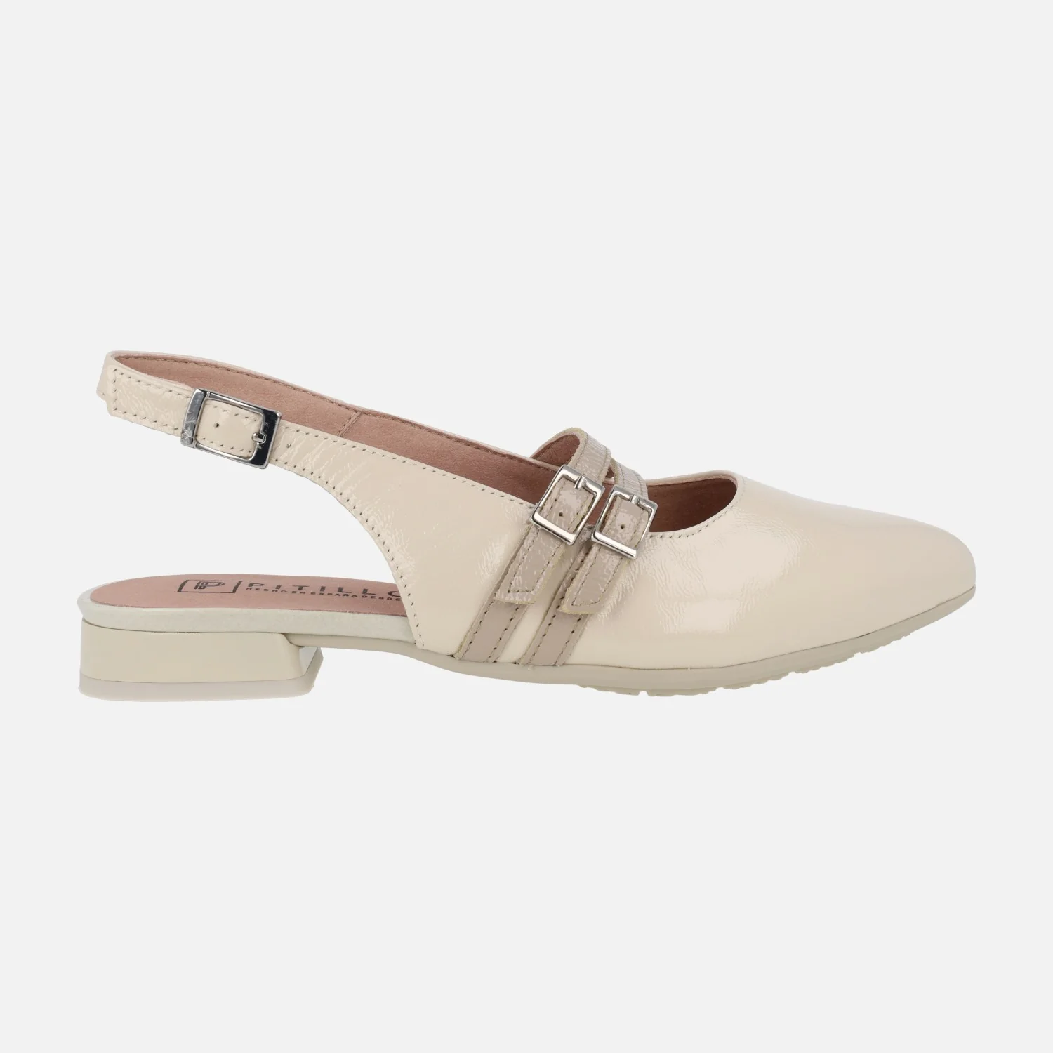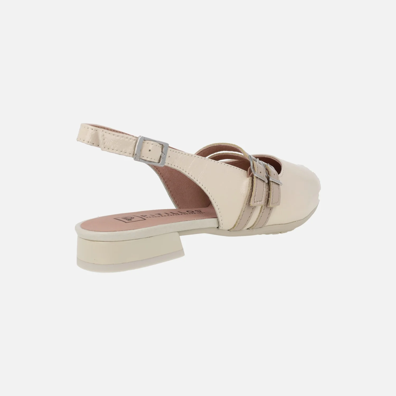 Bailarinas destalonadas para mujer de la marca Pitillos modelo 10502 crema. Bailarinas elaboradas en piel charol color crema, con dos pulseras en charol taupe cruzando el empeine, regulables con hebillas. Tira al talón con hebilla regulable. Interiores en combinado de tejido y otros materiales. Piso flexible de goma, con 2,5 cms de tacón.