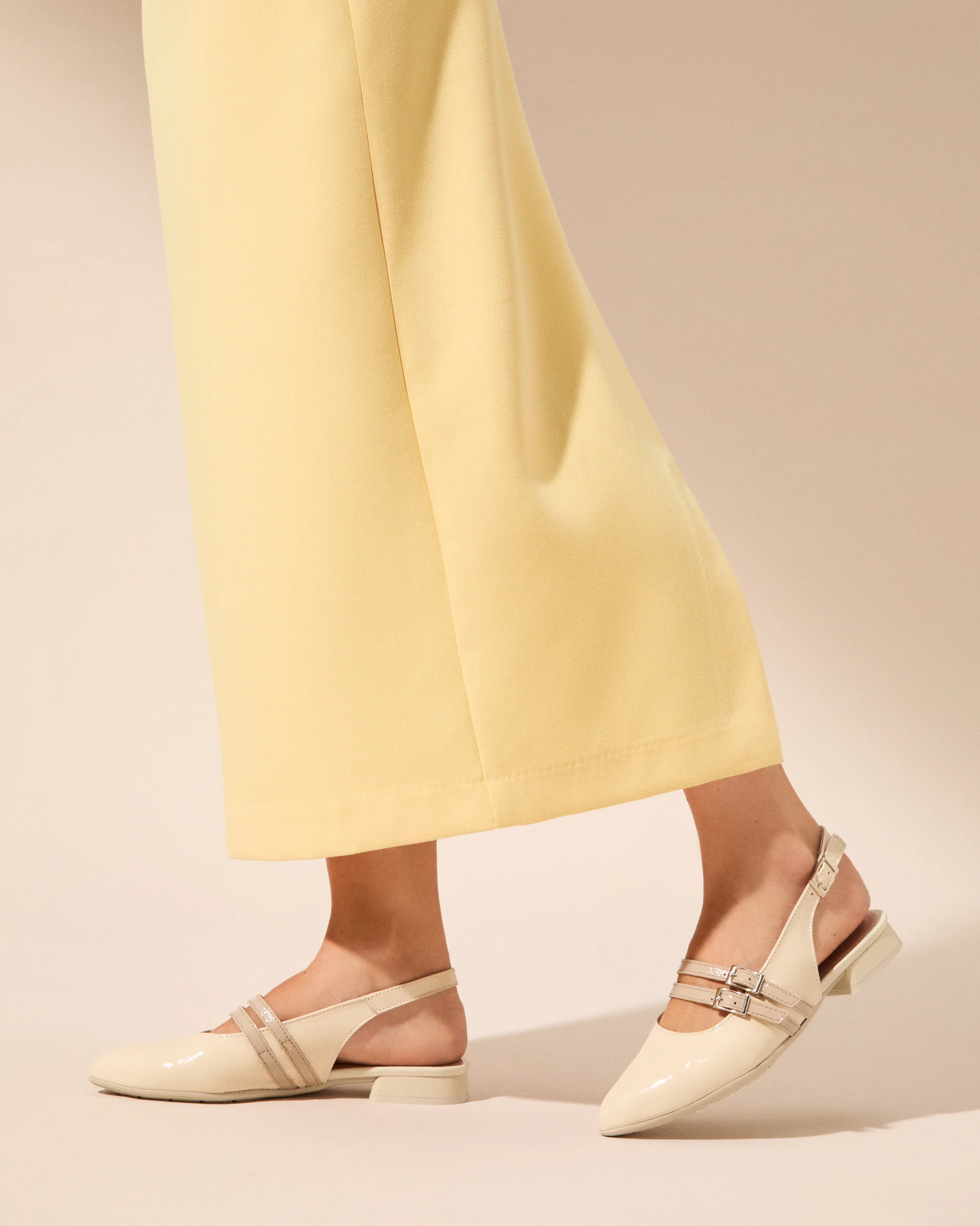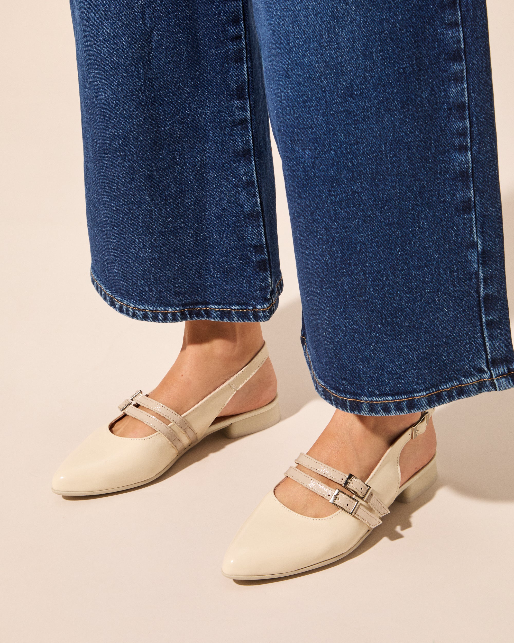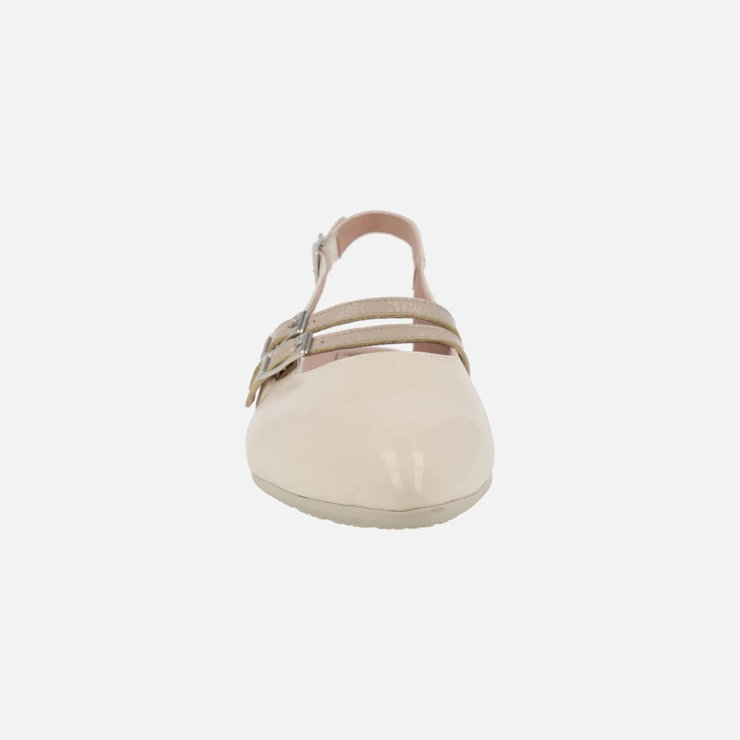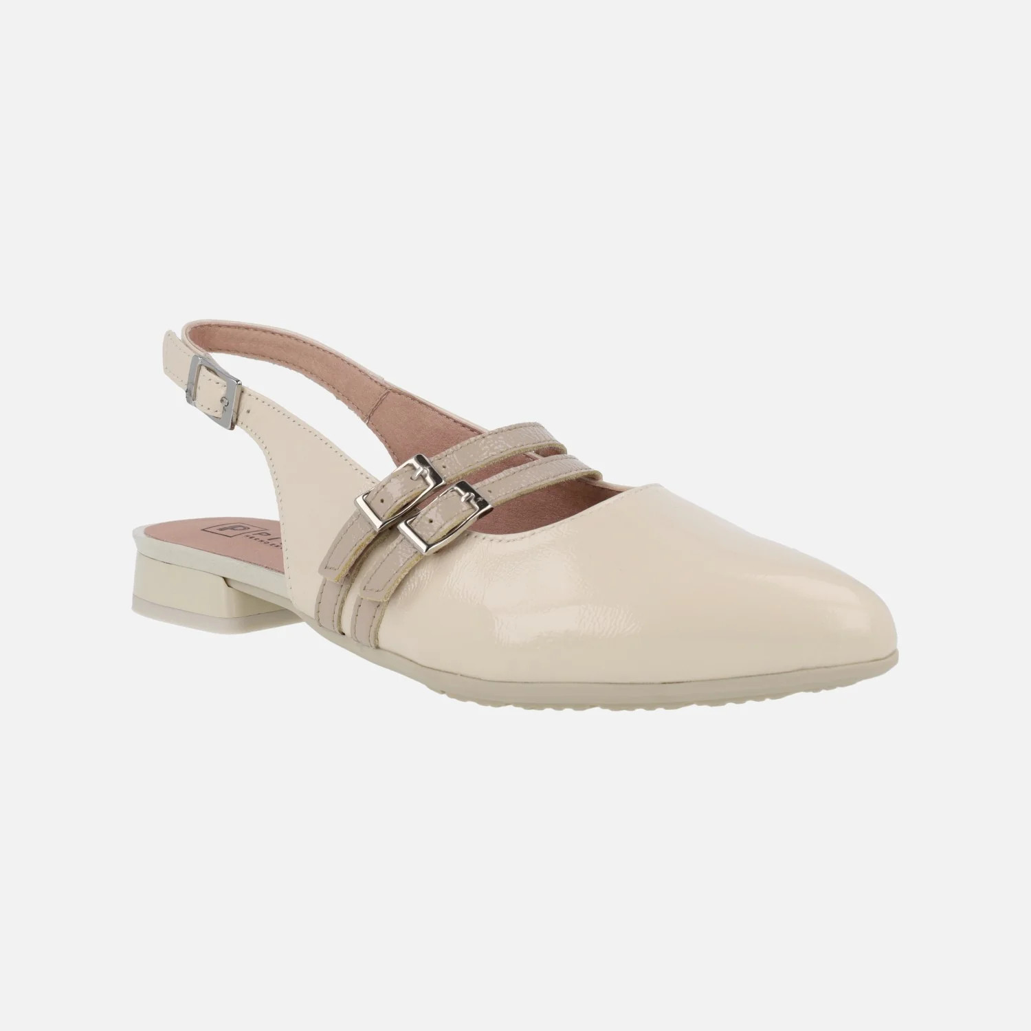 Bailarinas destalonadas para mujer de la marca Pitillos modelo 10502 crema. Bailarinas elaboradas en piel charol color crema, con dos pulseras en charol taupe cruzando el empeine, regulables con hebillas. Tira al talón con hebilla regulable. Interiores en combinado de tejido y otros materiales. Piso flexible de goma, con 2,5 cms de tacón.
