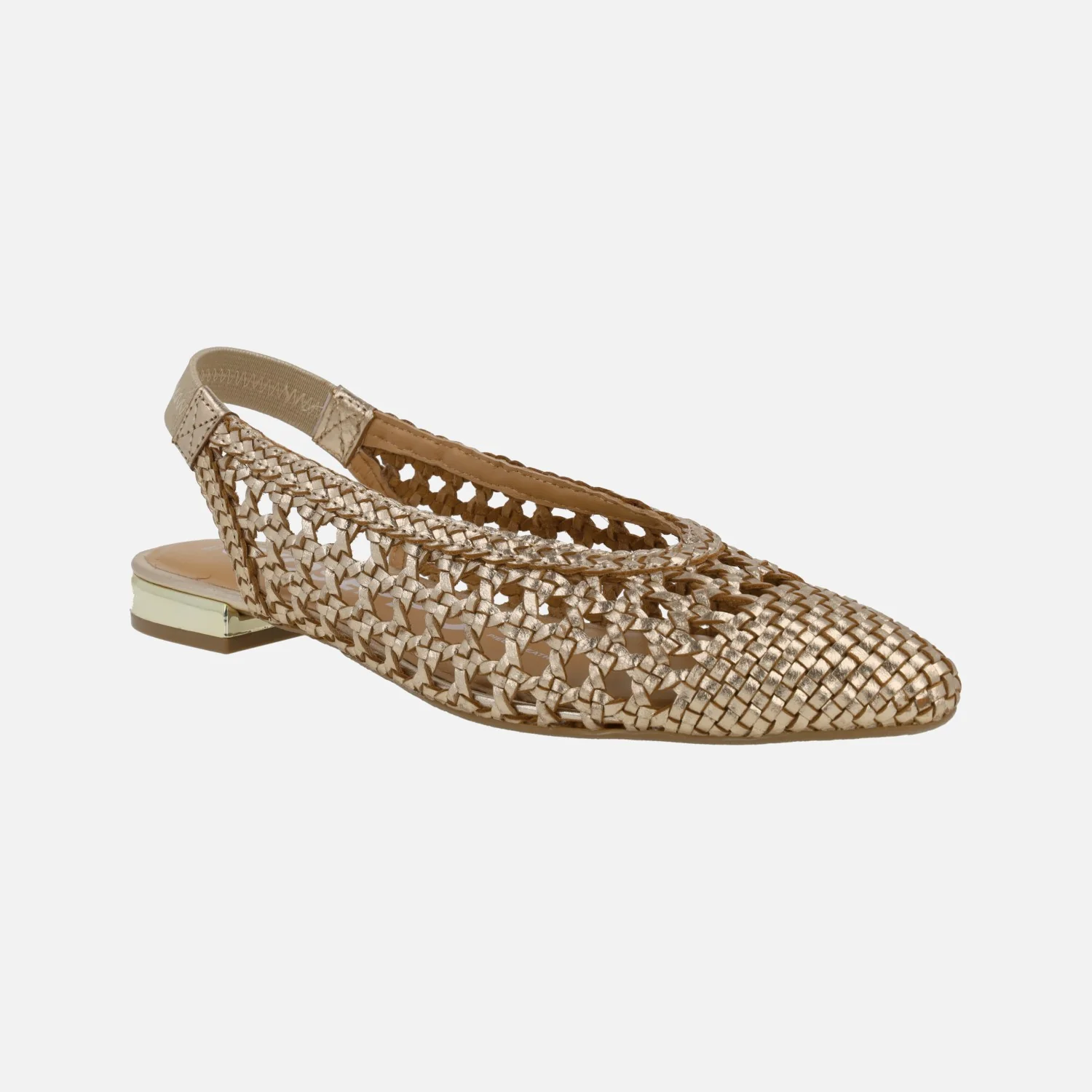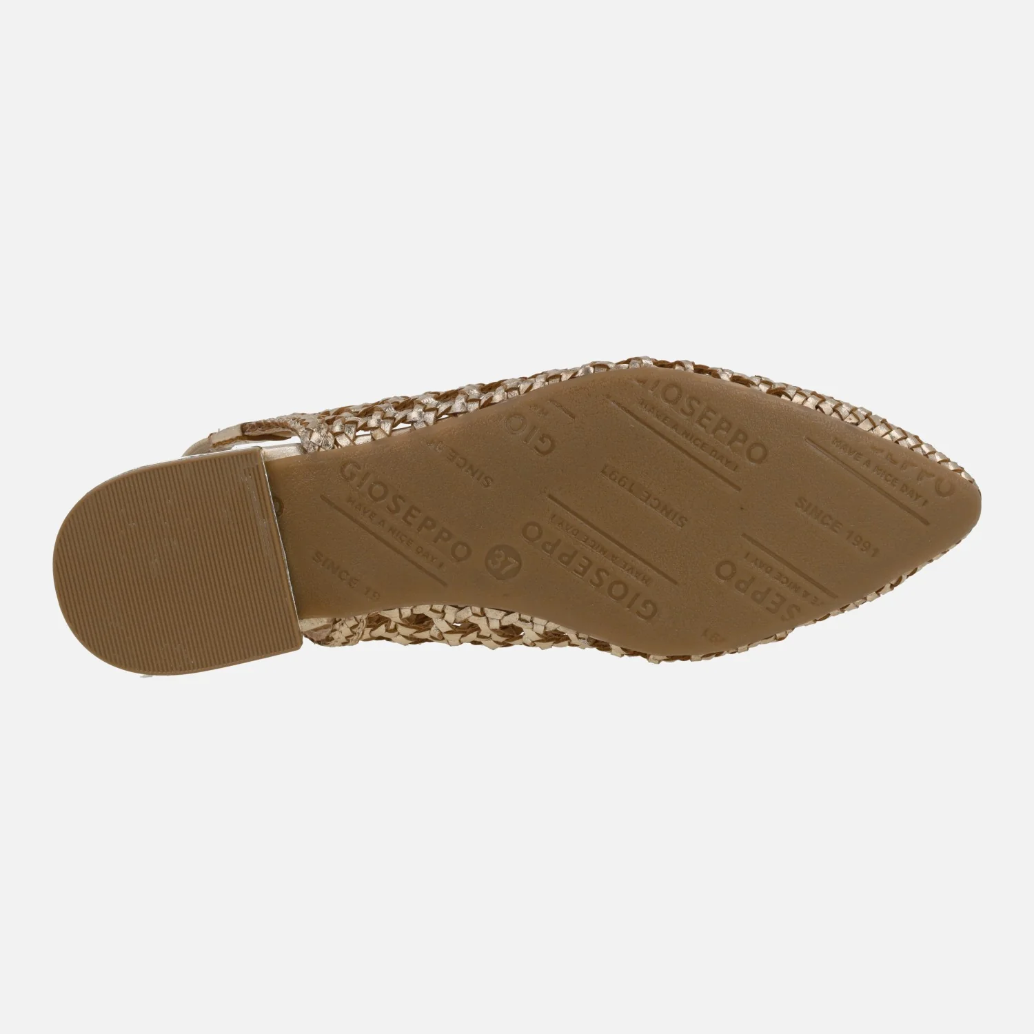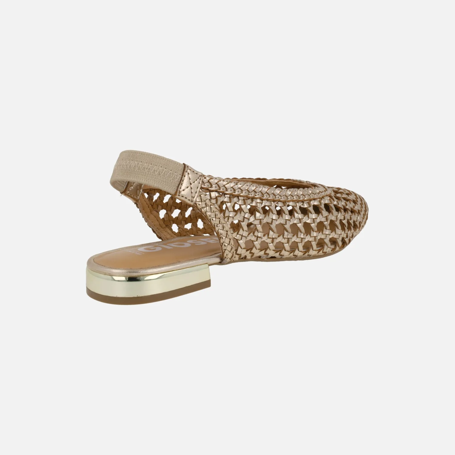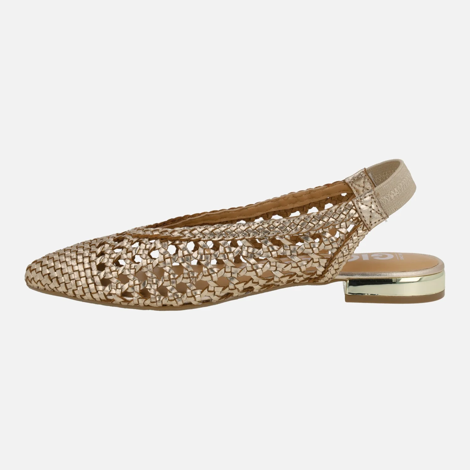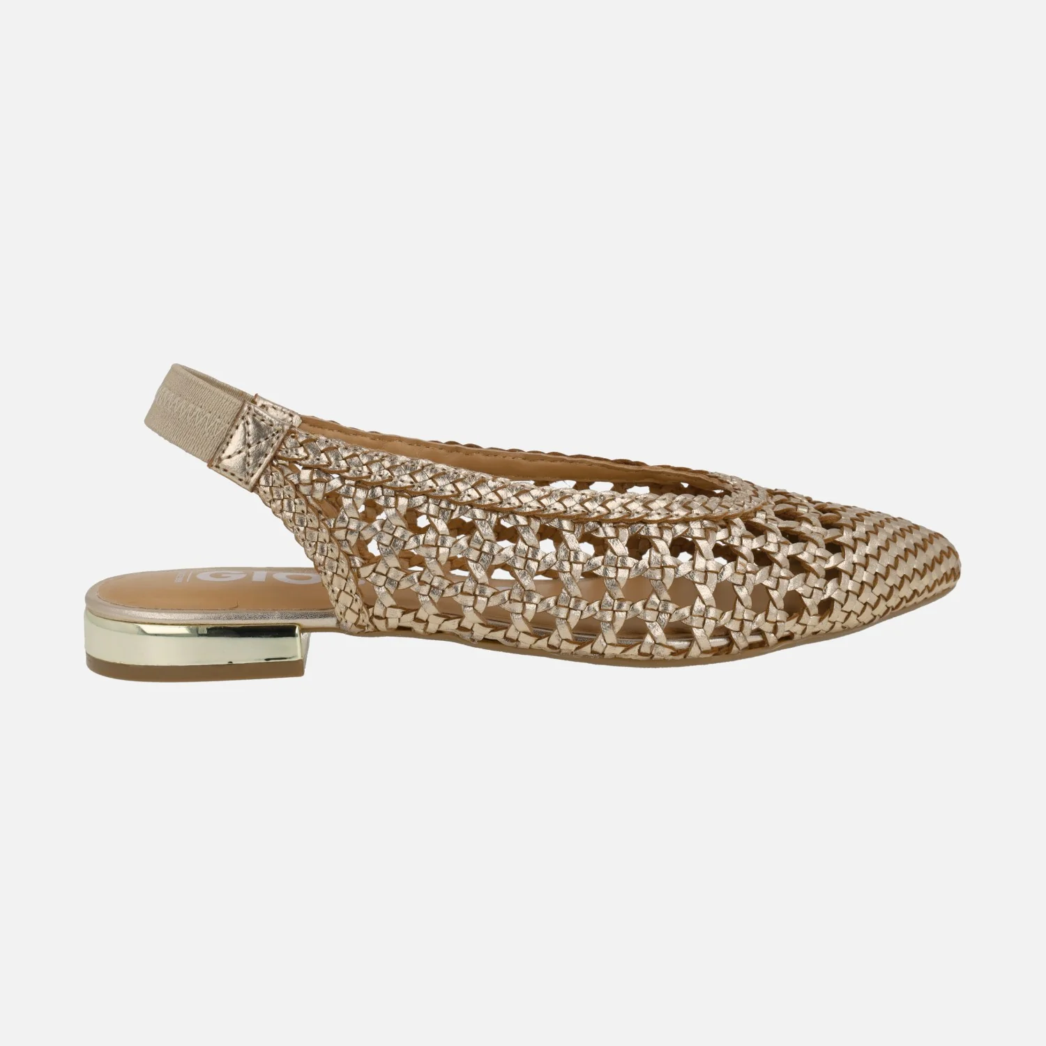 Bailarinas trenzadas de piel de la marca Gioseppo, modelo Guatavita 68238- Oro. Bailarinas destalonadas, elaboradas en piel trenzada color oro con interiores en piel. Tira al talón con elástico, para mayor sujeción. Suela sintética, con tacones bajos, de 2 cms de altura.